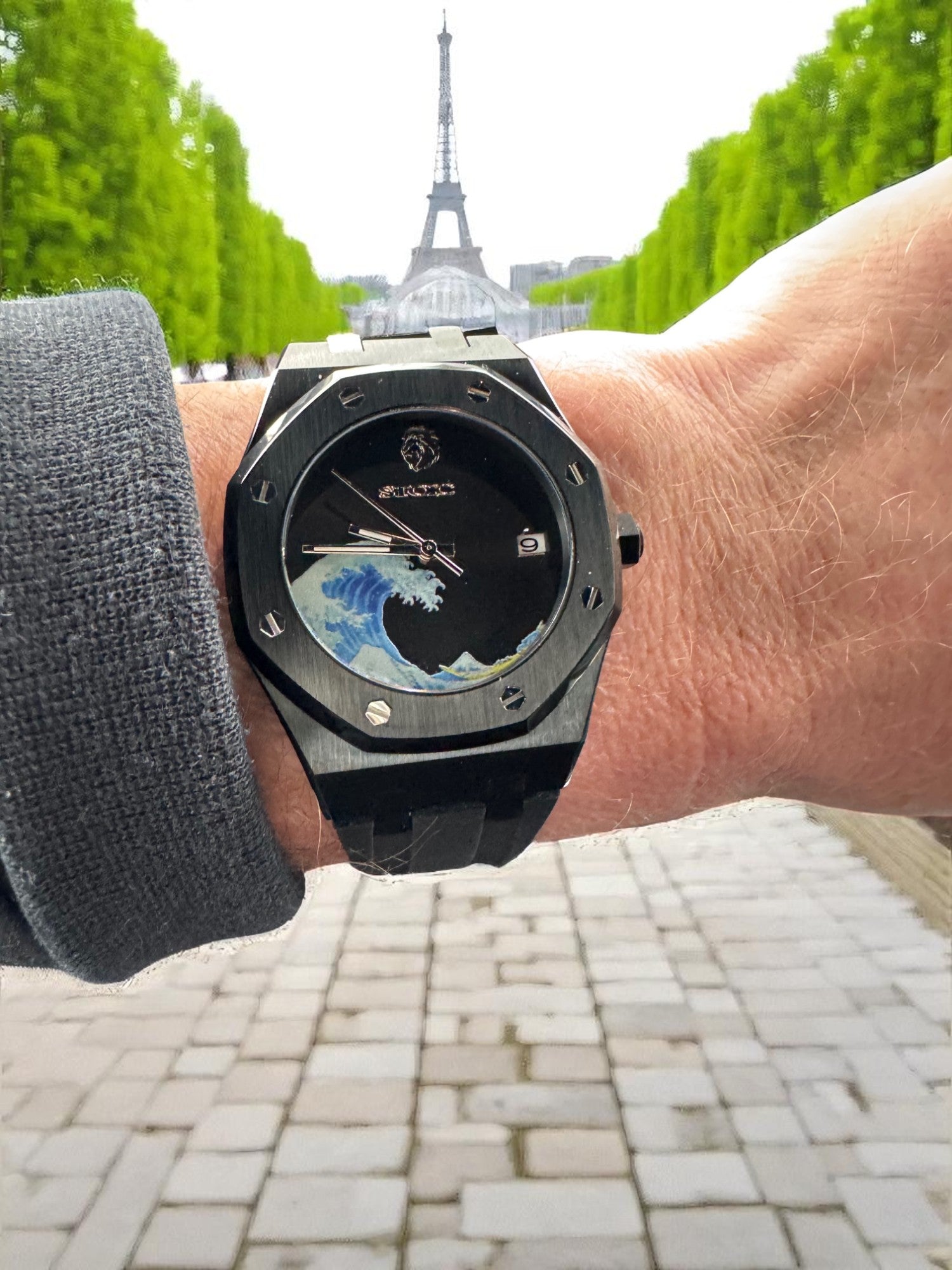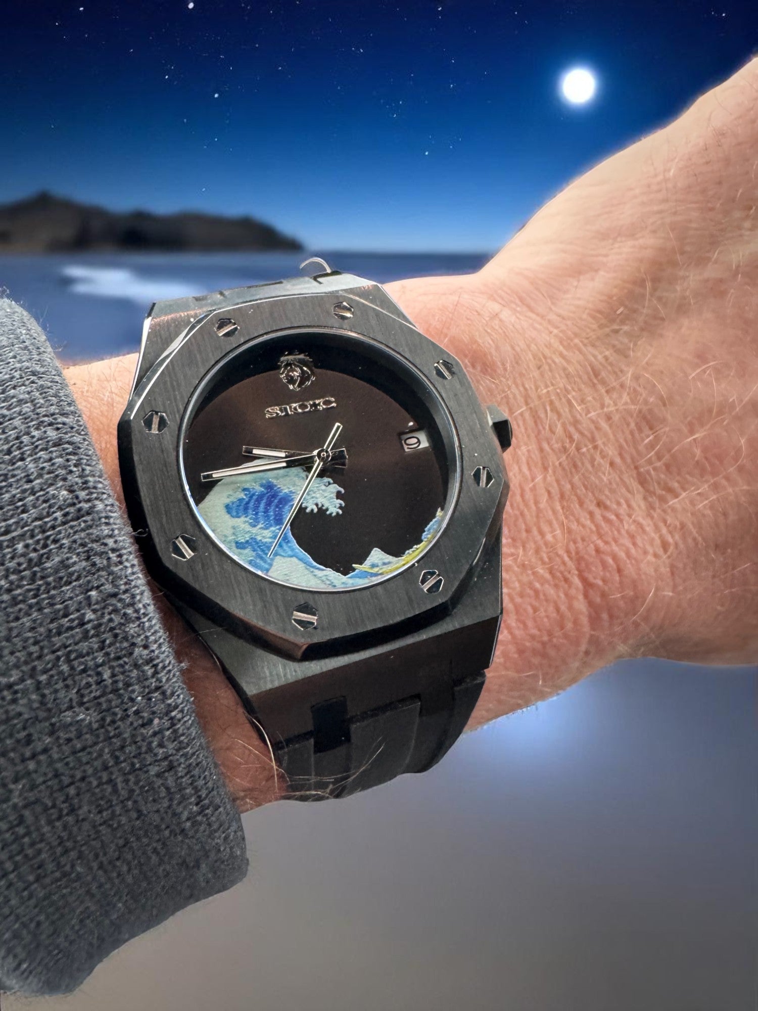 The Aegis Shadow is the modern embodiment of stoic armor—elegant, enduring, and unapologetically bold. Its integrated case and bracelet, forged from black 904L stainless steel, flow together in seamless unity, mirroring the harmony of mind and body pursued by the Stoic ideal. The matte black dial is punctuated with steel indices and crimson accents, striking a balance between restraint and resolve.