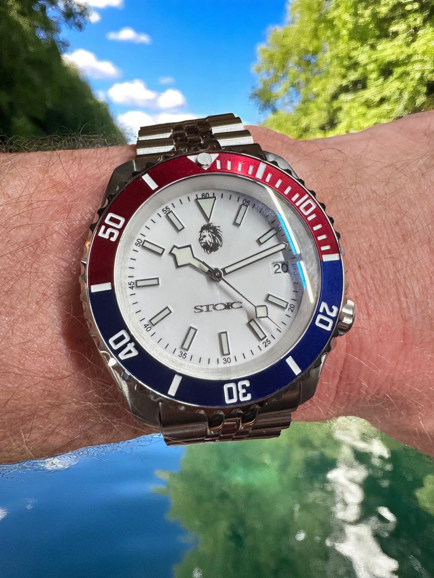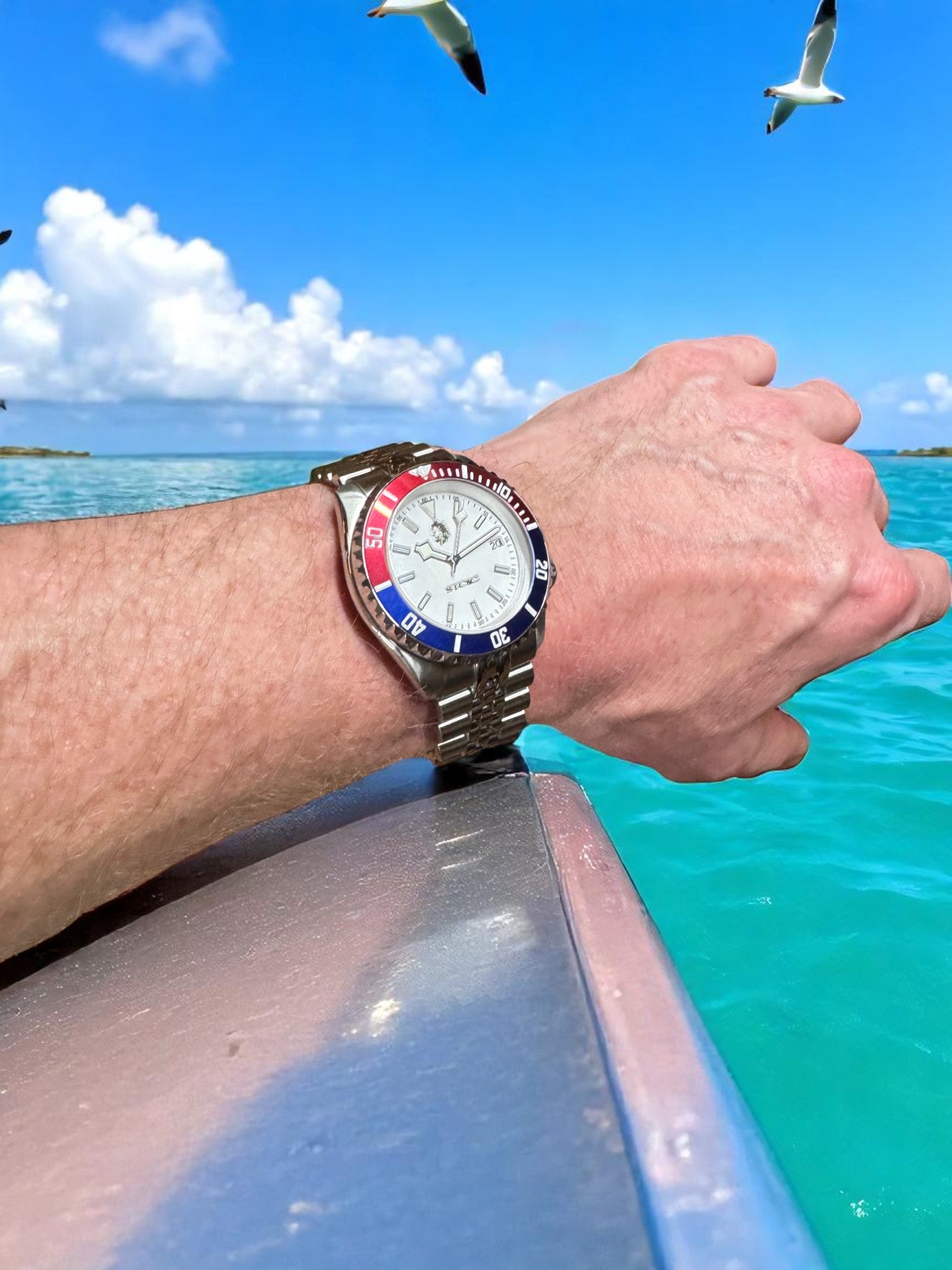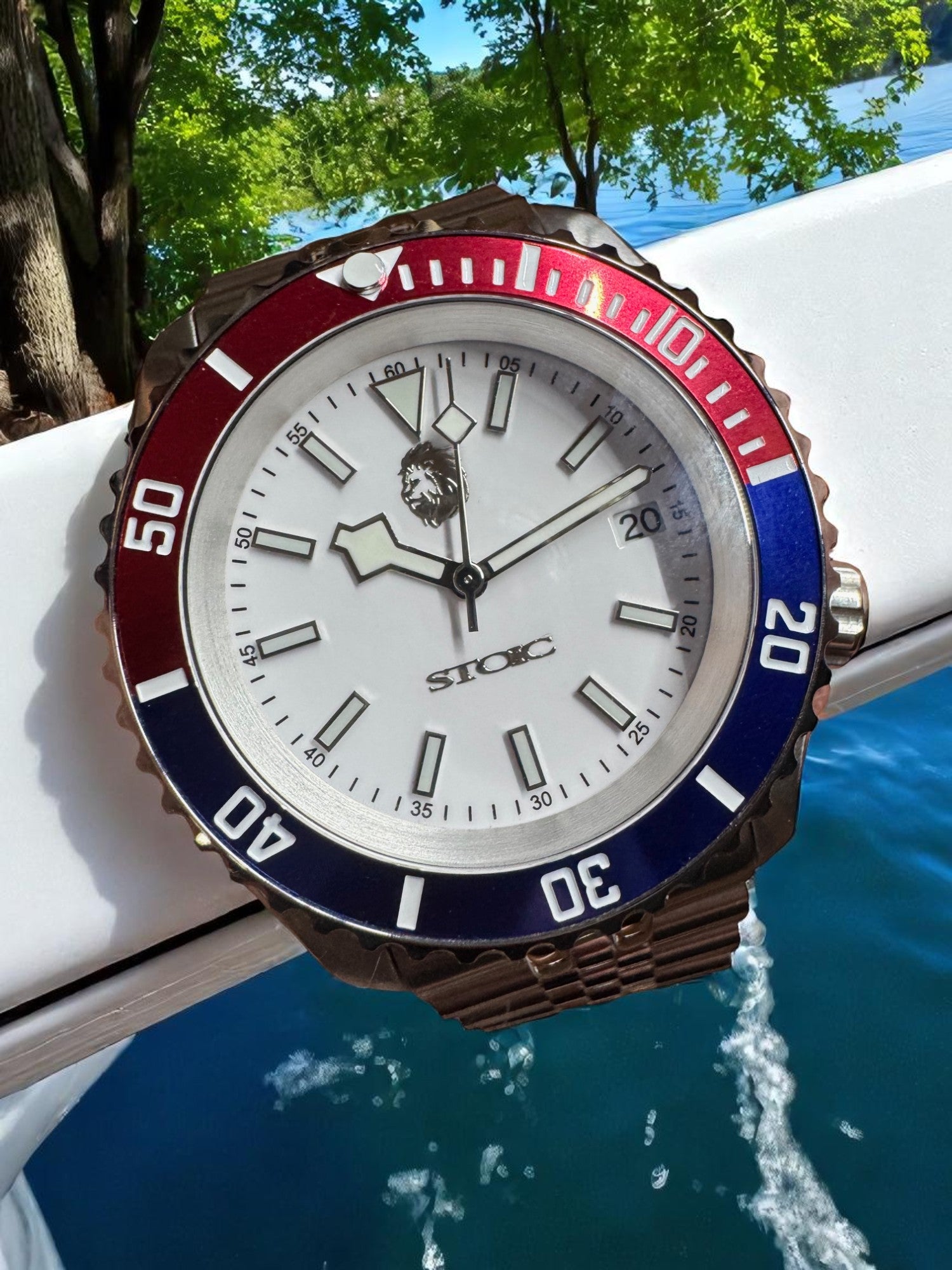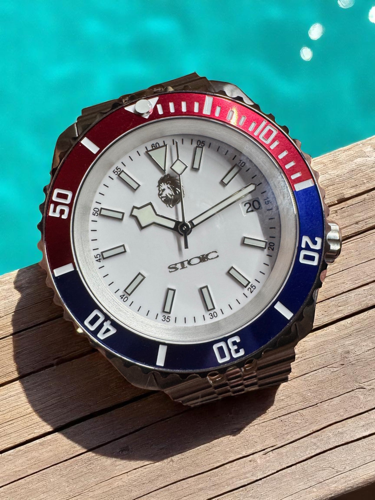 The Aether captures the essence of clarity, elevation, and unwavering presence. With a crisp white dial framed by a bold red and blue bezel, this timepiece embodies the balance of action and reflection—a tribute to the Stoic who moves with both intensity and discipline.