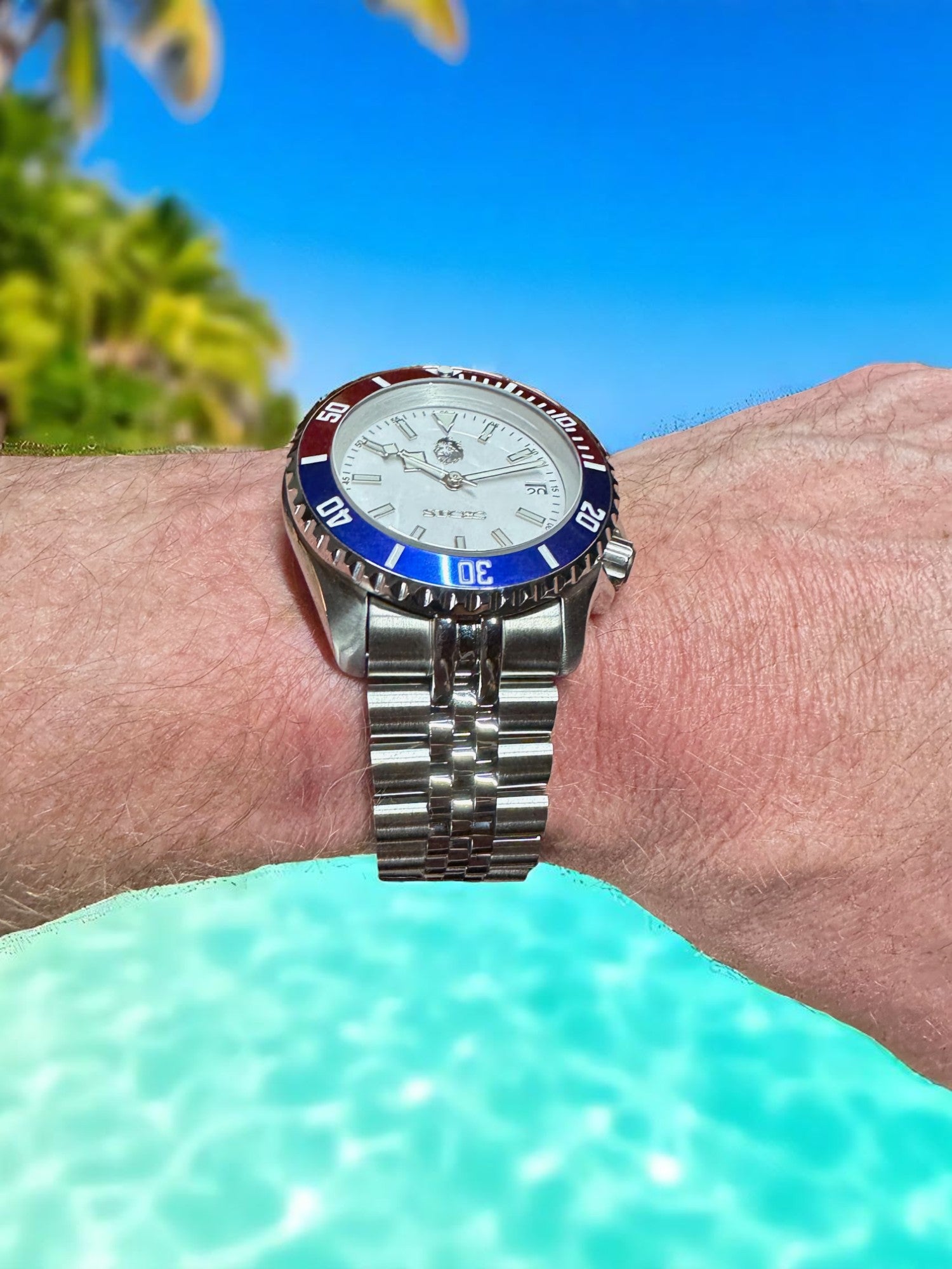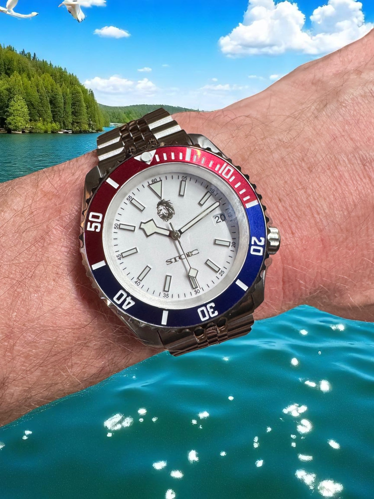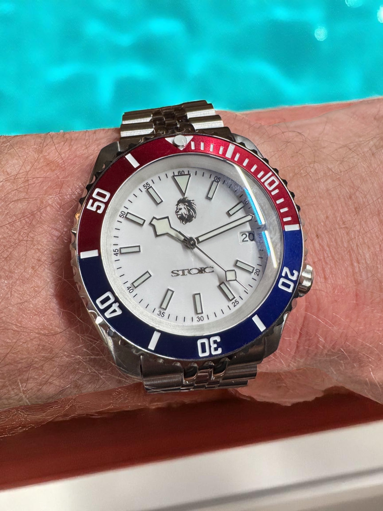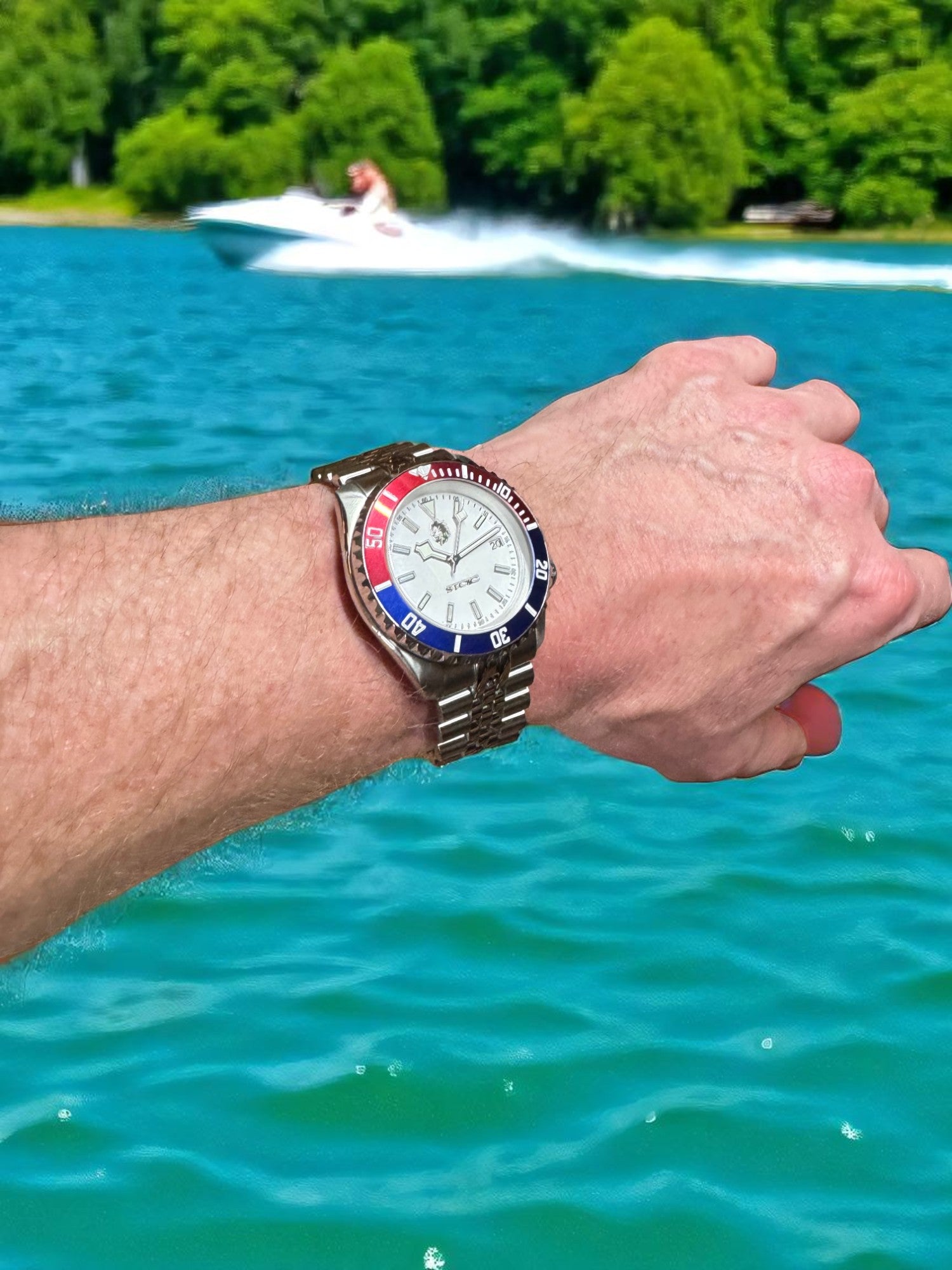 The Aether captures the essence of clarity, elevation, and unwavering presence. With a crisp white dial framed by a bold red and blue bezel, this timepiece embodies the balance of action and reflection—a tribute to the Stoic who moves with both intensity and discipline.