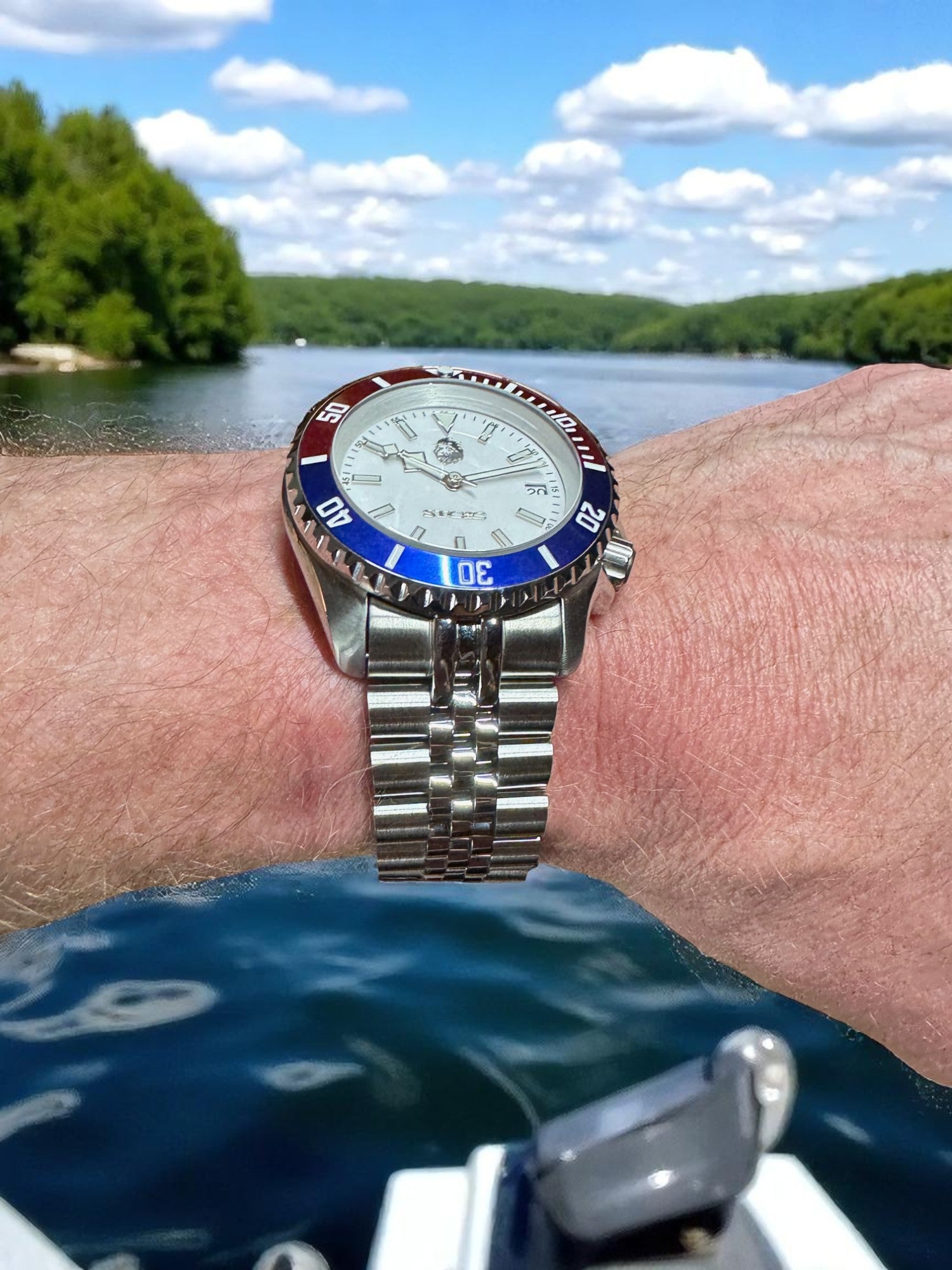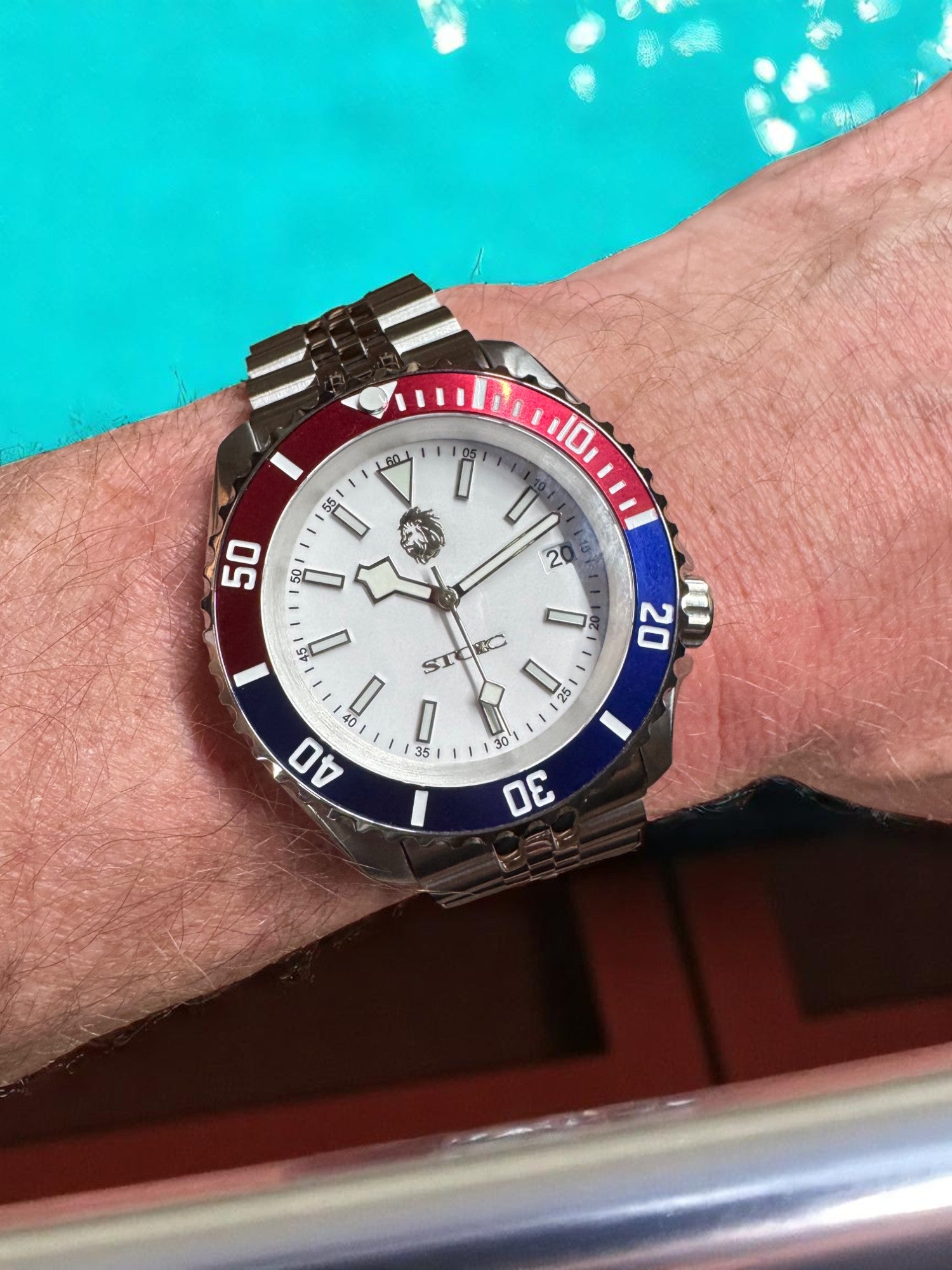 Bezel: Red & Blue bi-color ceramic, 60-minute scale