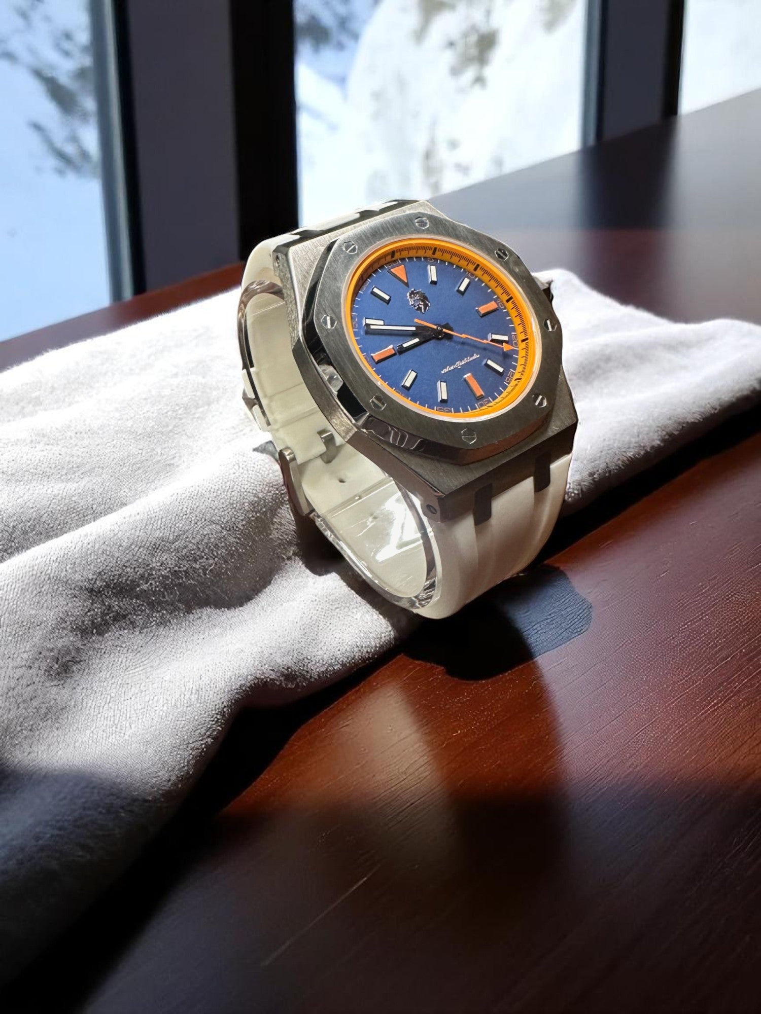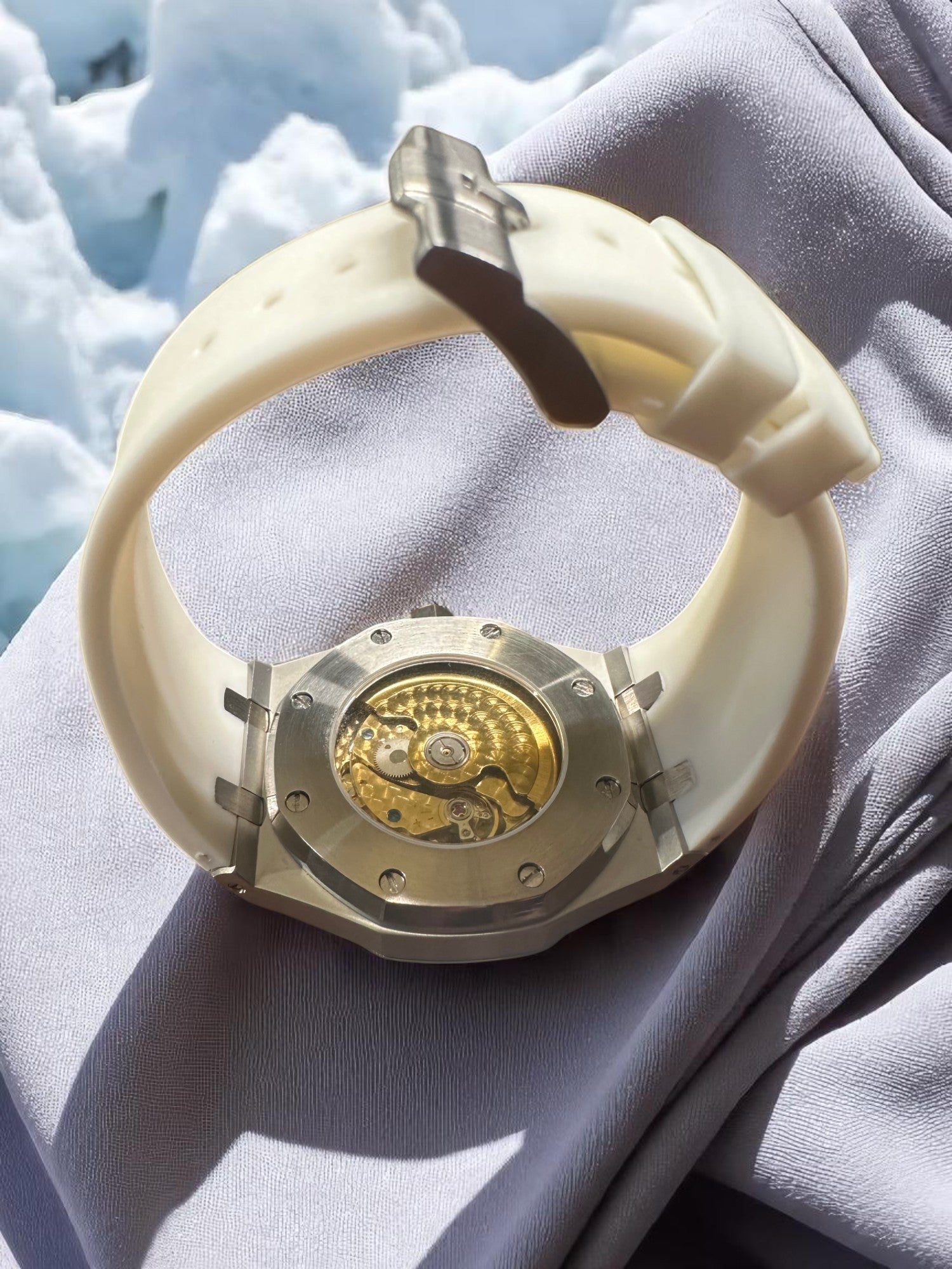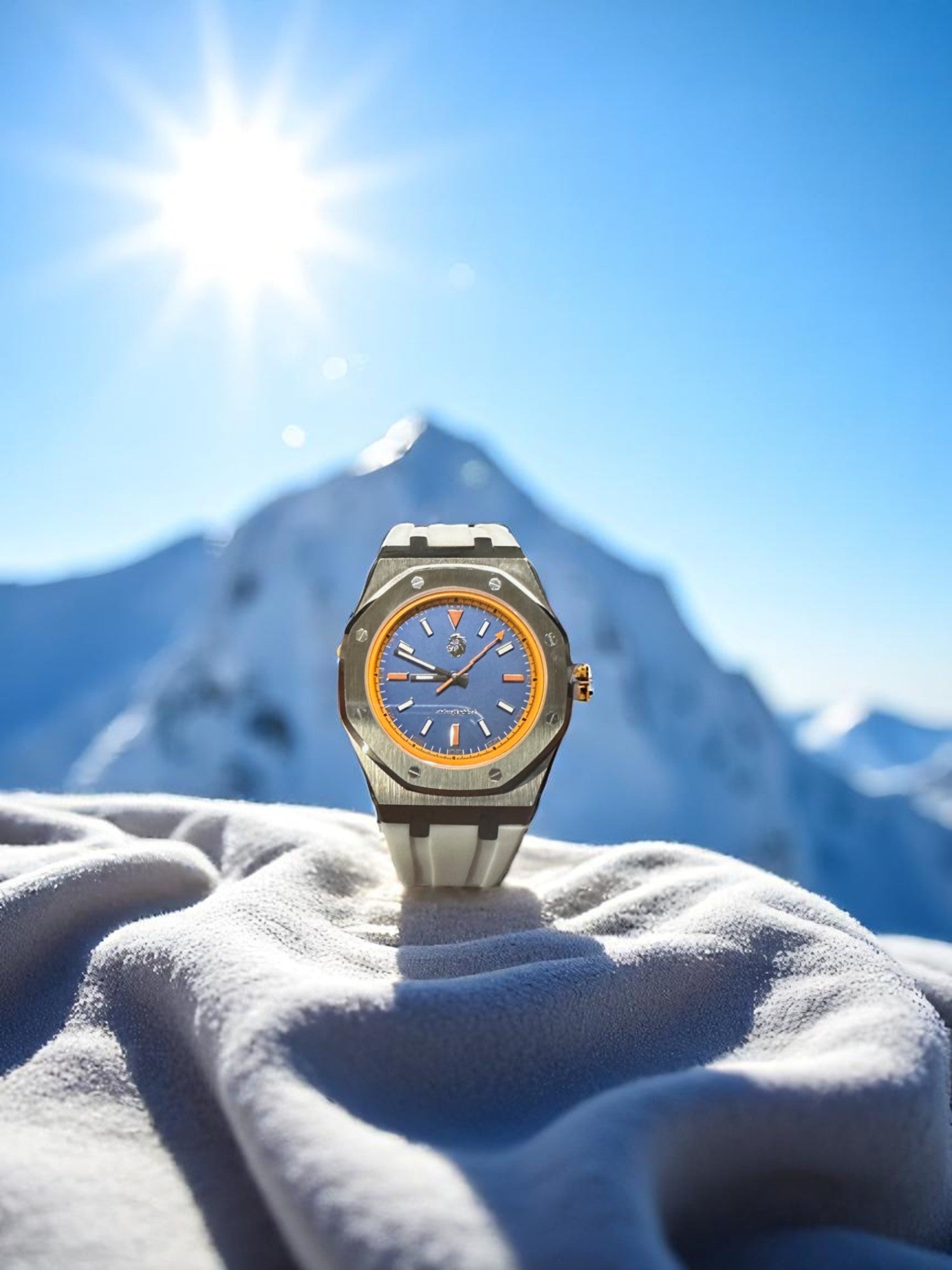 The integrated white strap ensures all-day comfort, whether navigating snowcaps or urban peaks. Powered by a mechanical heart and sealed beneath sapphire glass, the Altum is a companion for those who ascend with discipline, not bravado.