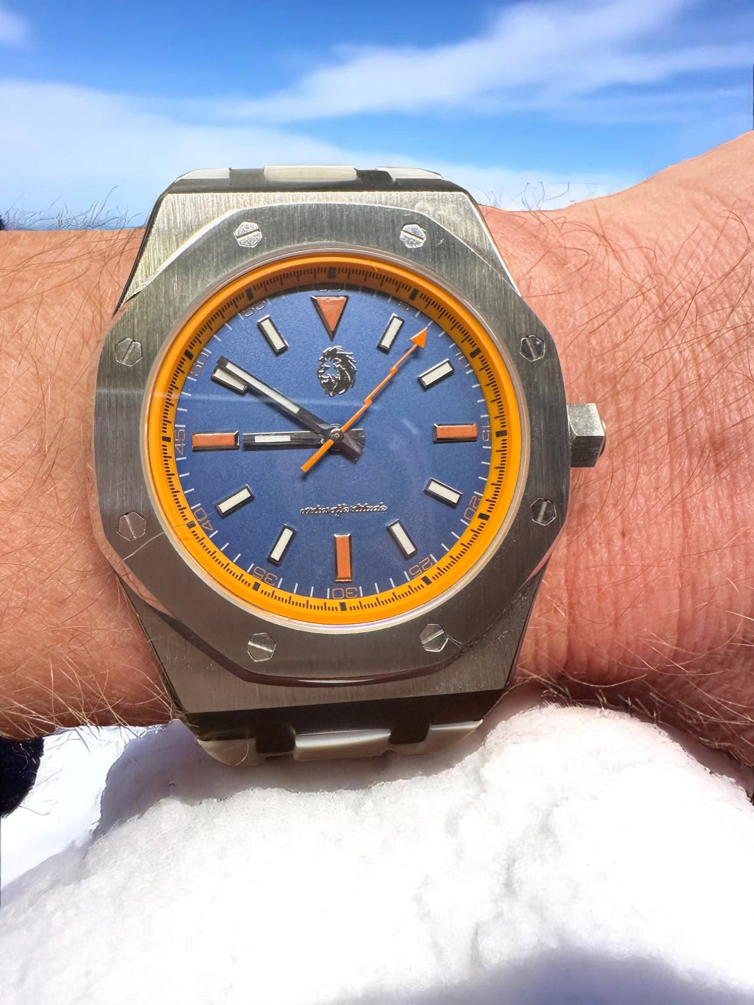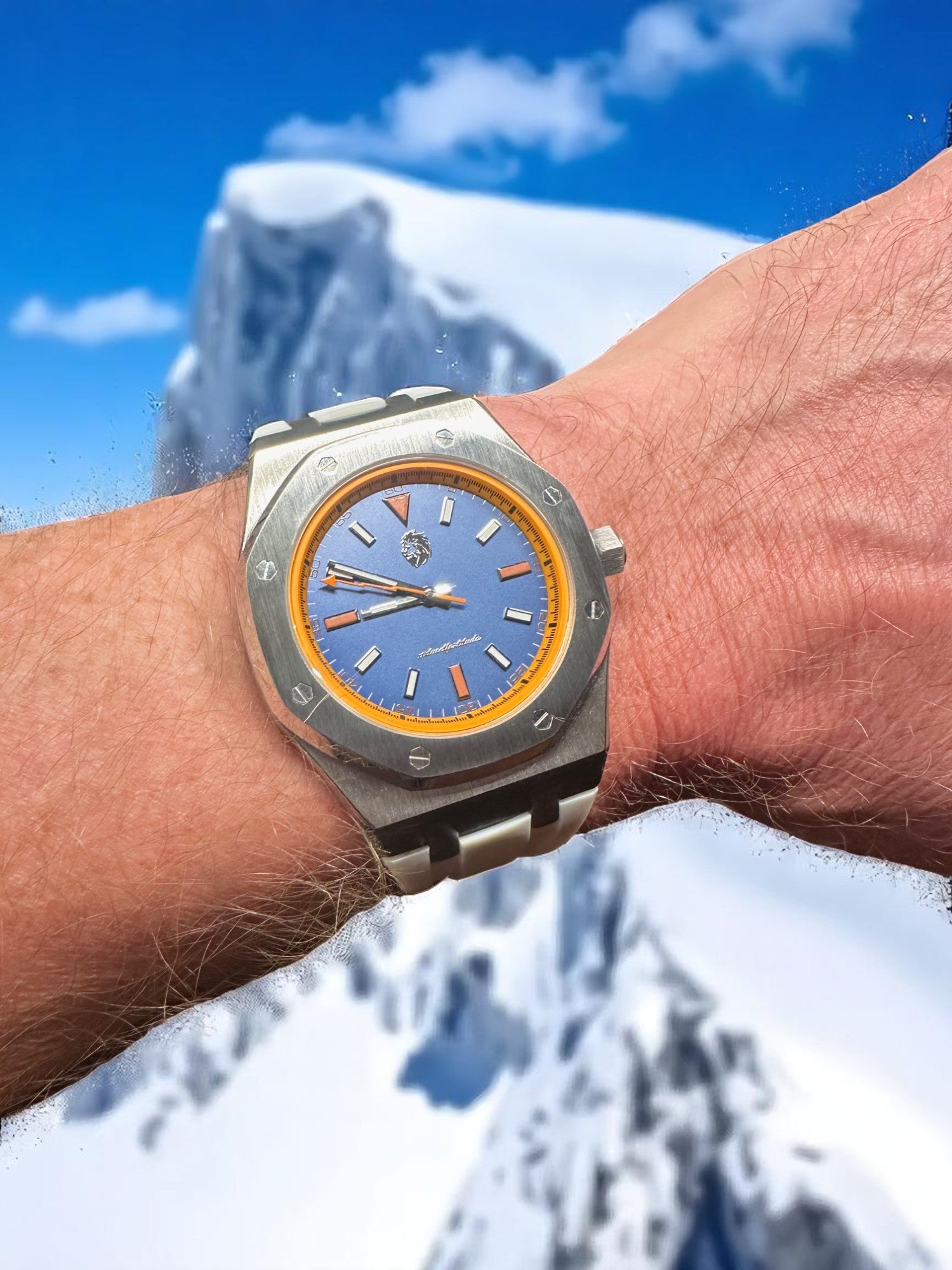 The Altum was forged for altitude—where oxygen thins, silence deepens, and clarity reigns. Featuring a brushed stainless steel octagonal case, radiant glacier-blue dial, and vivid orange chapter ring, this piece is designed to perform at the edge while reflecting the Stoic mindset: remain composed, even in extremes.