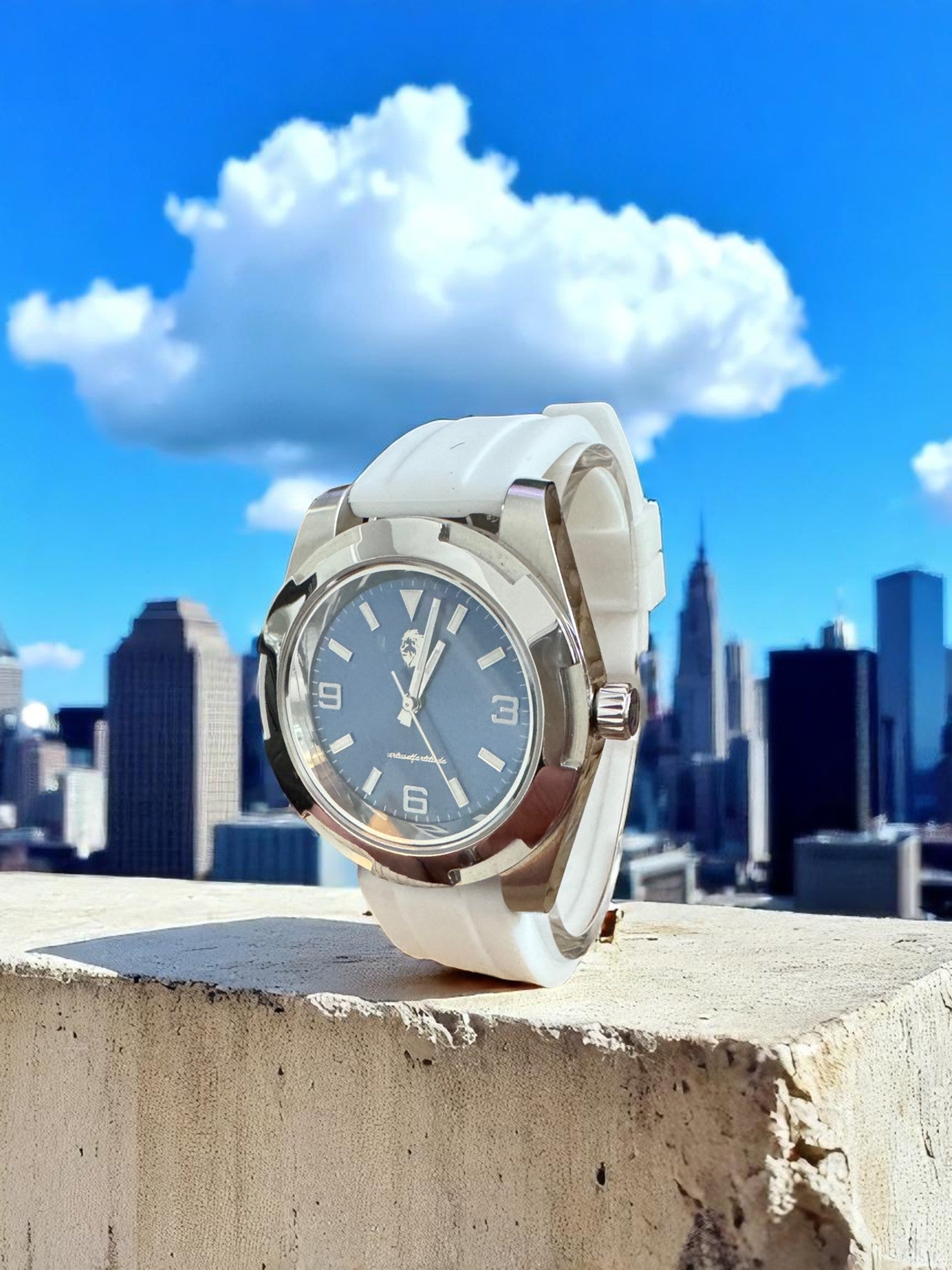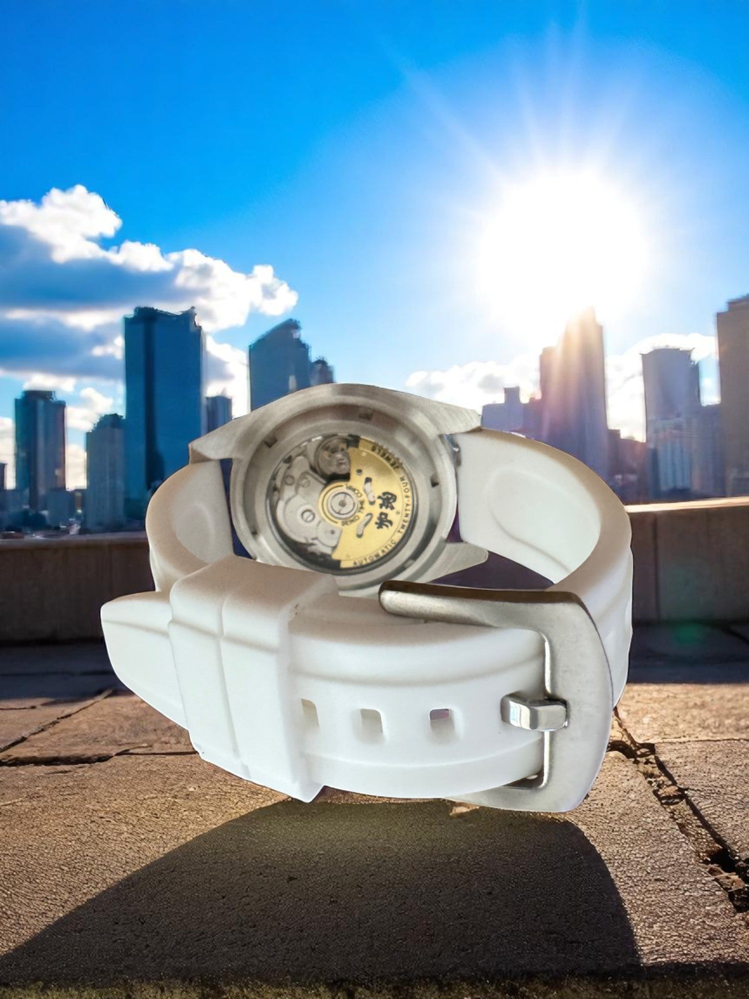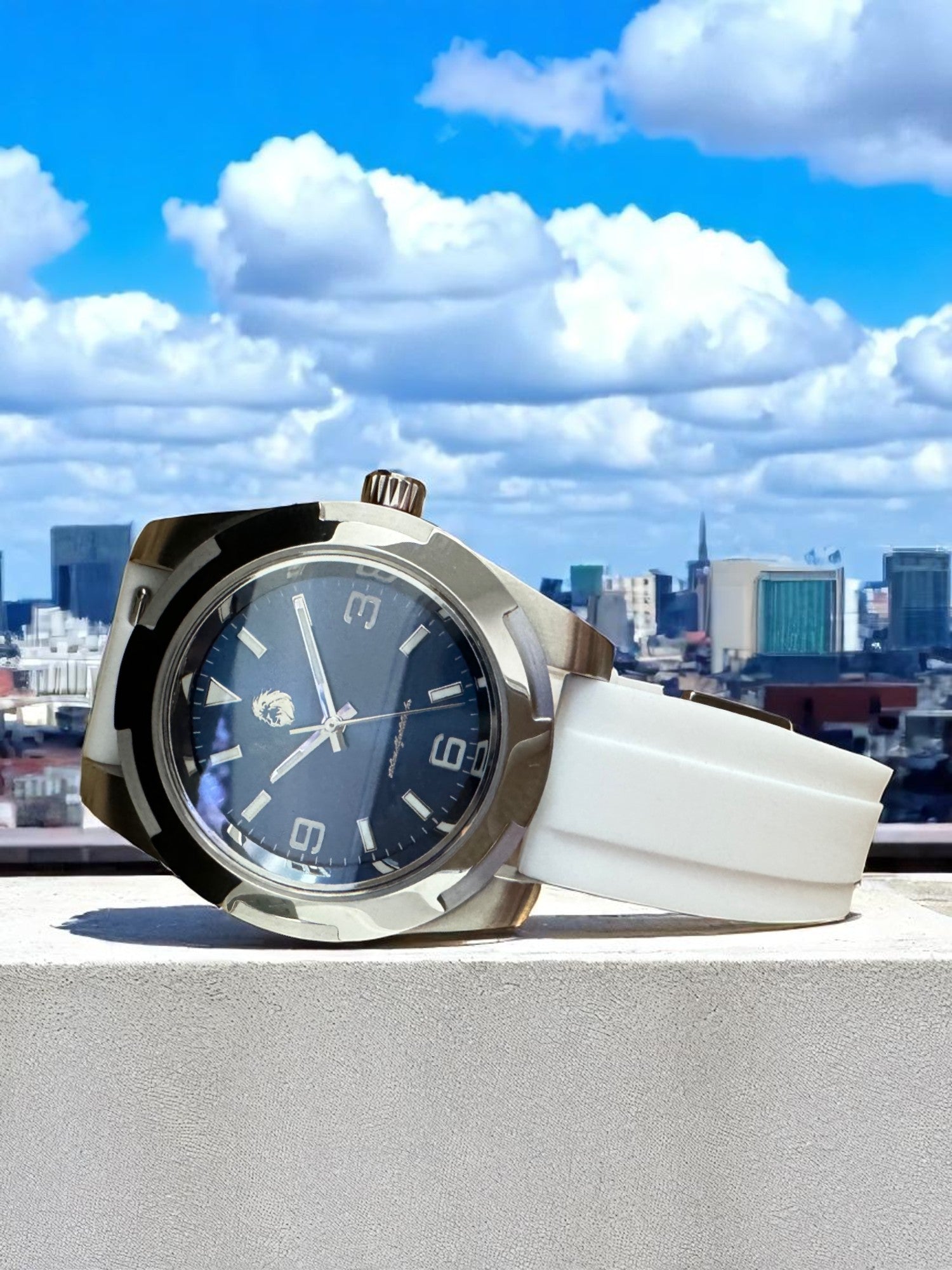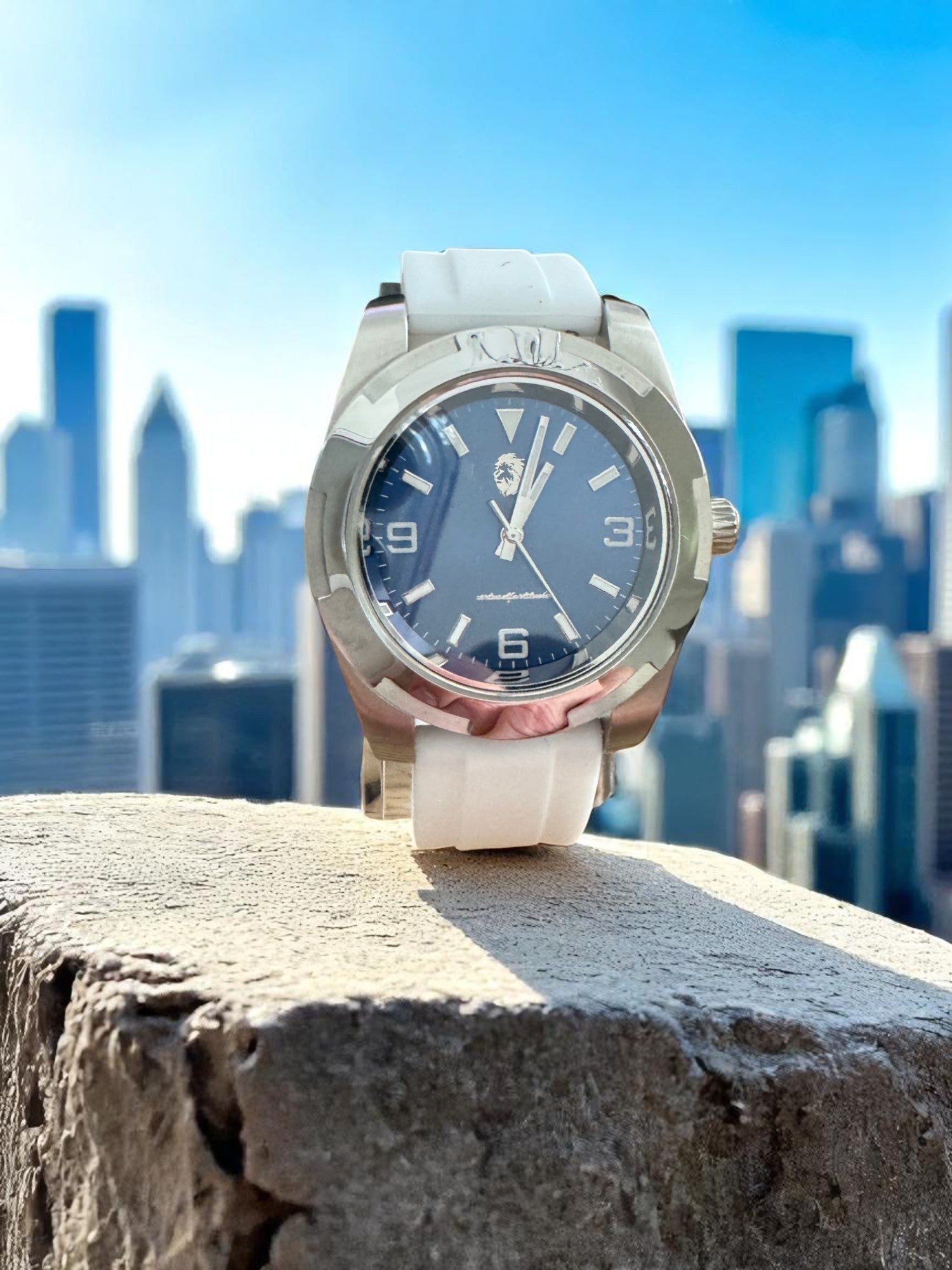 Bold. Balanced. Unapologetically modern. The Stoic Ascendant is a tribute to those who rise with discipline and clarity, no matter the skyline or storm. With its minimalist black dial, polished indices, and iconic Stoic lion emblem at 12 o’clock, this piece exudes quiet strength. The oversized numerals at 3, 6, and 9 create a strong visual rhythm, while the stark white rubber strap gives it a fresh, urban edge—ready to go from boardroom to rooftop in one seamless motion.