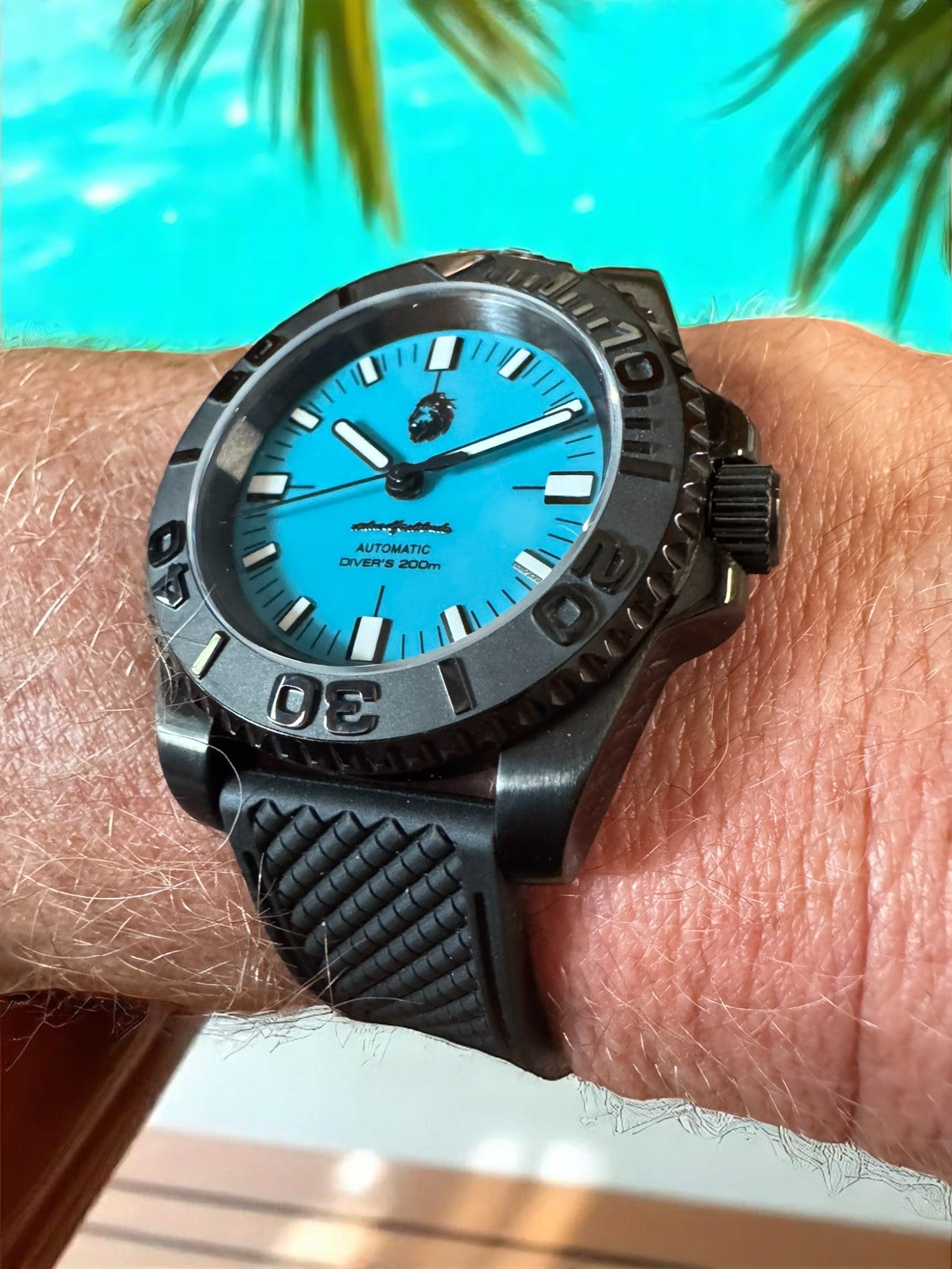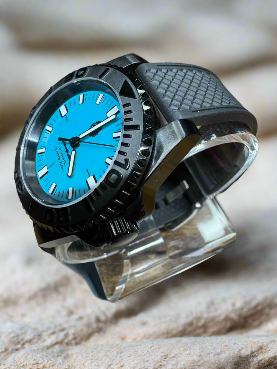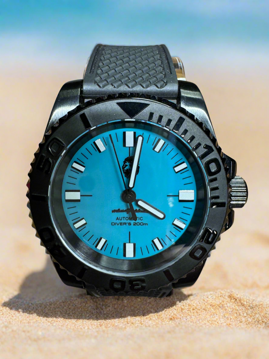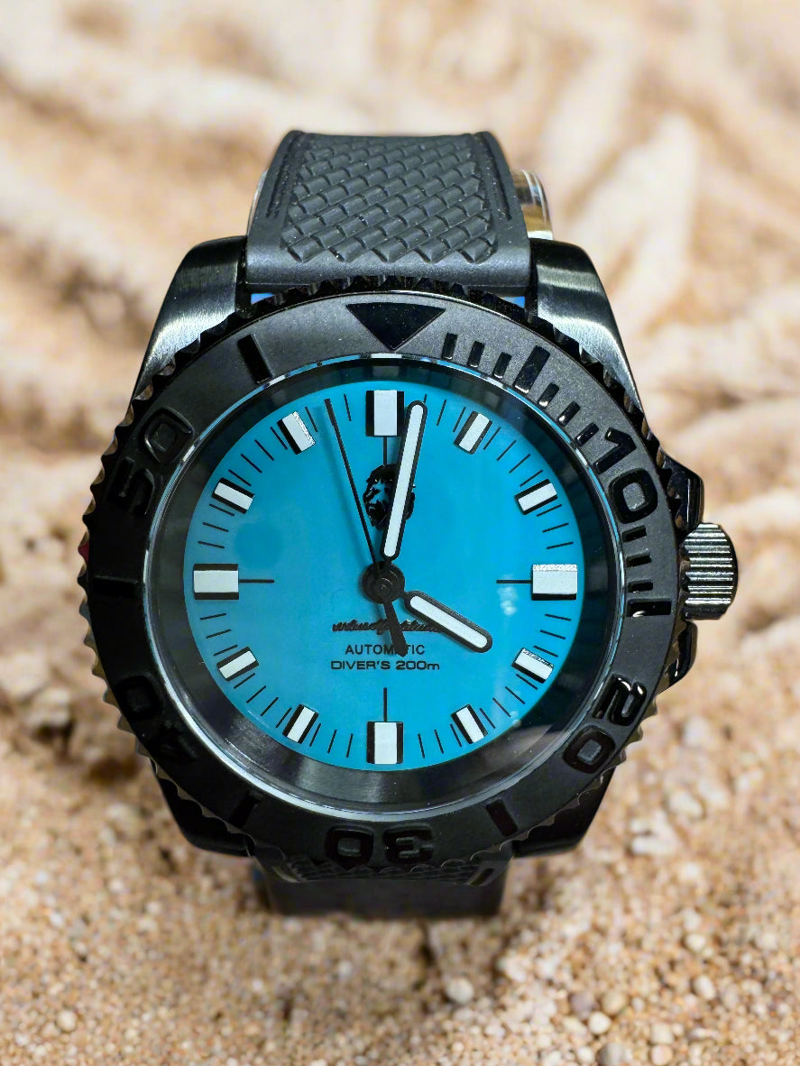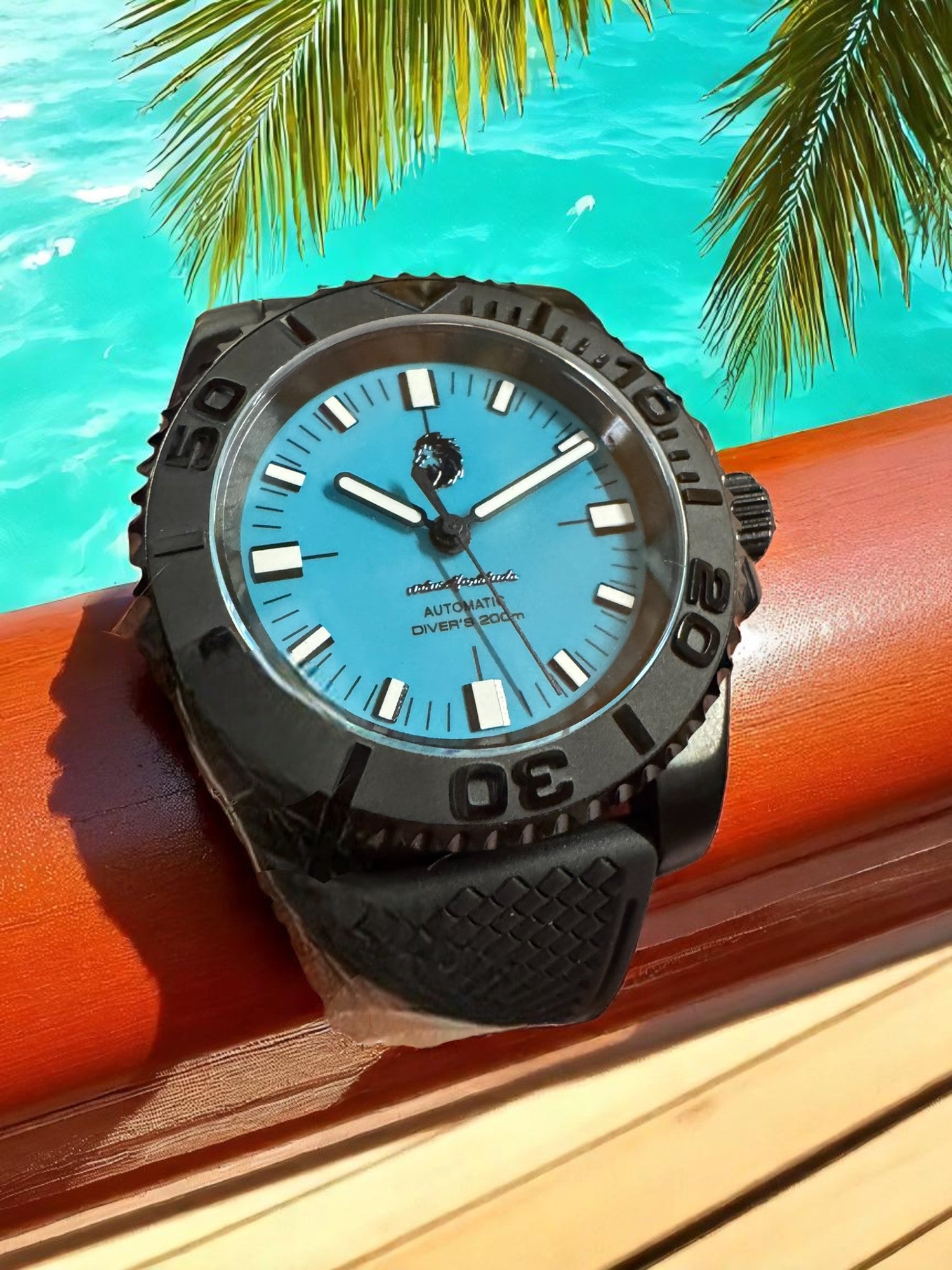 Crafted with a rugged black PVD-coated case and a unidirectional dive bezel, this automatic diver is as functional as it is fearless. With 200 meters of water resistance, luminous hands and indices, and a textured FKM rubber strap, it’s built to endure — whether diving reefs or navigating routine.
