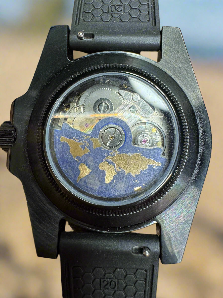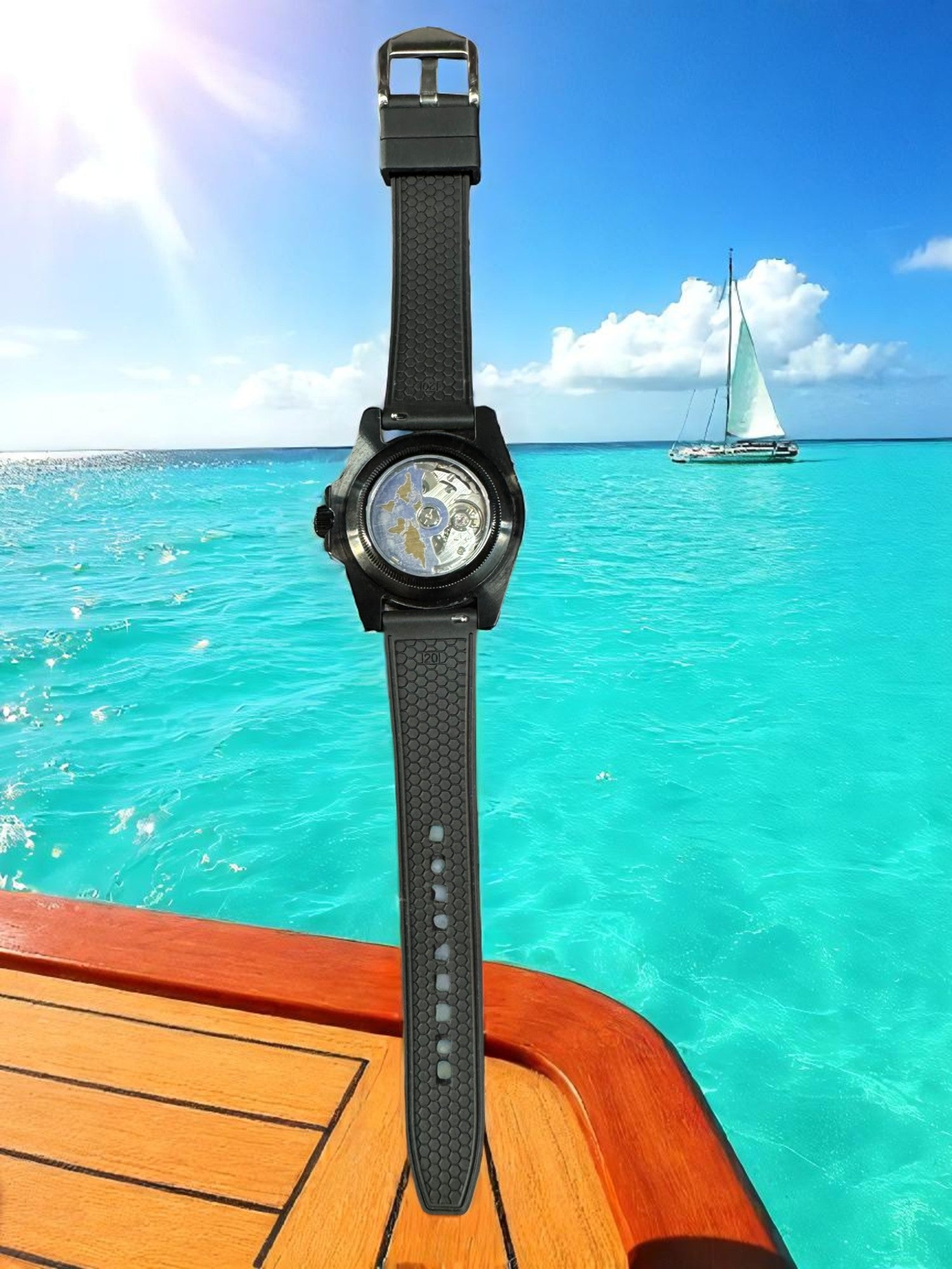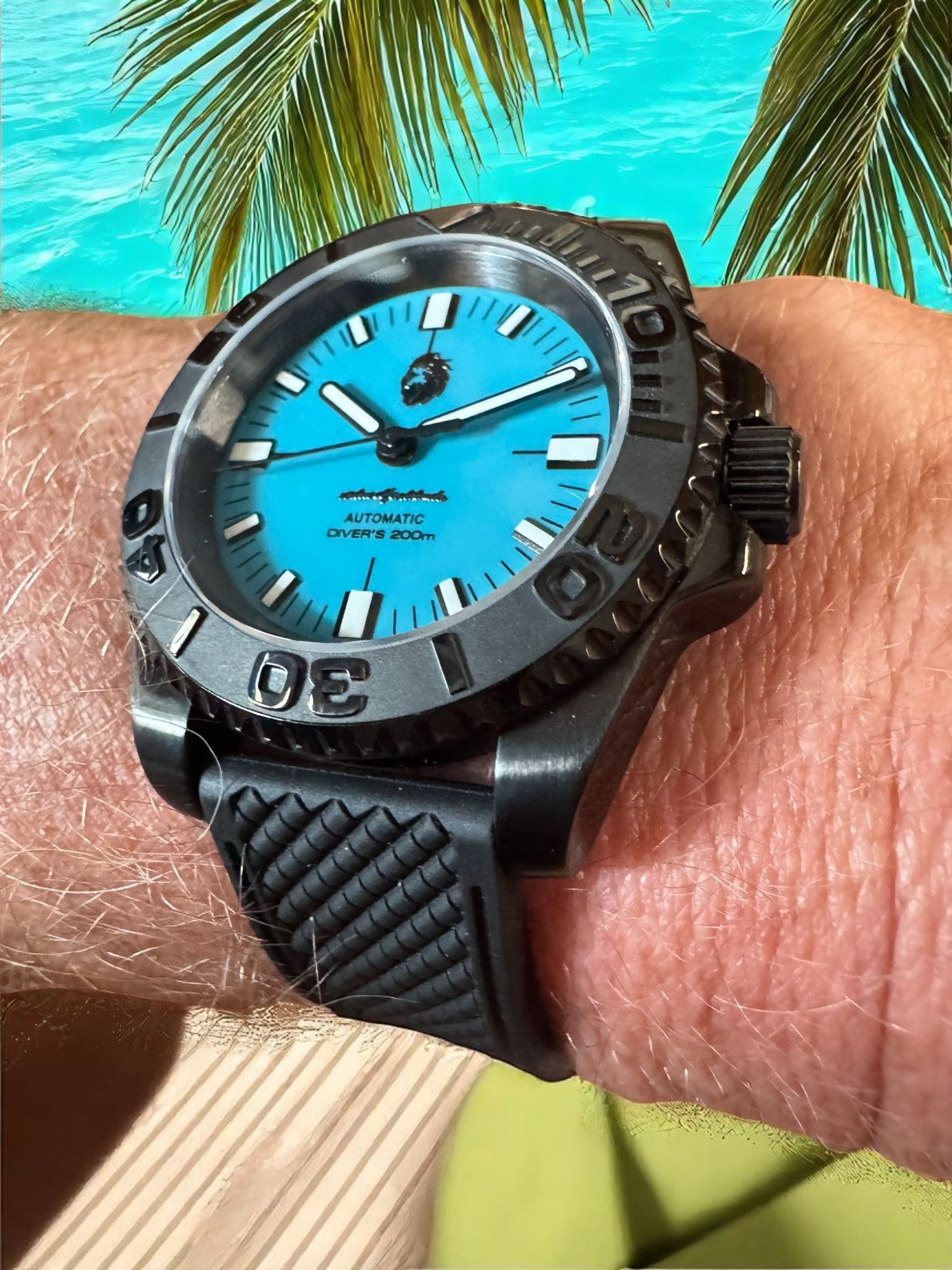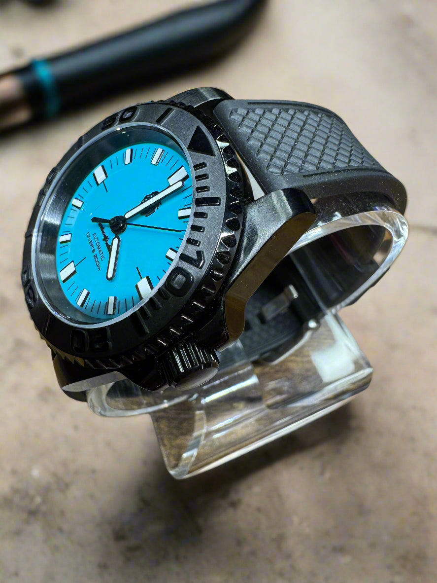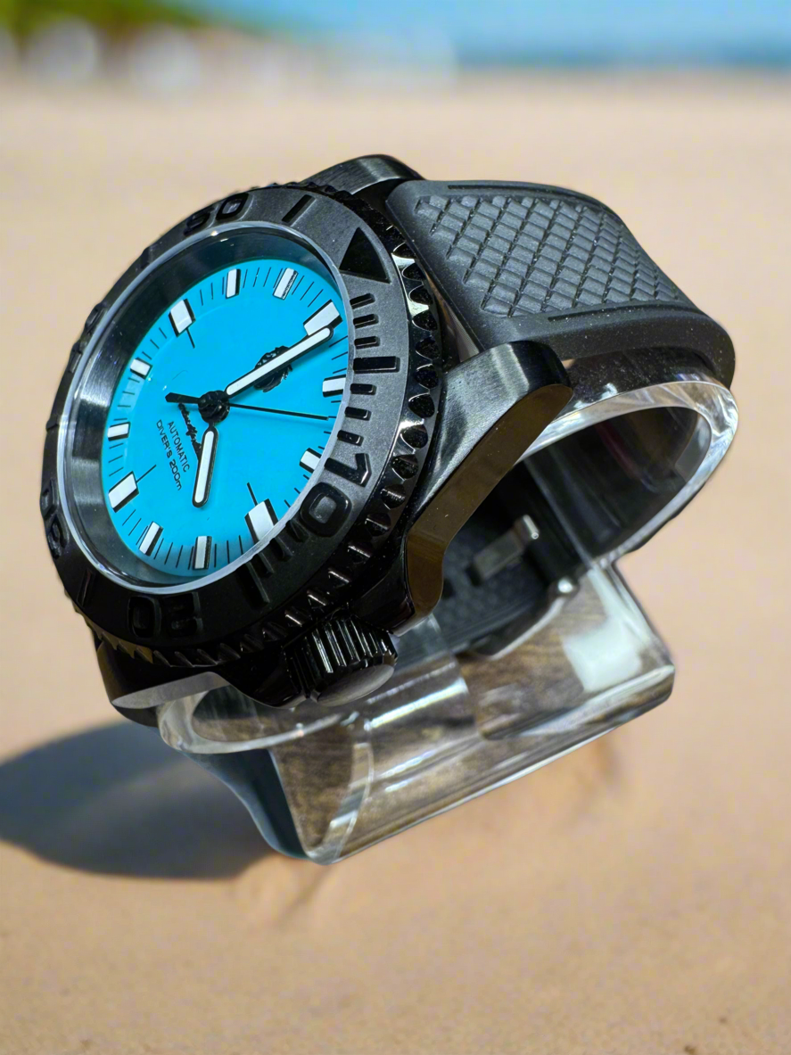 Crafted with a rugged black PVD-coated case and a unidirectional dive bezel, this automatic diver is as functional as it is fearless. With 200 meters of water resistance, luminous hands and indices, and a textured FKM rubber strap, it’s built to endure — whether diving reefs or navigating routine.
