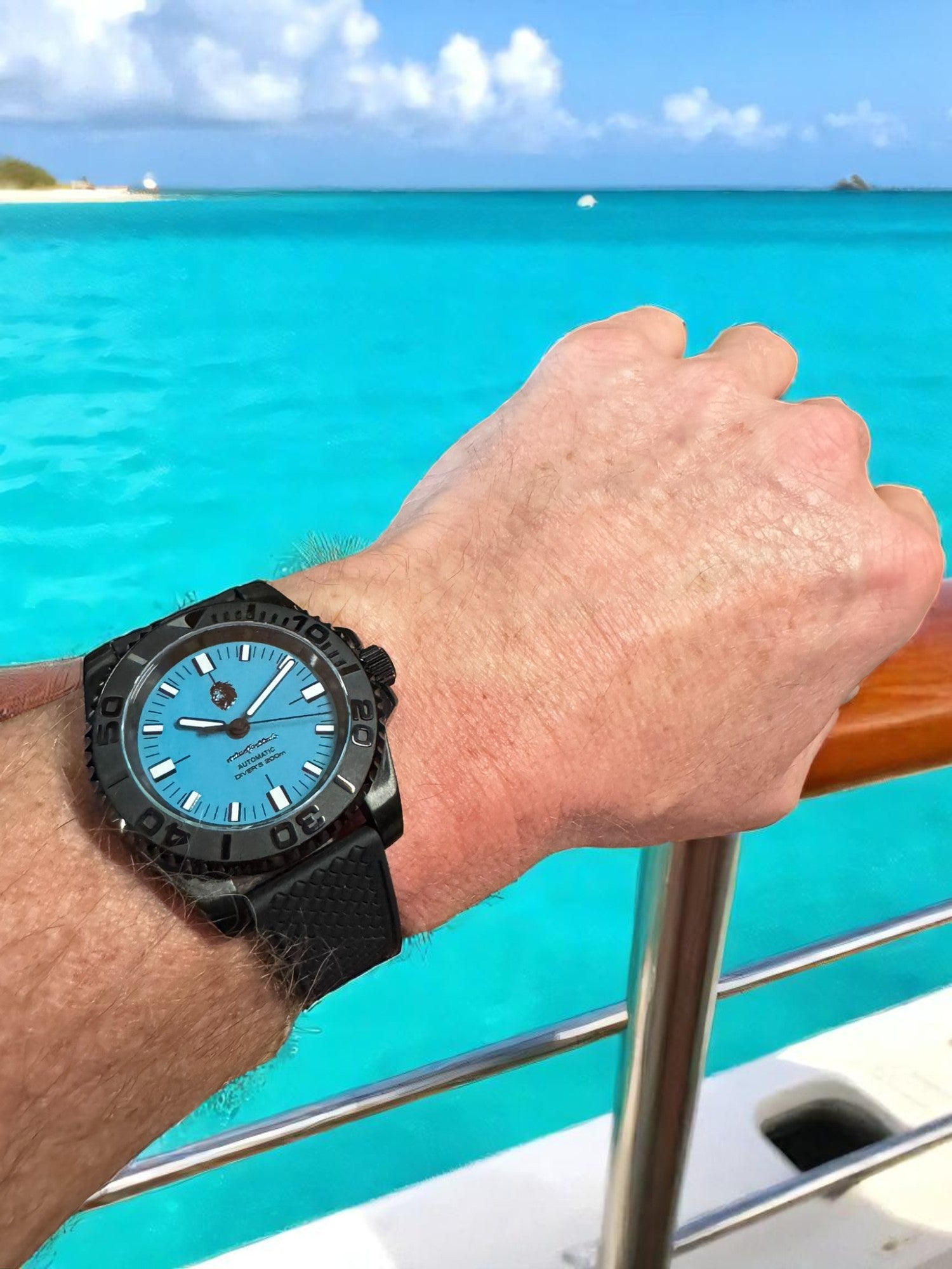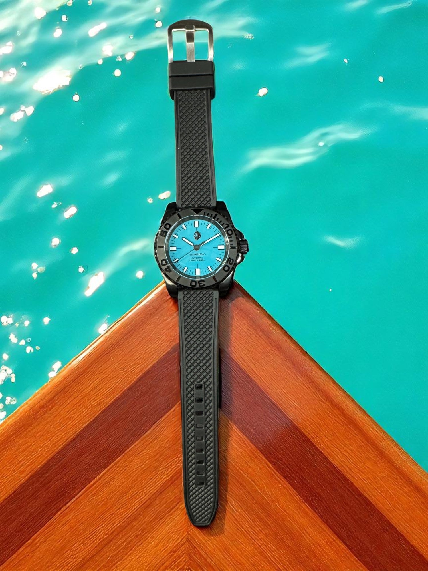 Inspired by the legendary sea that bore countless explorers and philosophers, The Aegean embodies the clarity of thought and depth of purpose. Its electric blue dial cuts through the matte black case and bezel like sunlight on calm waters — a vivid contrast that commands attention without noise.
