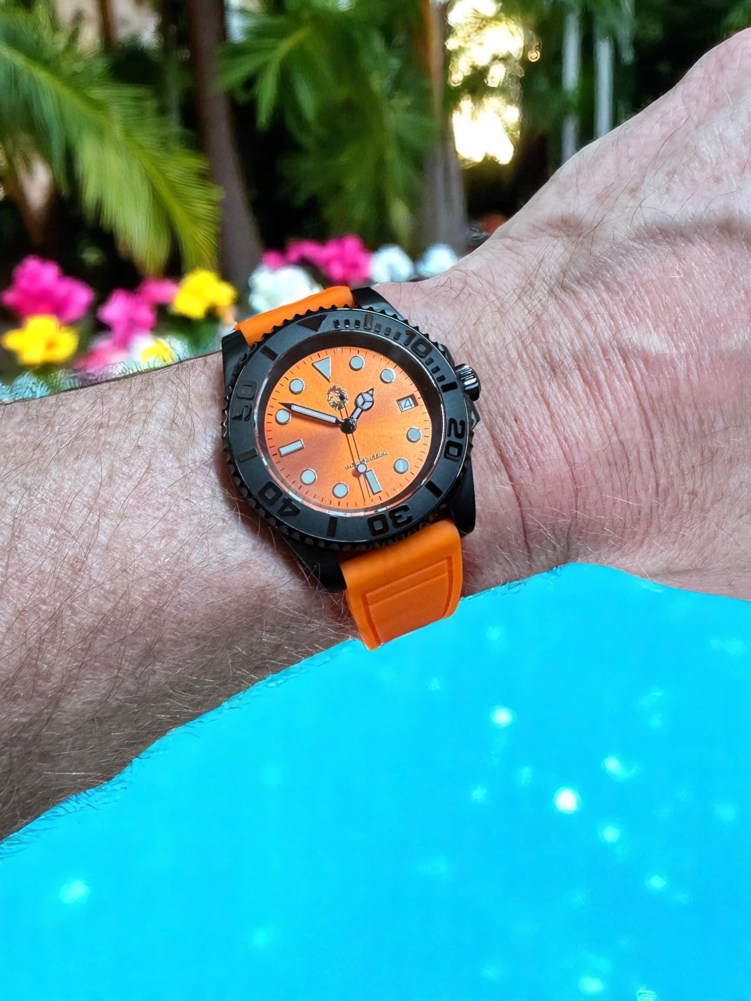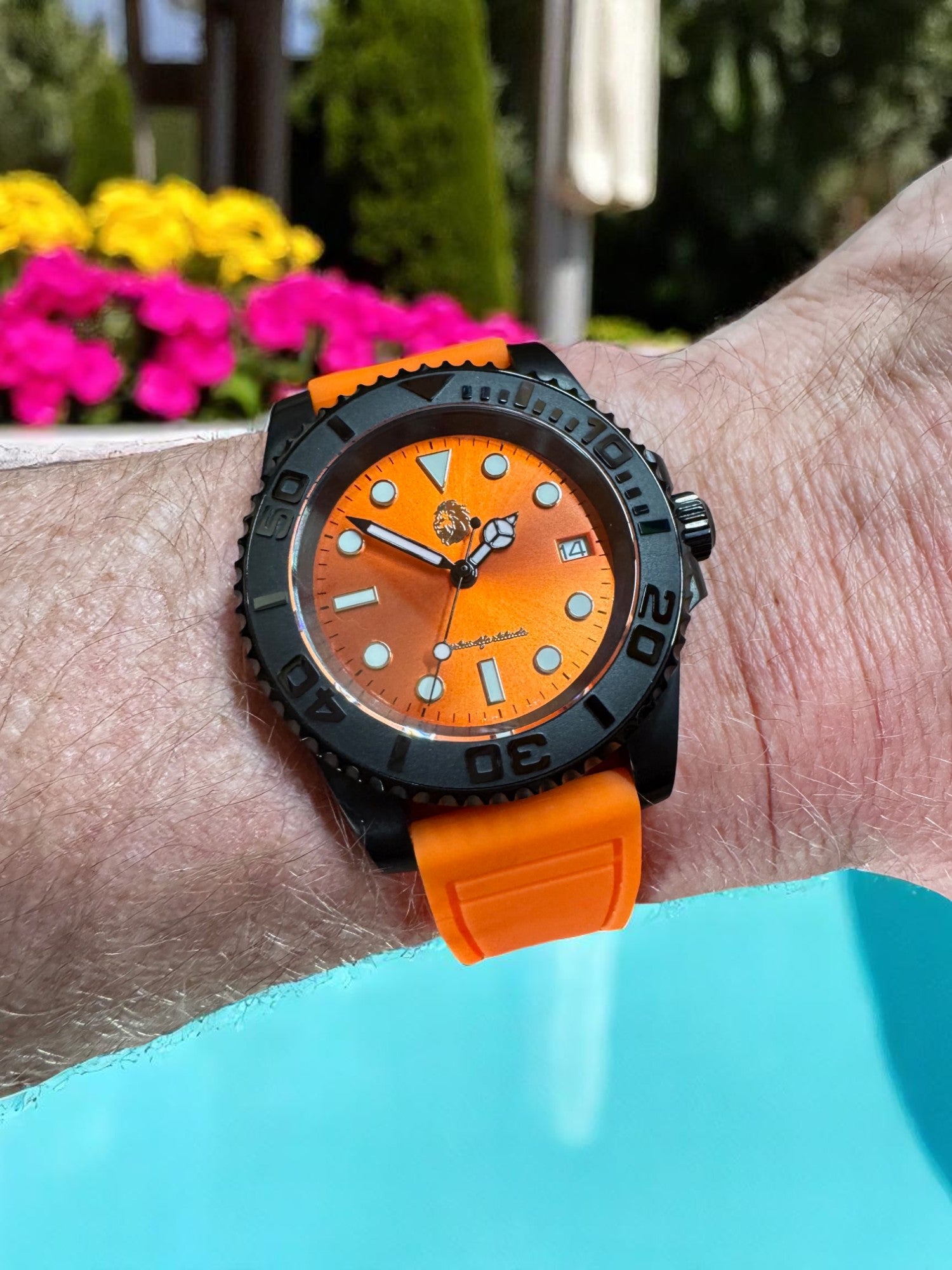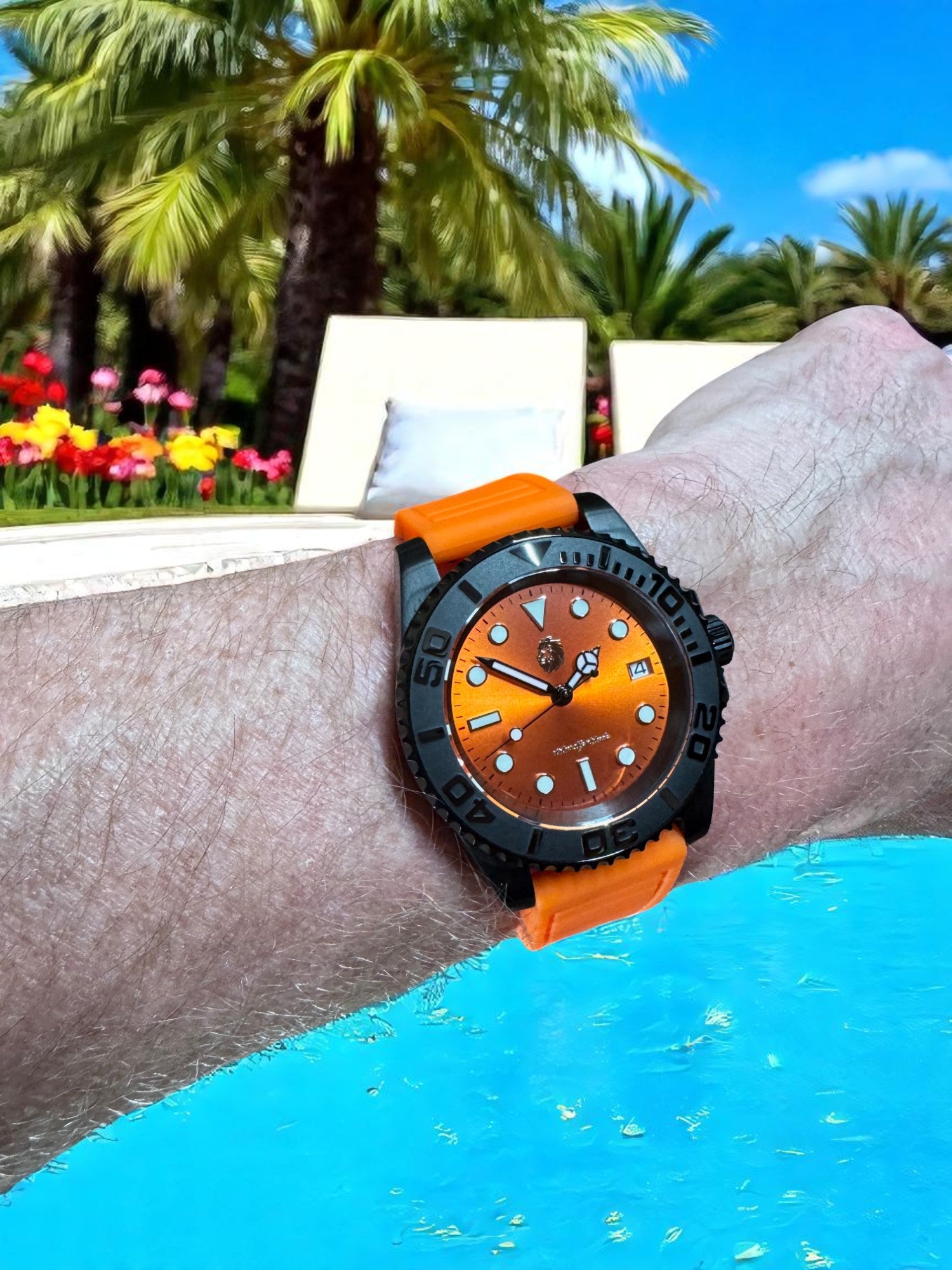Built for adventure and clarity, the Helion features oversized indices, luminous hands, and a rugged screw-down crown, ensuring peak performance even in the depths. Whether at sea or poolside, it’s a tool of presence and power—reminding you that the day belongs to the disciplined.