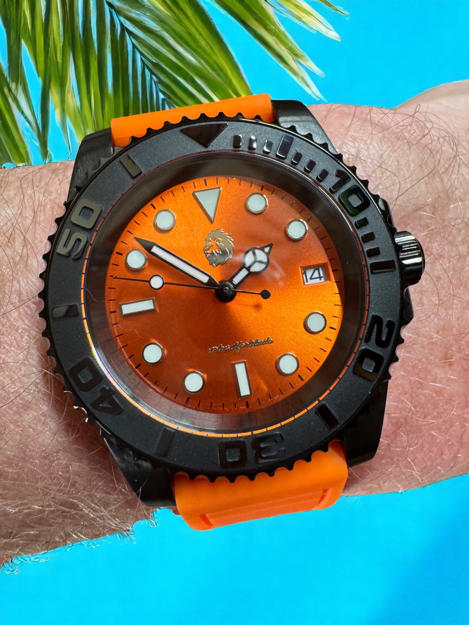The Helion is a burst of energy—a timepiece forged for the fearless. Named after the Greek word for “sun,” this vibrant orange-dial diver is a tribute to the Stoic who rises each day with fire in the soul and purpose in every action. The bold black bezel and case contrast the radiant dial and strap, symbolizing the harmony of intensity and control.