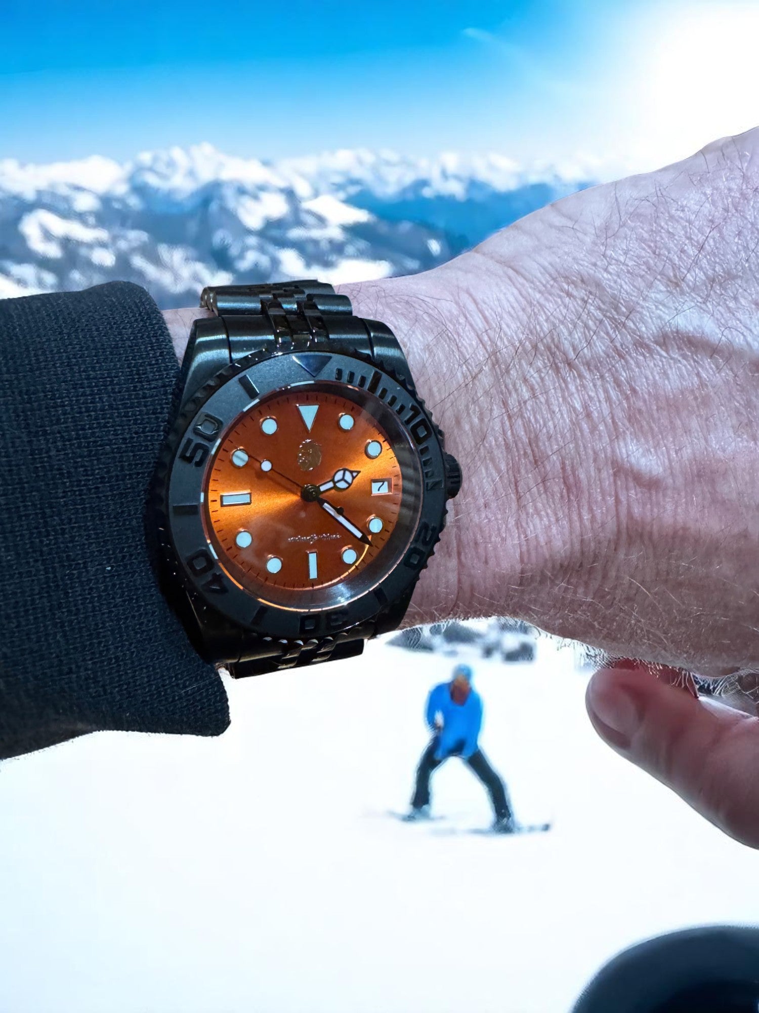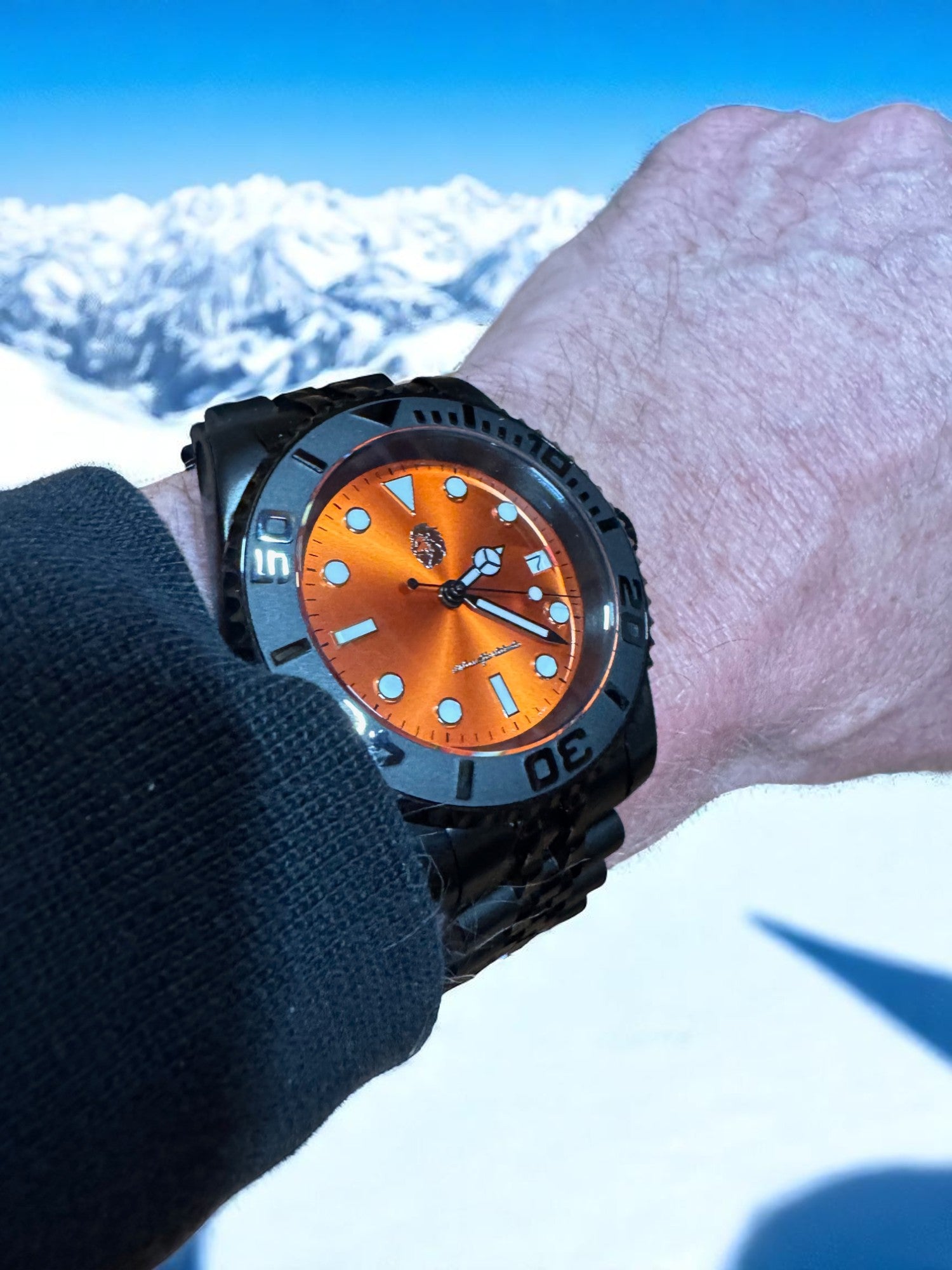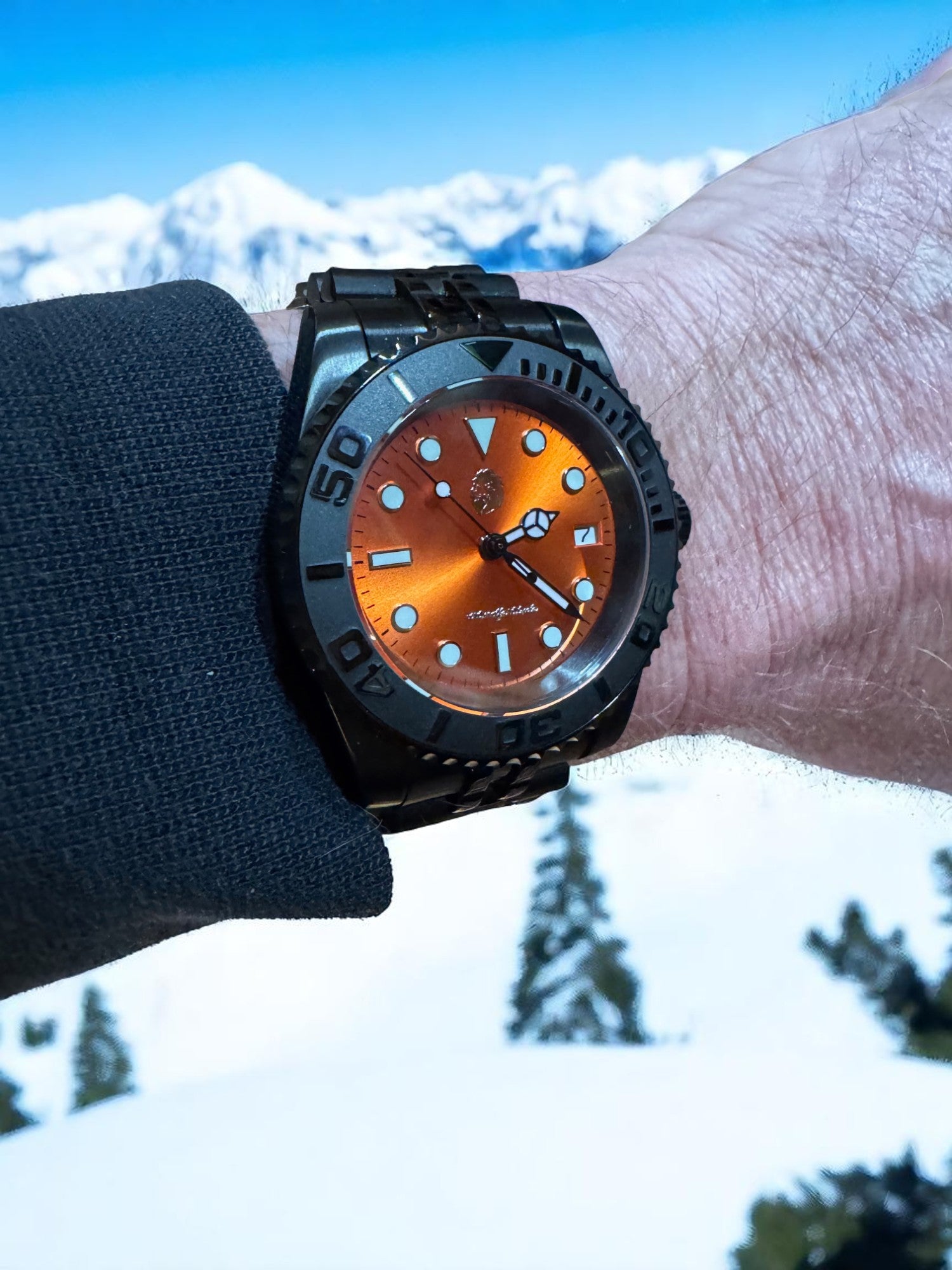 Forged for those who brave the extremes, the Stoic Ember Depth pairs bold aesthetics with rugged performance. Featuring a sunburst orange dial that blazes against a matte black case and bracelet, this dive-ready timepiece embodies courage in all conditions—from the frozen slopes to sun-drenched coasts. Its luminous indices, unidirectional bezel, and screw-down crown ensure clarity and durability at any depth, while the automatic movement keeps perfect time without compromise.