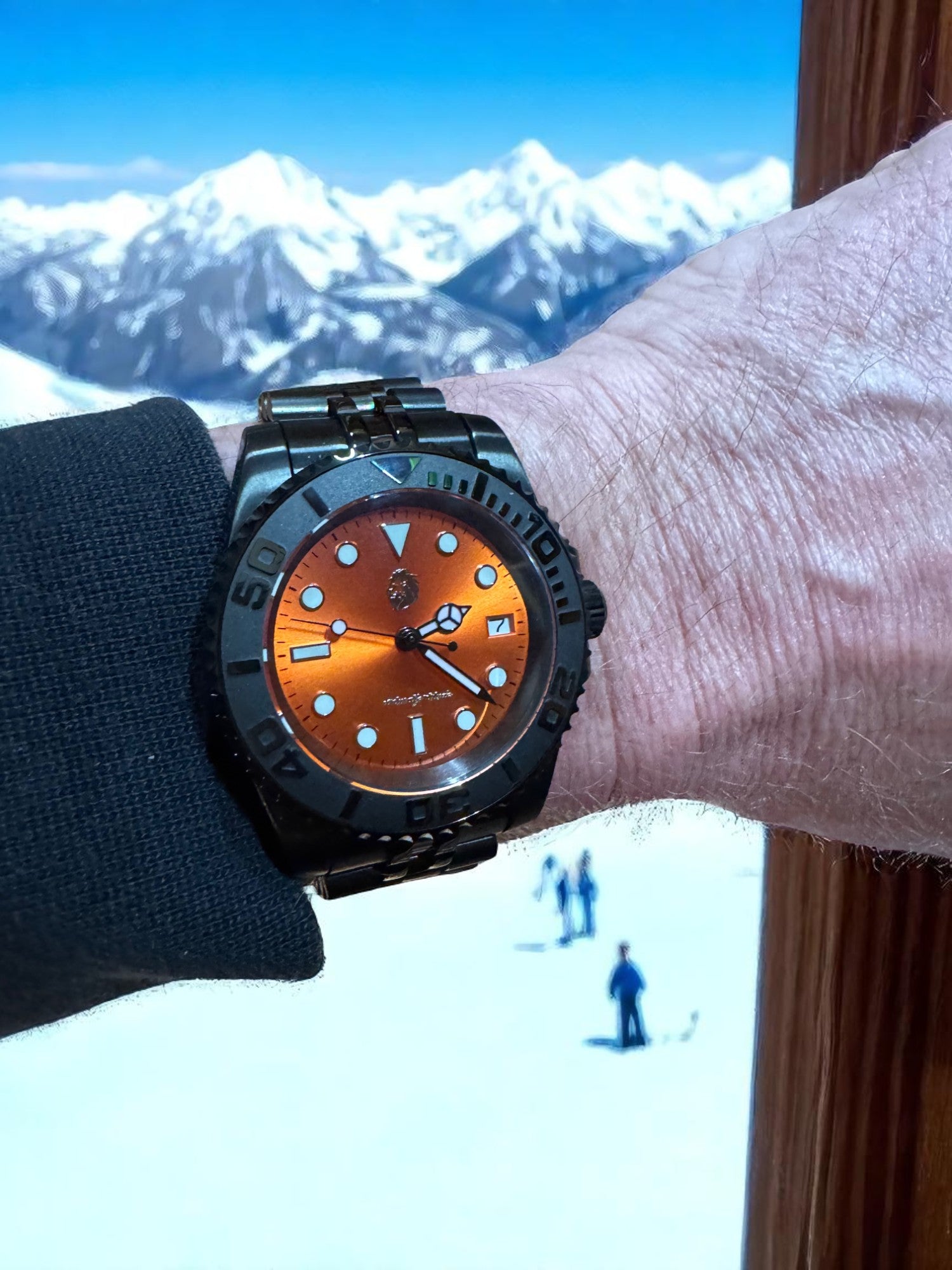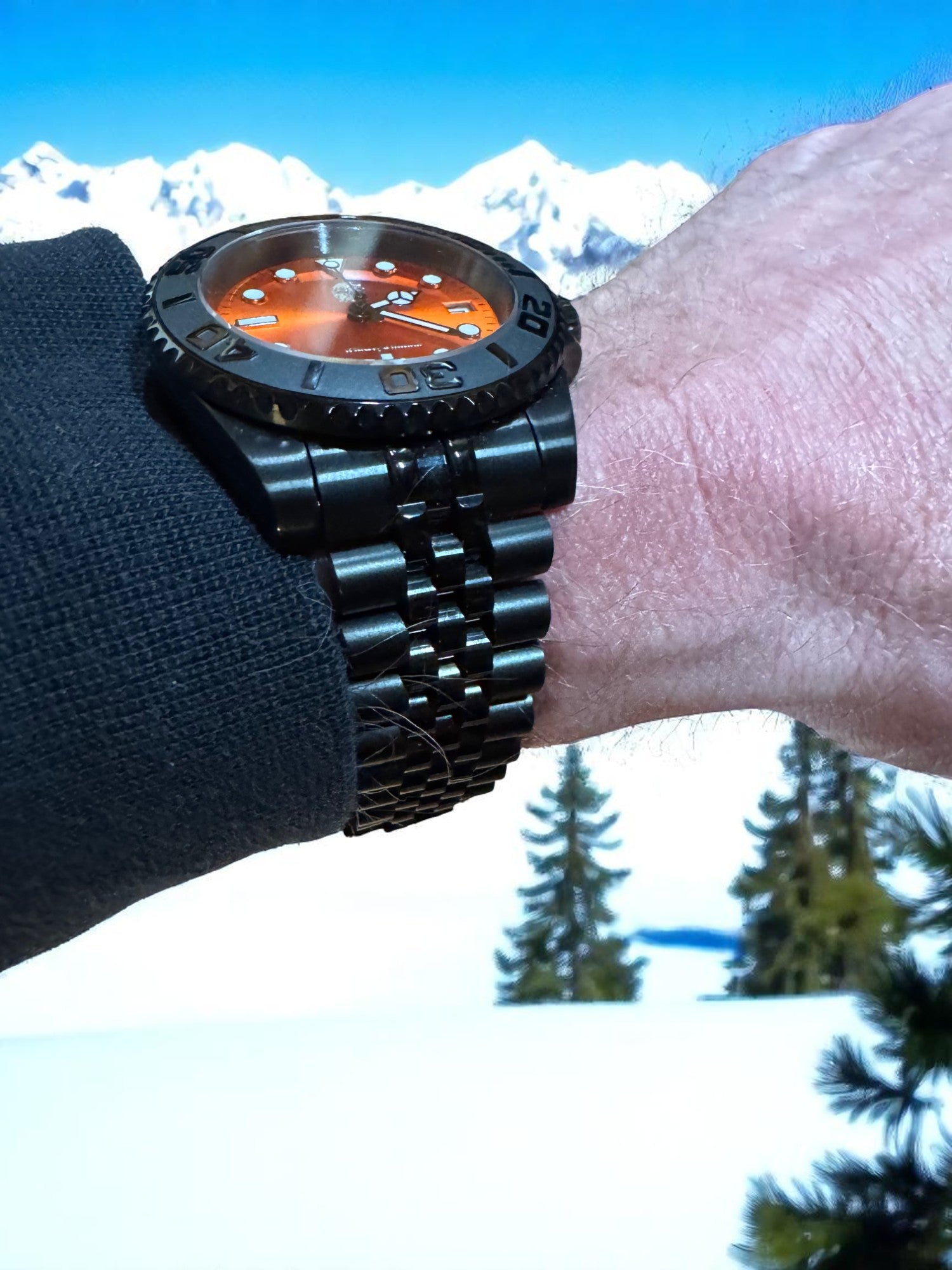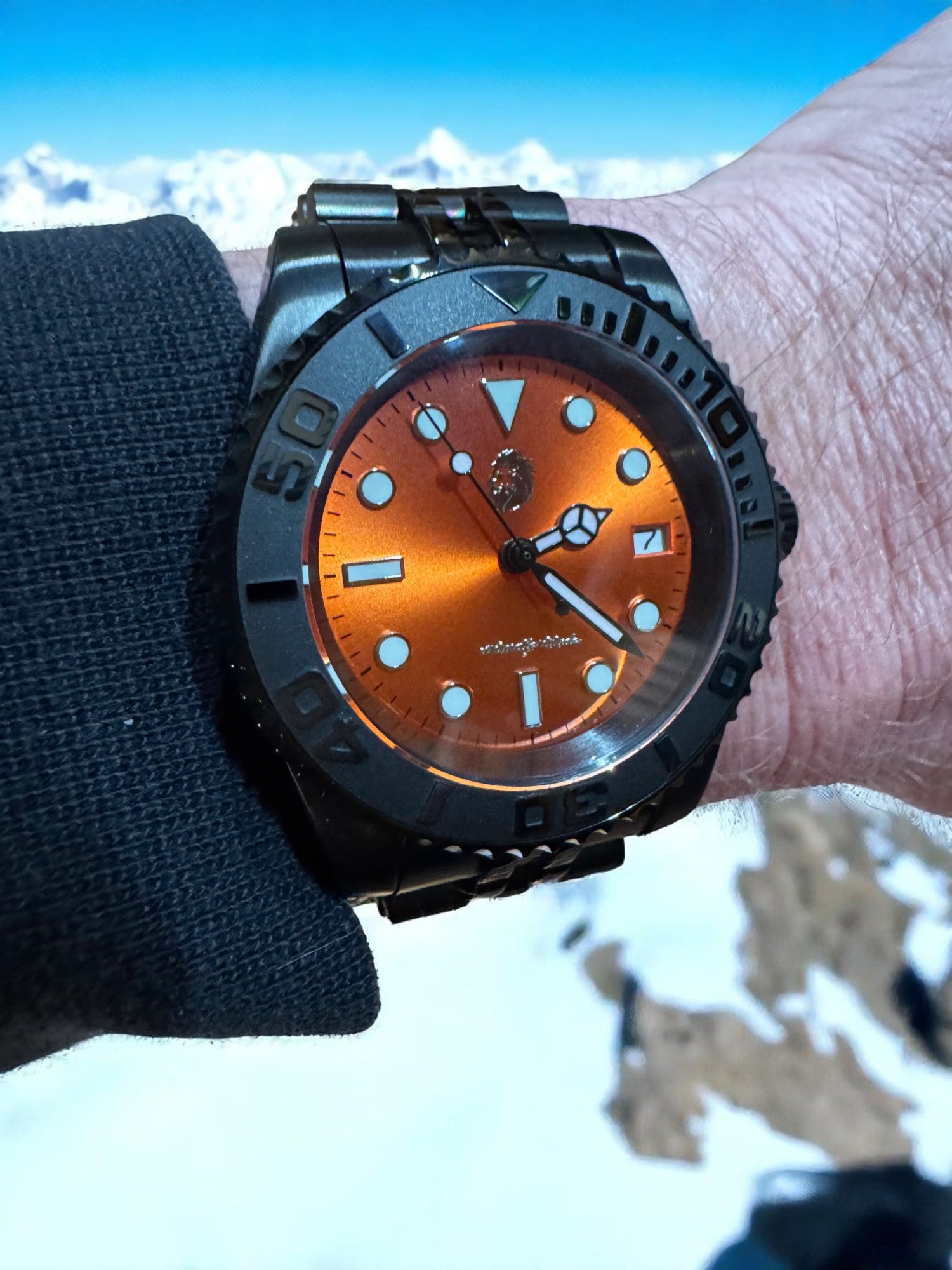 Forged for those who brave the extremes, the Stoic Ember Depth pairs bold aesthetics with rugged performance. Featuring a sunburst orange dial that blazes against a matte black case and bracelet, this dive-ready timepiece embodies courage in all conditions—from the frozen slopes to sun-drenched coasts. Its luminous indices, unidirectional bezel, and screw-down crown ensure clarity and durability at any depth, while the automatic movement keeps perfect time without compromise.