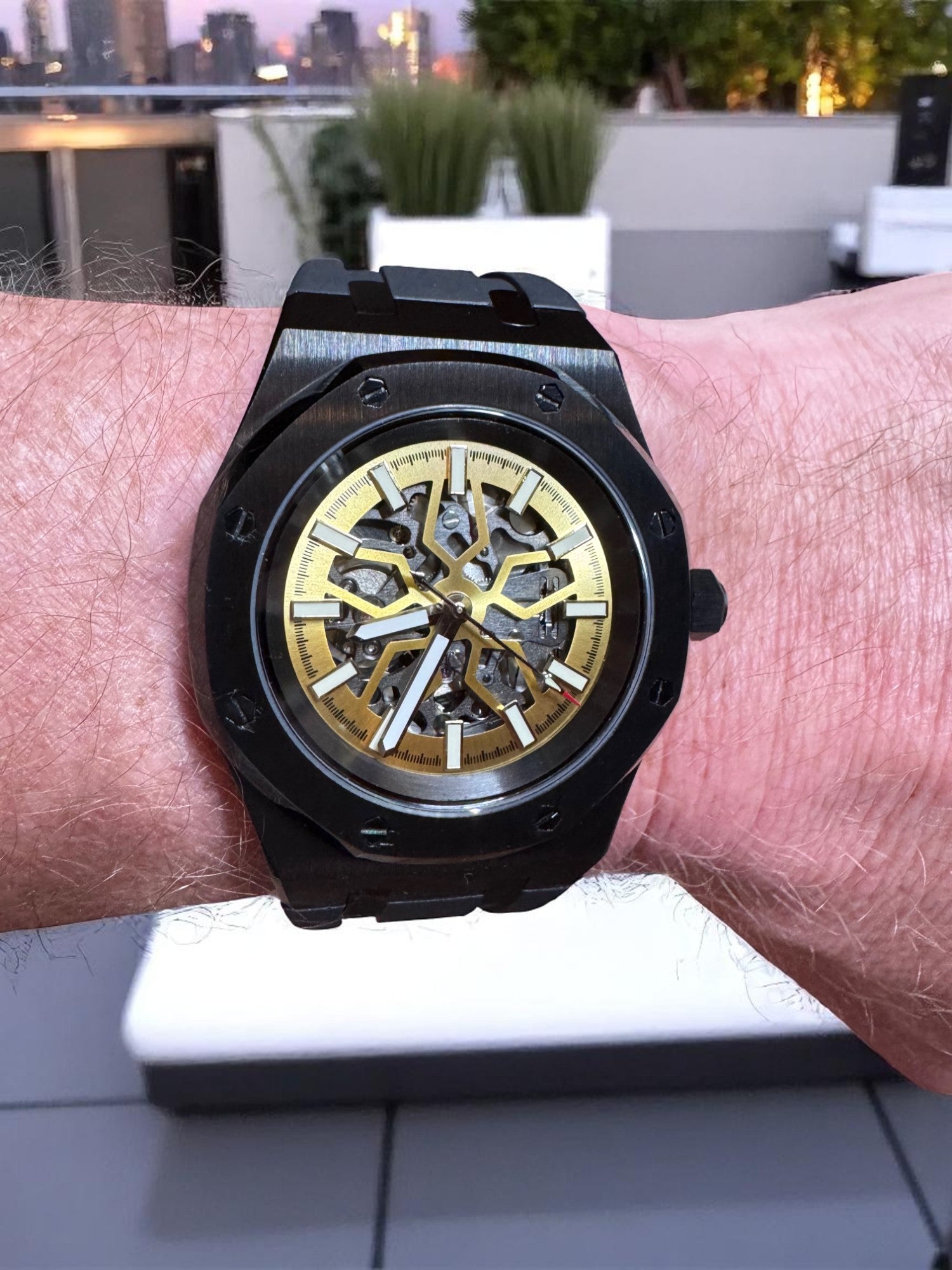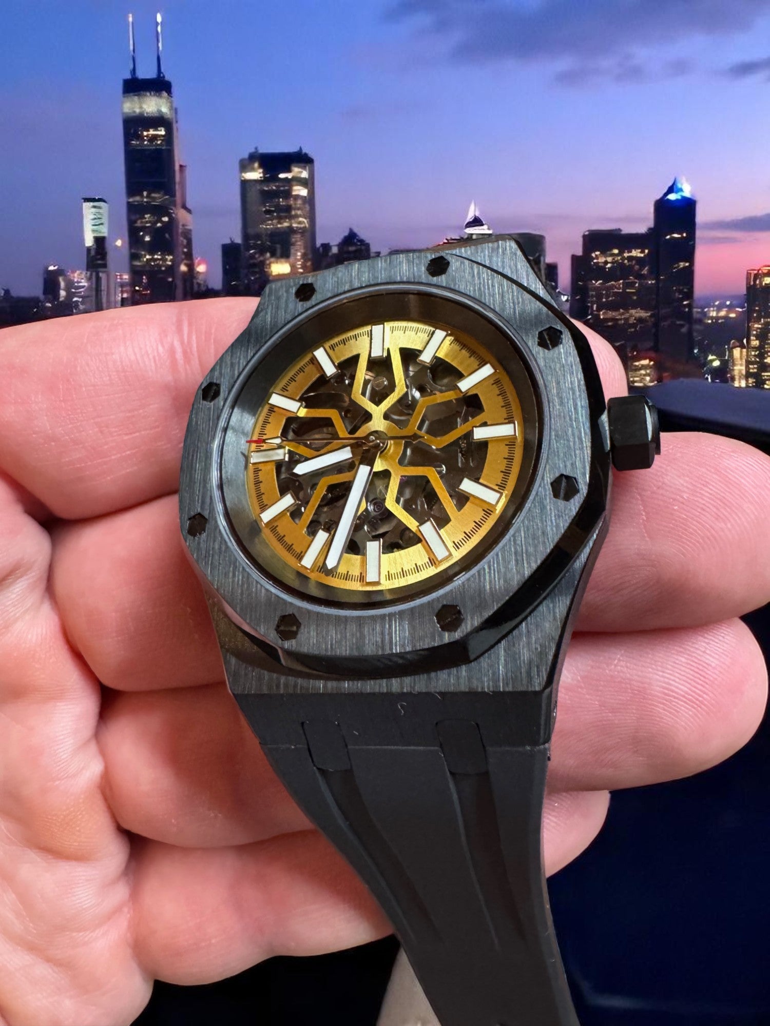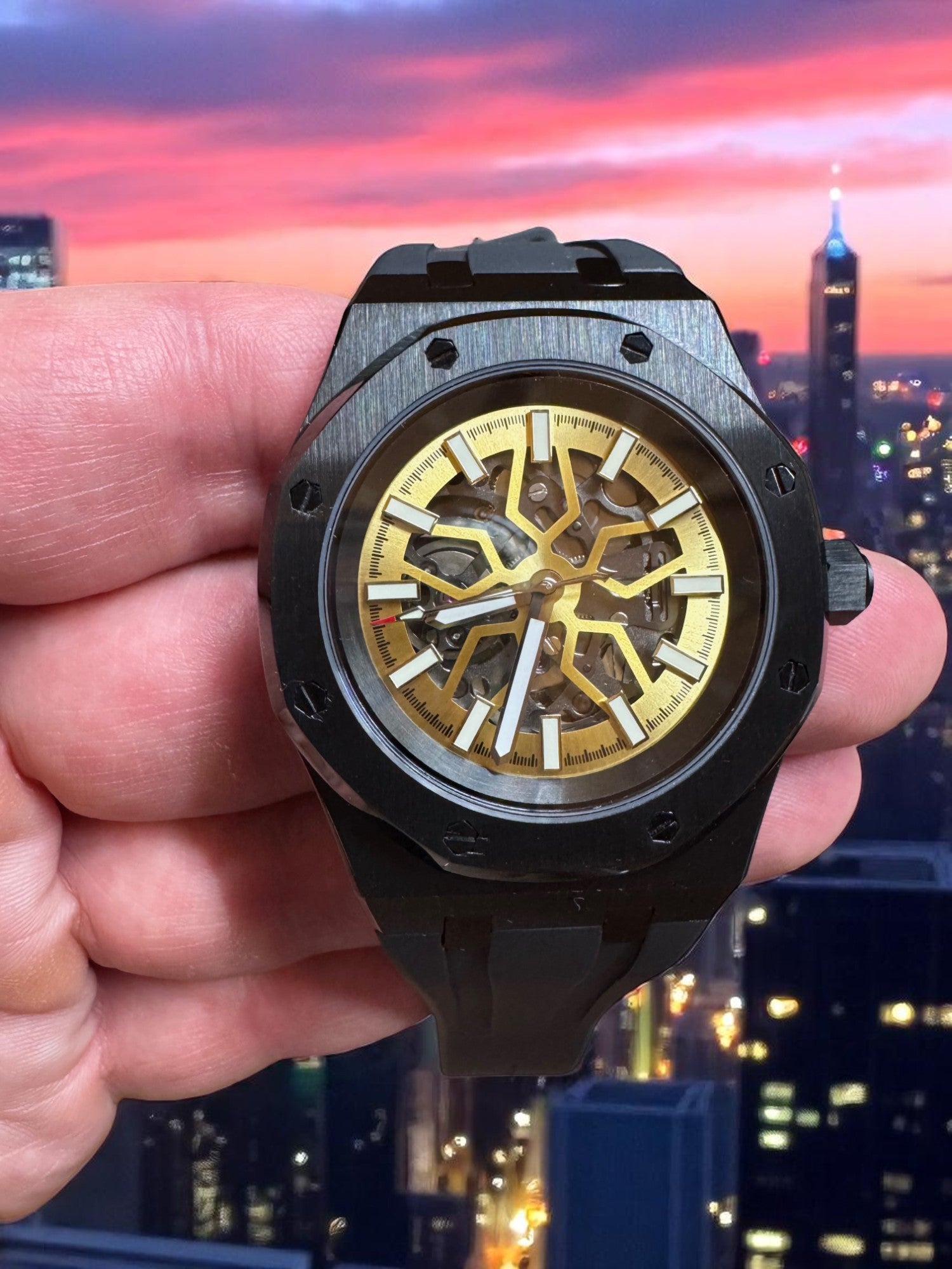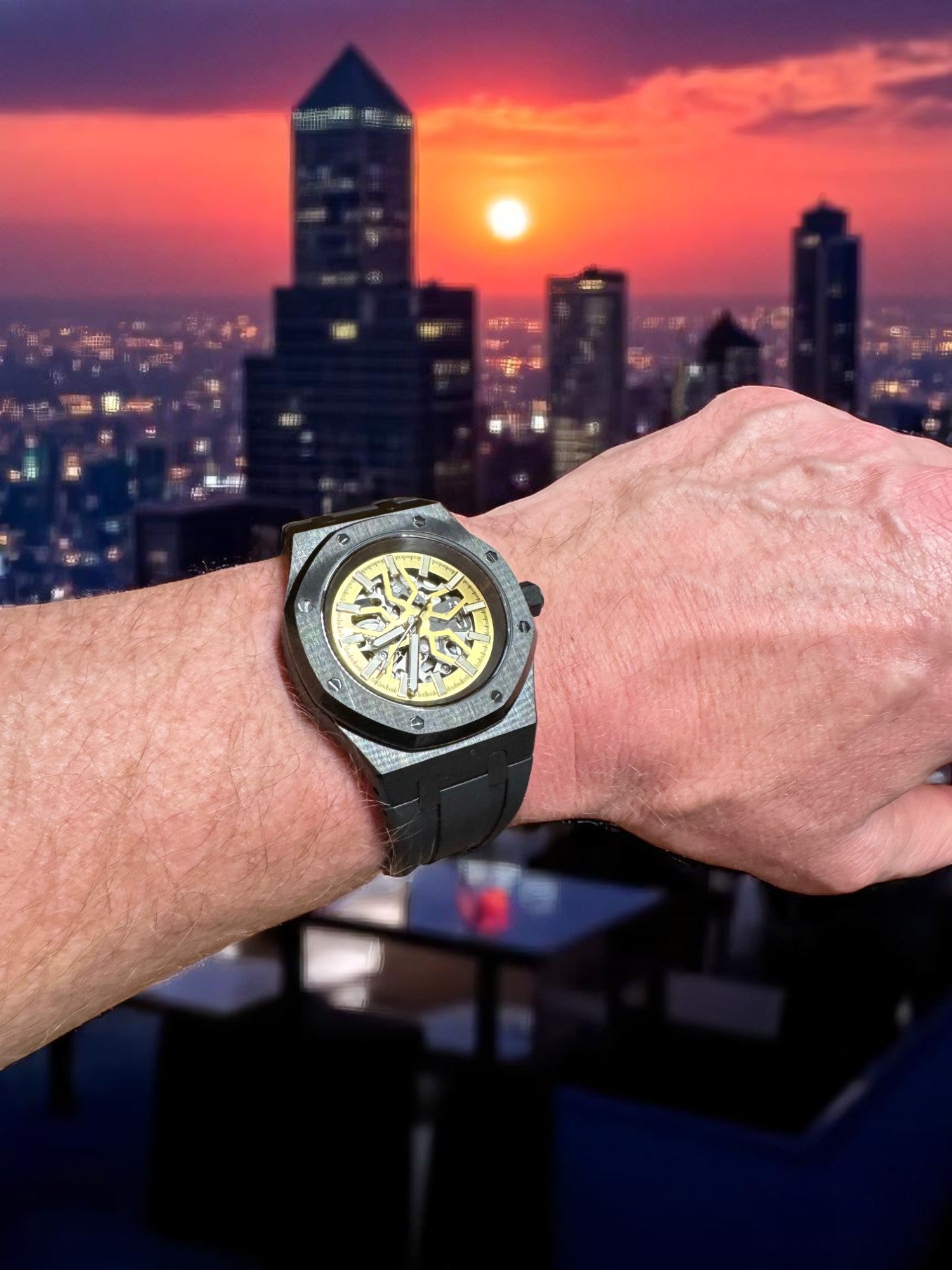 Encased in a forged carbon-style shell with an octagonal bezel and paired with a black FKM rubber strap, the Lucidus blends modern engineering with ancient wisdom. The golden tones of the inner mechanics evoke illumination through reflection, while the black outer shell represents the resilience to withstand pressure without breaking.