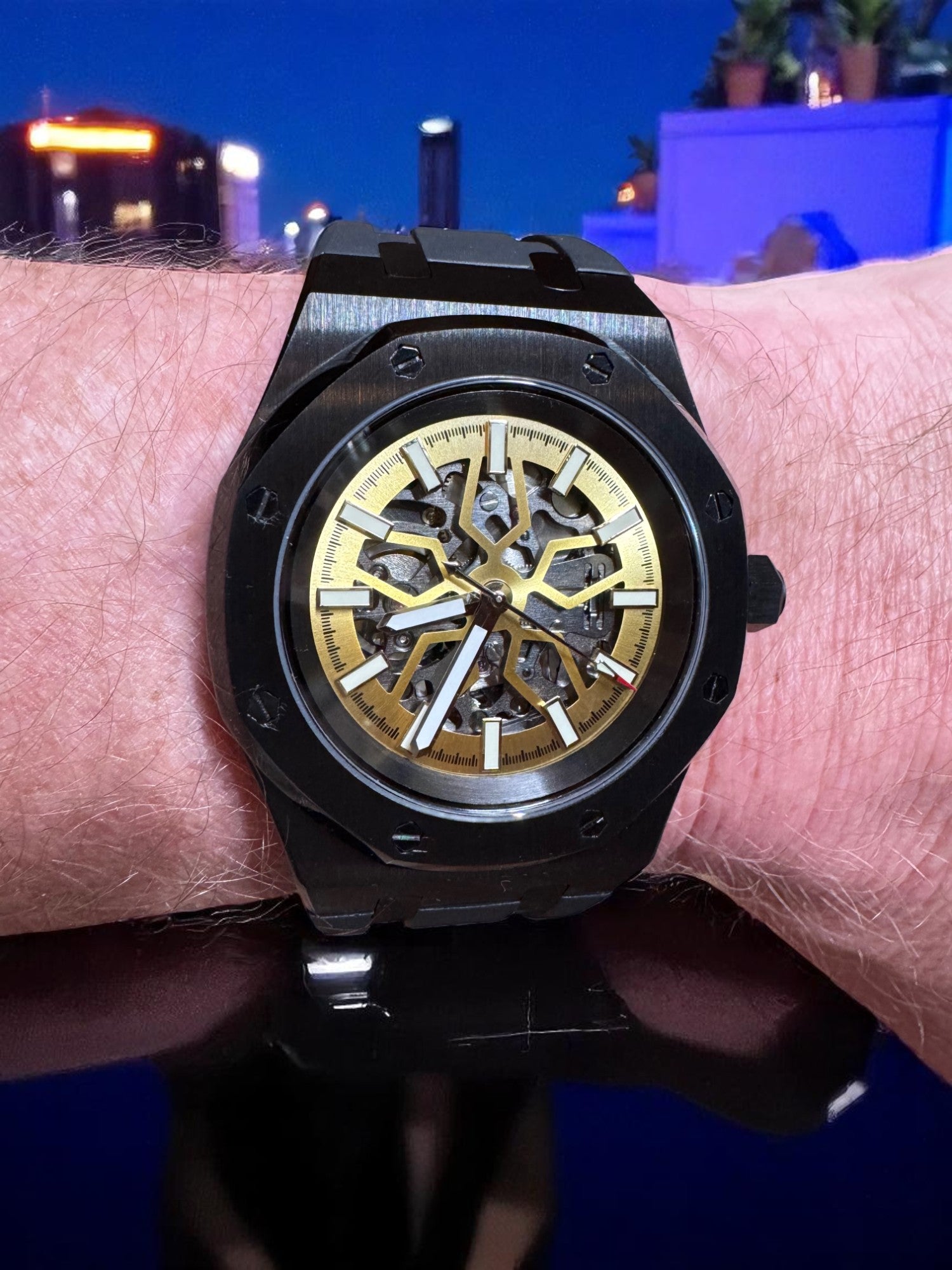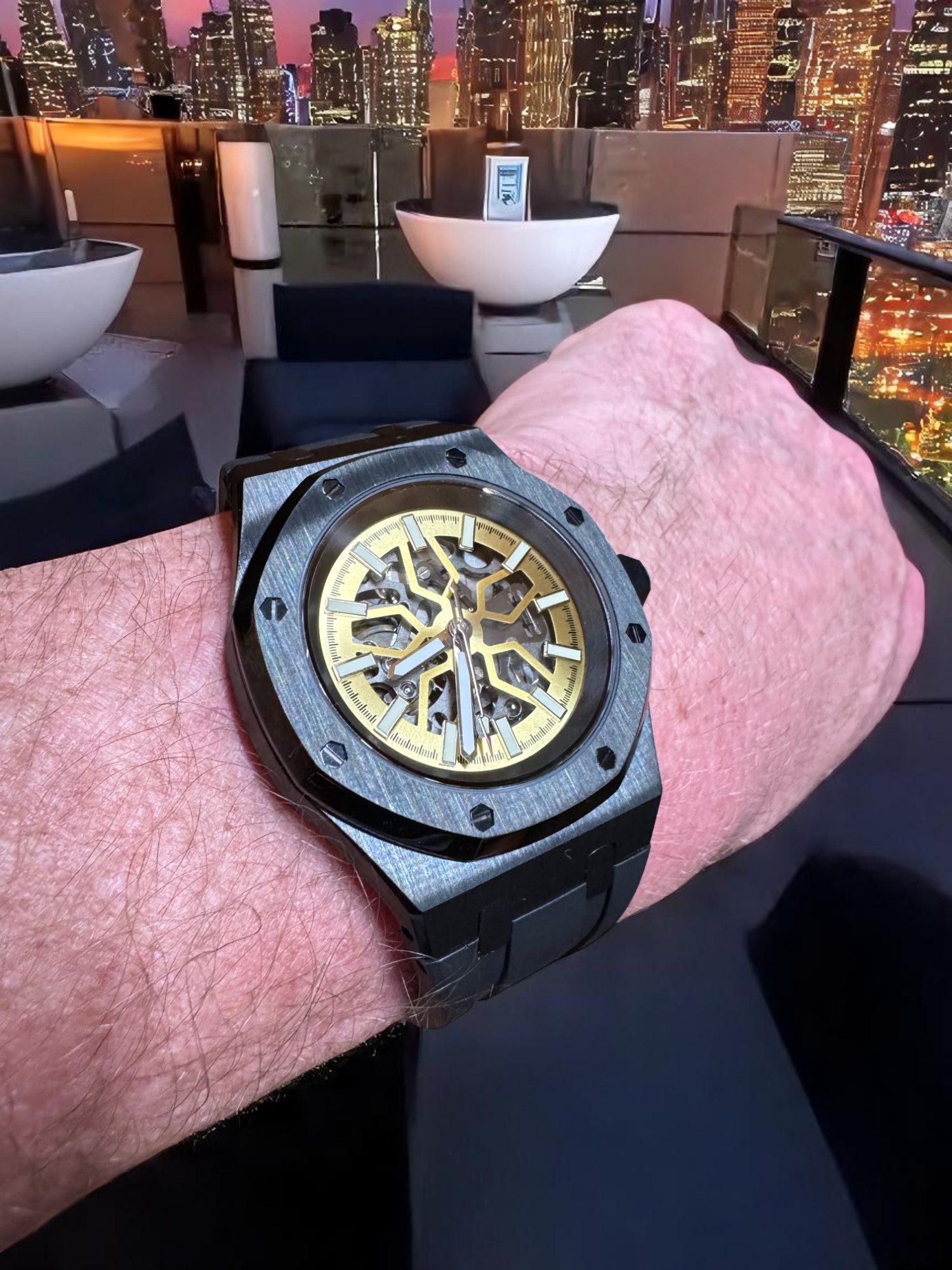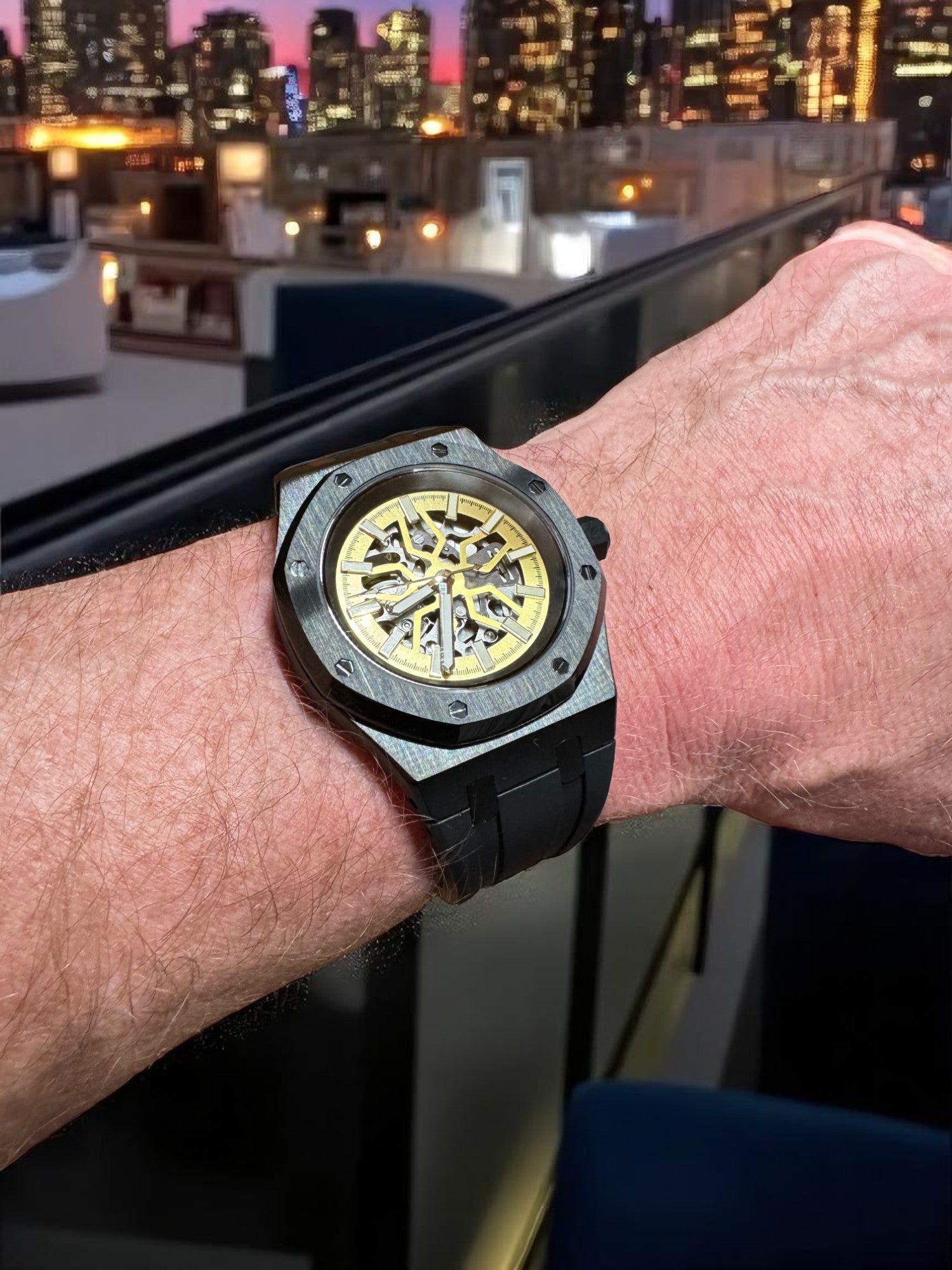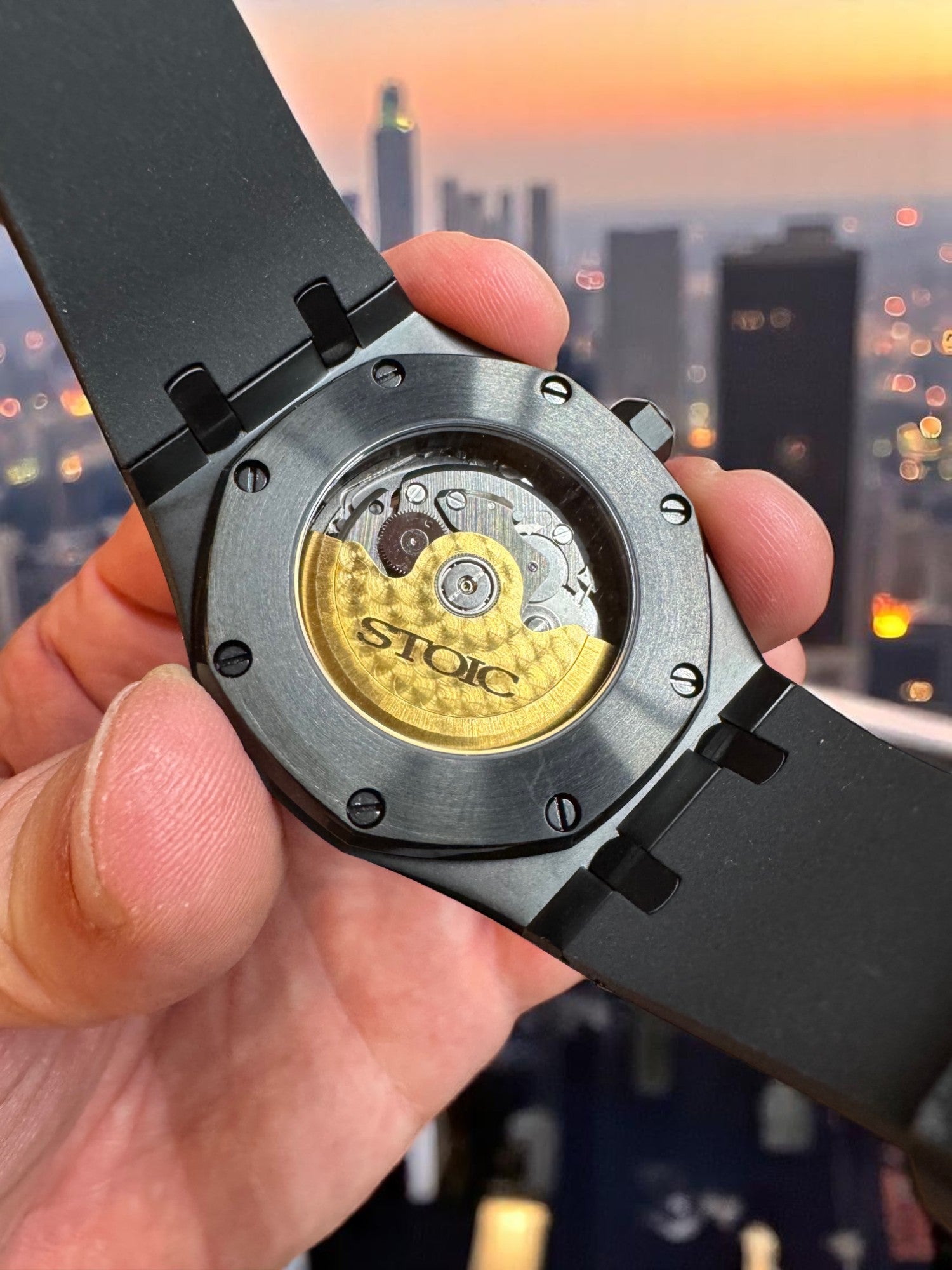 Encased in a forged carbon-style shell with an octagonal bezel and paired with a black FKM rubber strap, the Lucidus blends modern engineering with ancient wisdom. The golden tones of the inner mechanics evoke illumination through reflection, while the black outer shell represents the resilience to withstand pressure without breaking.