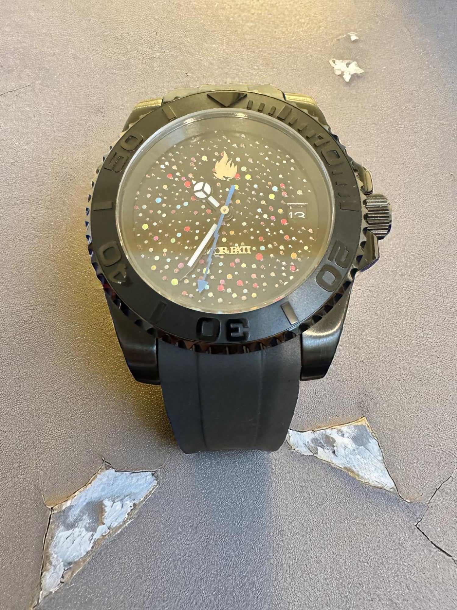 The STOIC Memento is a poetic paradox — a robust dive watch wrapped in the whimsy of a starlit celebration. Its black dial bursts with vibrant polka-dot confetti, each one a marker of joy, spontaneity, and the impermanence of time. At the 12 o’clock mark, a golden flame emblem reminds you of life’s fragile spark — both fleeting and powerful.