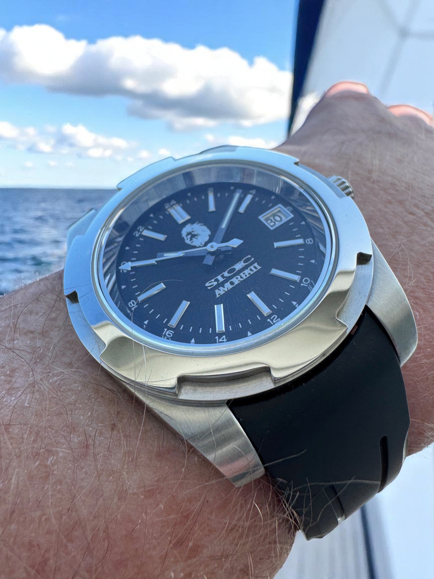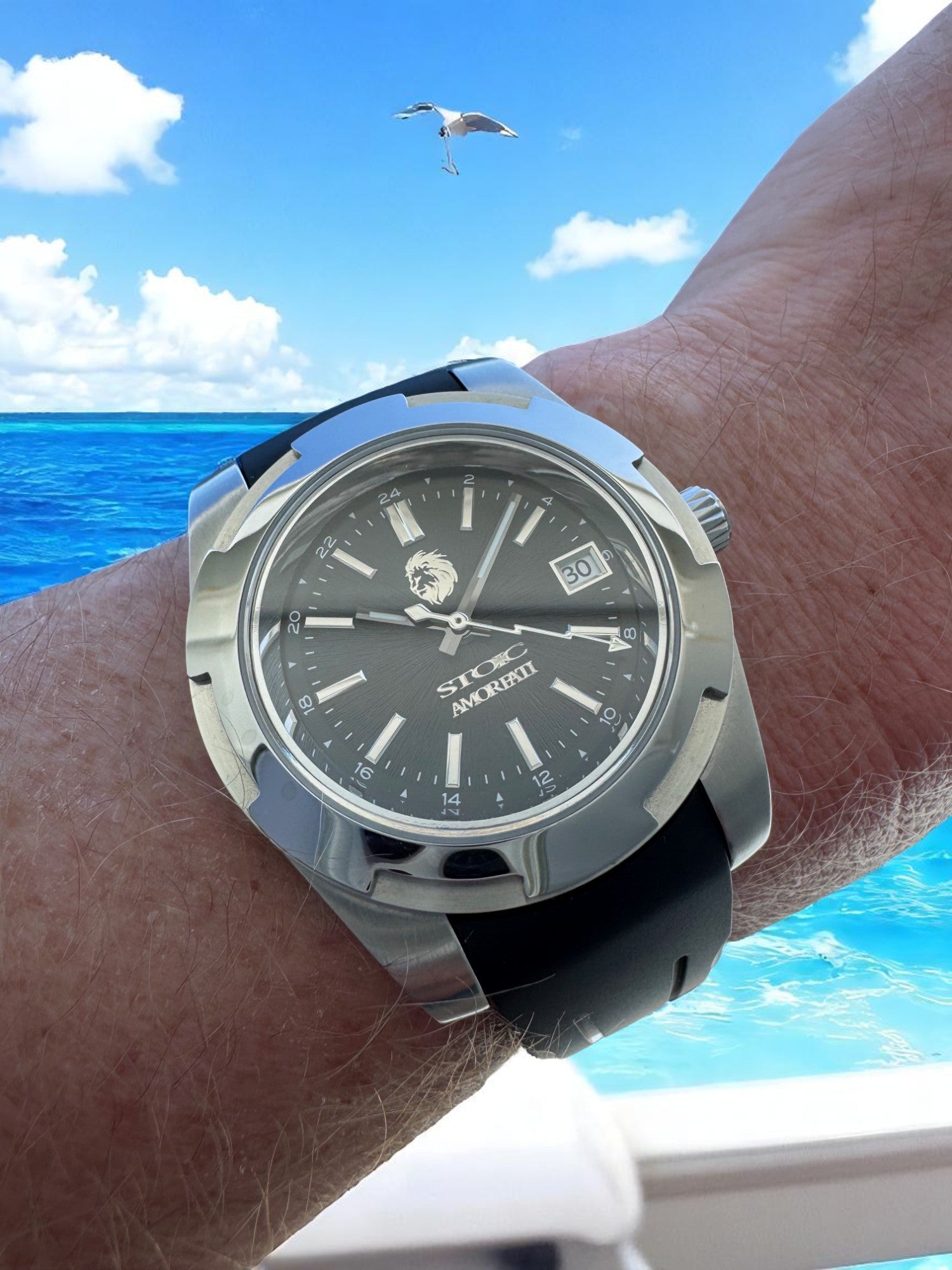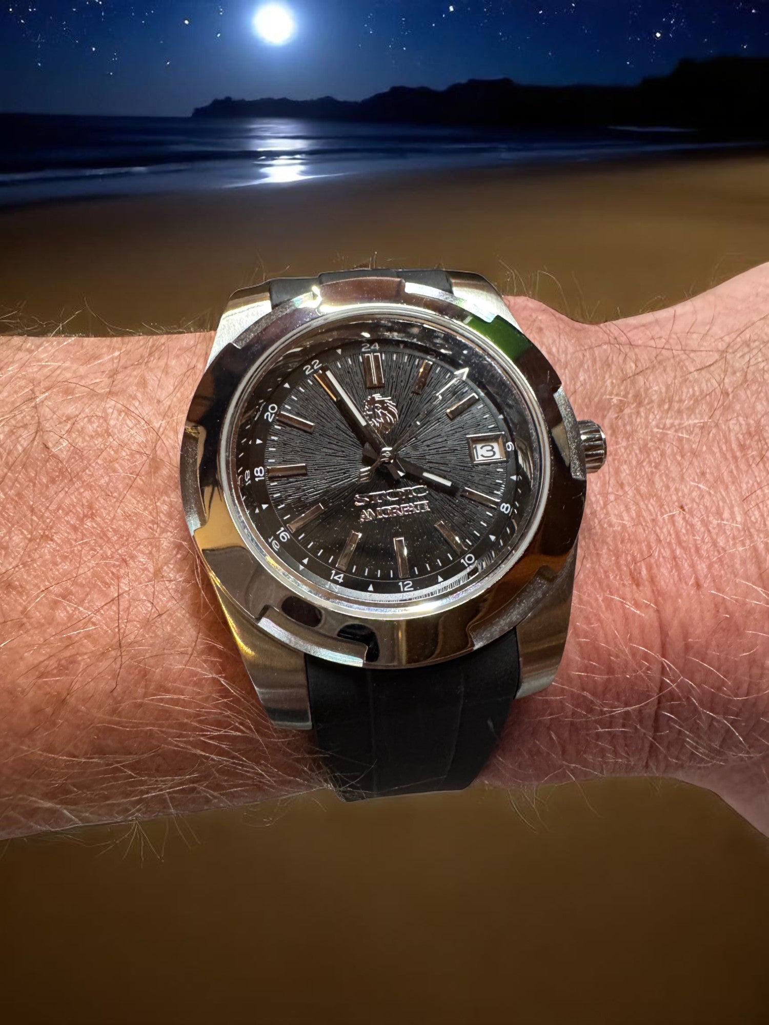 Encased in brushed stainless steel with strong geometric lugs and paired with a durable black rubber strap, the Noctis balances bold design with utilitarian purpose. A subtle 24-hour inner ring offers tracking across time zones, while the automatic movement ensures constant, deliberate motion—like the Stoic who walks unseen but never without direction.