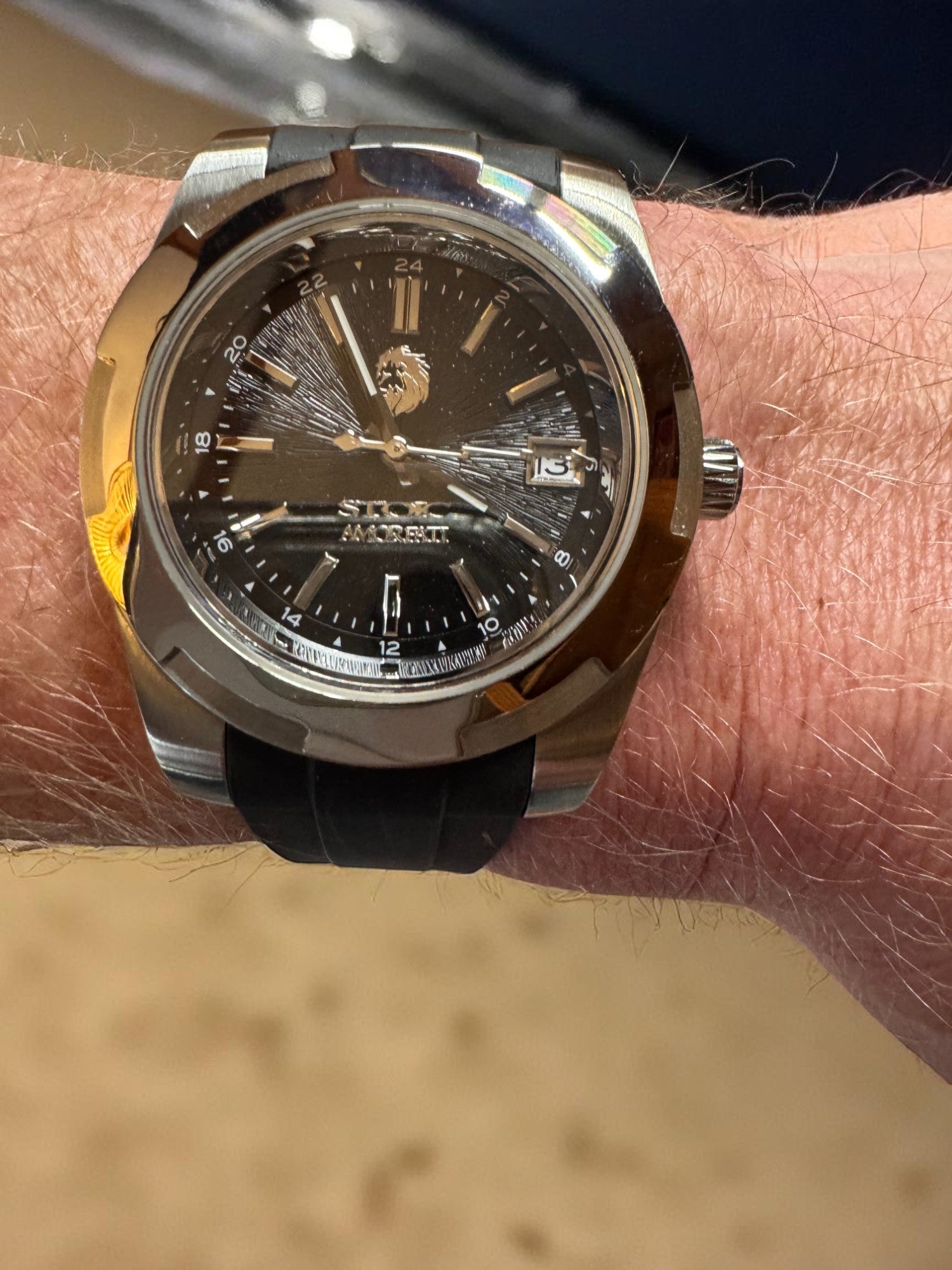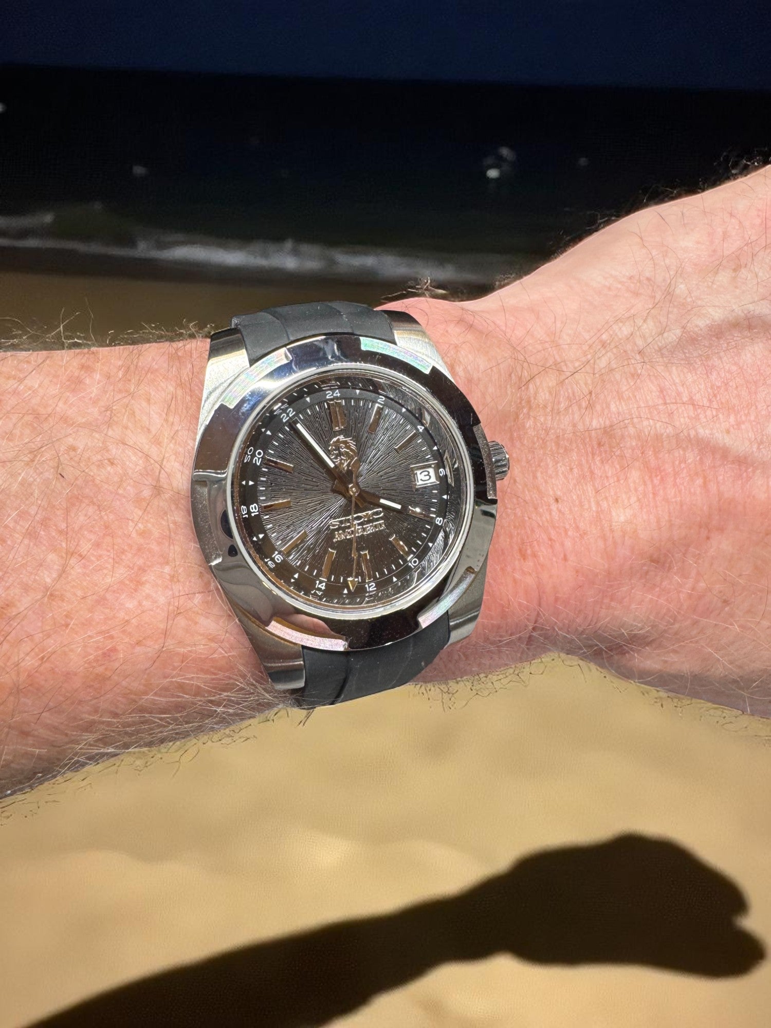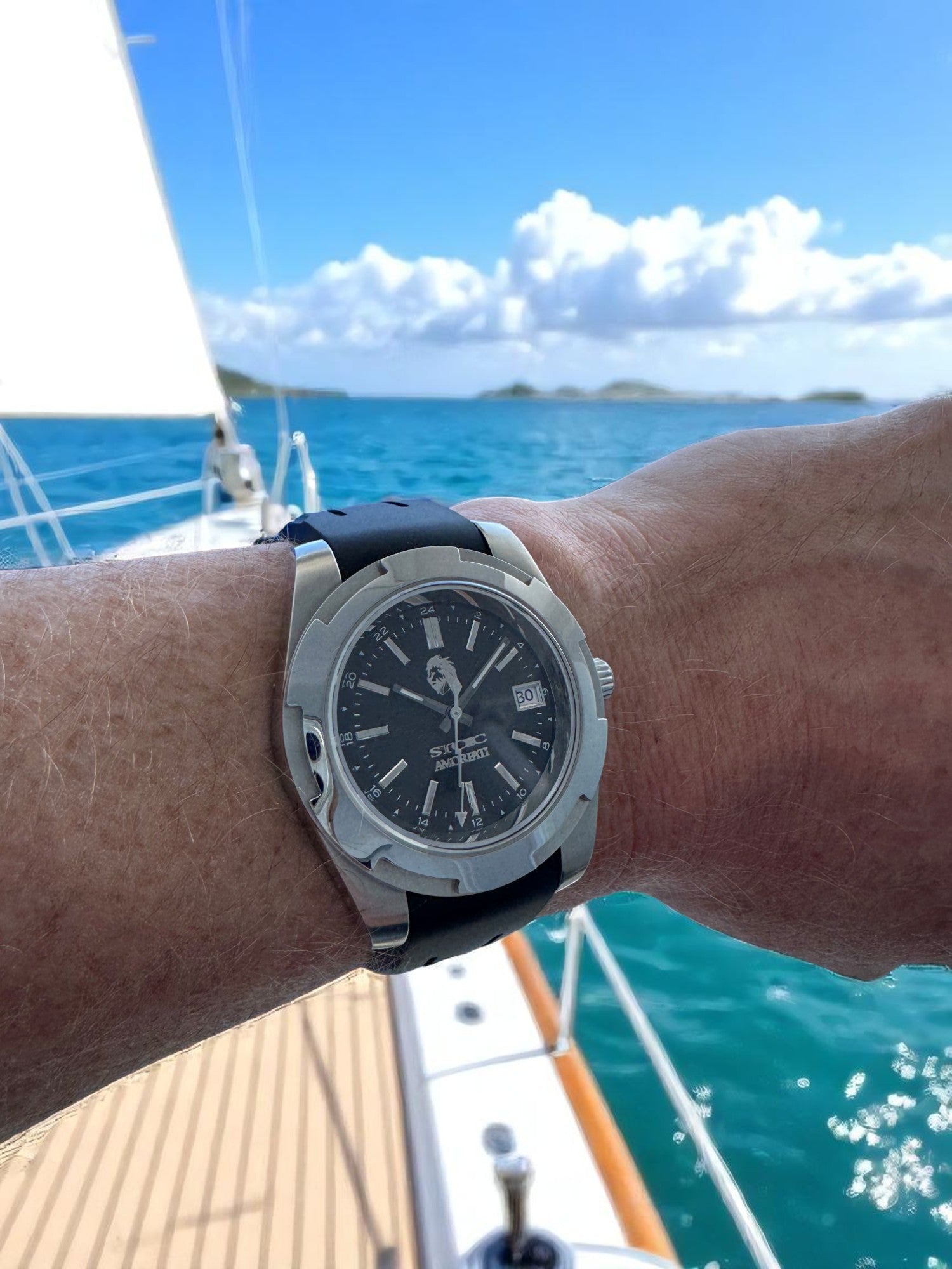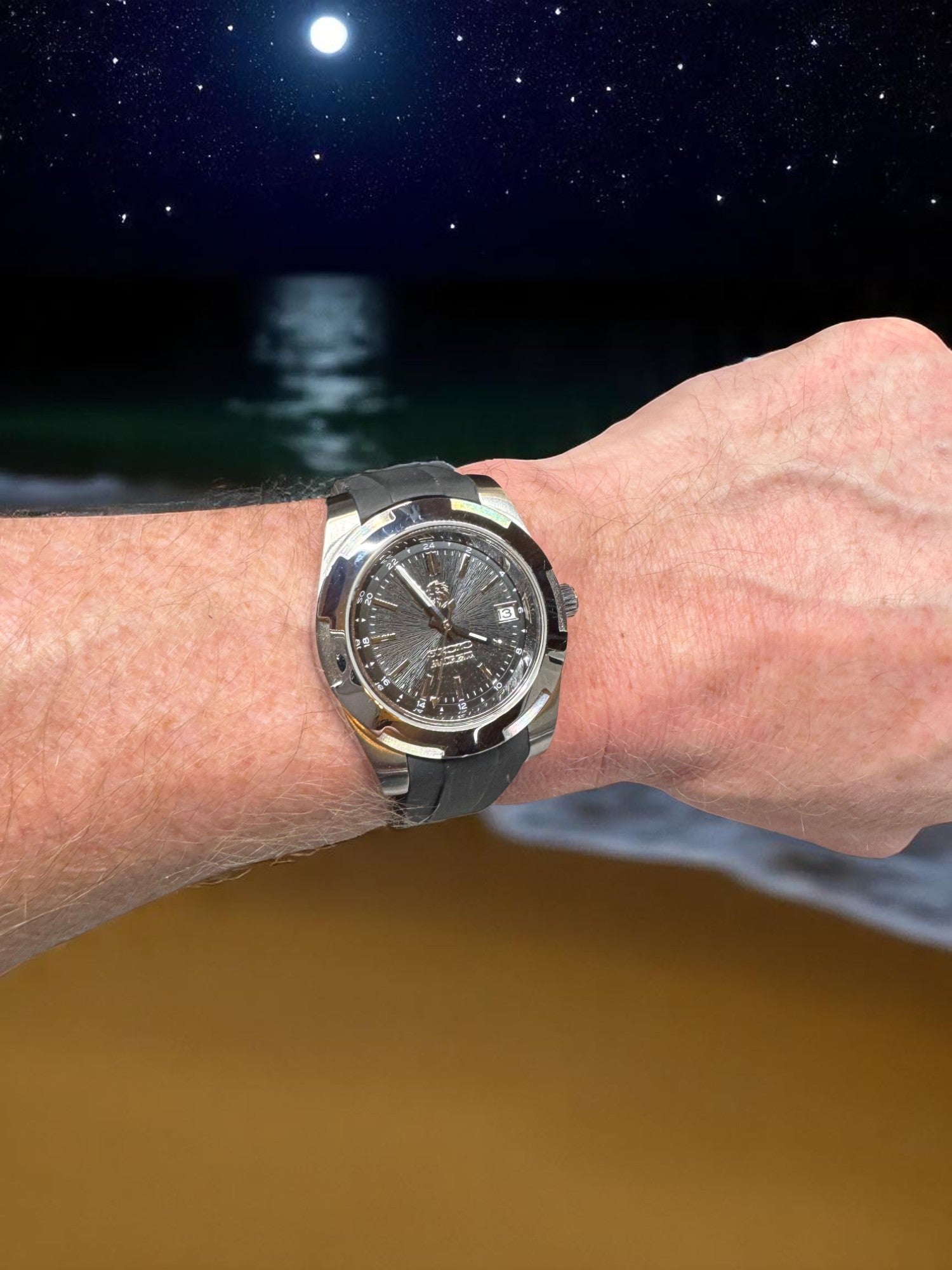 Encased in brushed stainless steel with strong geometric lugs and paired with a durable black rubber strap, the Noctis balances bold design with utilitarian purpose. A subtle 24-hour inner ring offers tracking across time zones, while the automatic movement ensures constant, deliberate motion—like the Stoic who walks unseen but never without direction.