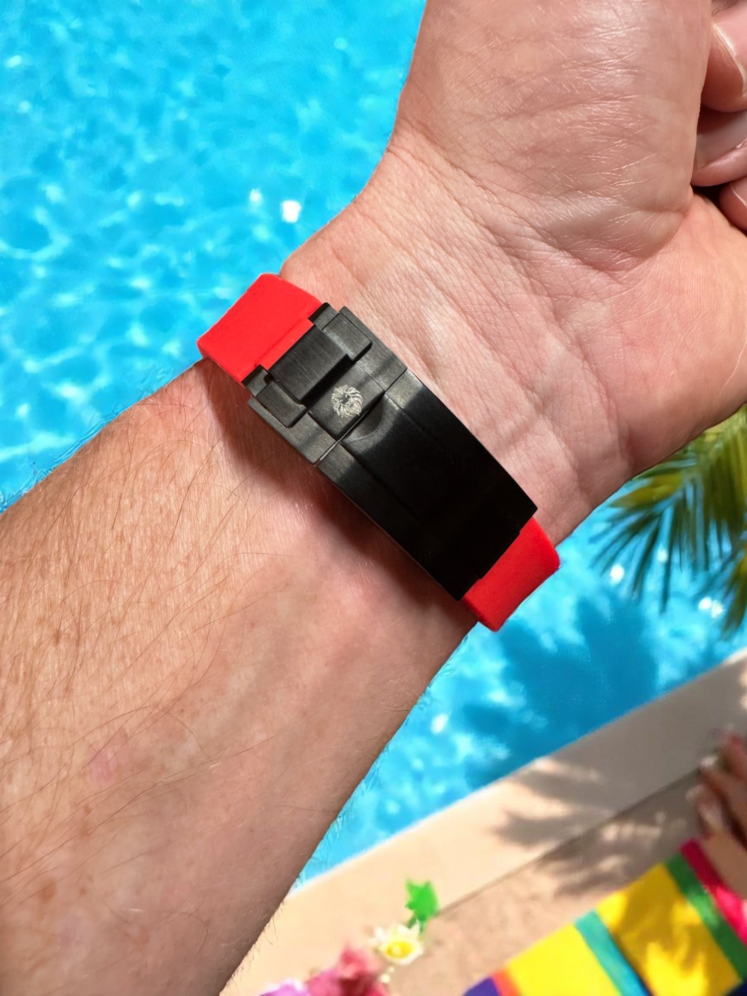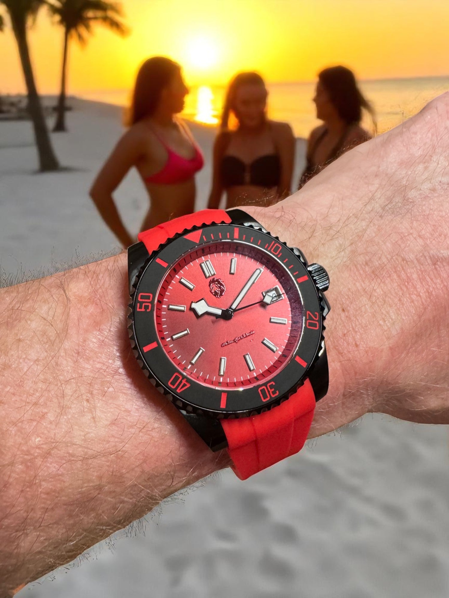 The Pyra is fire on the wrist—a timepiece that radiates boldness, clarity, and presence. Inspired by the Stoic virtue of courage, this diver-style watch is built for those who venture beyond the comfortable and embrace discomfort with purpose. The vibrant red dial and matching silicone strap ignite a sense of motion, while the black bezel and case anchor it in strength and control.