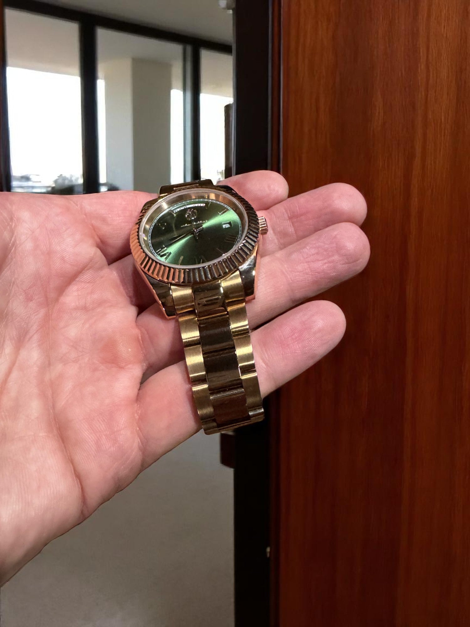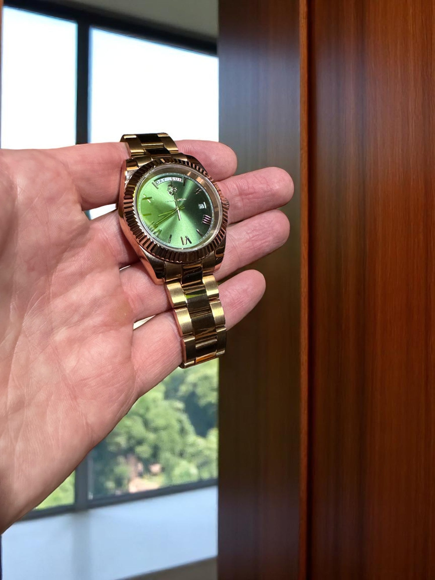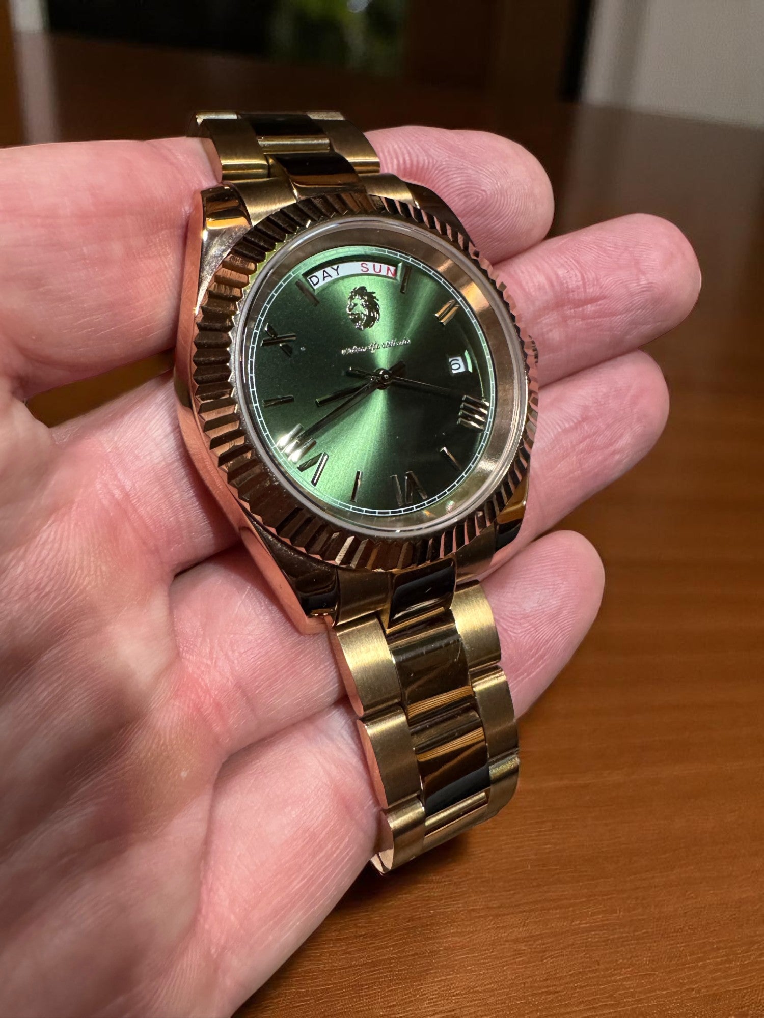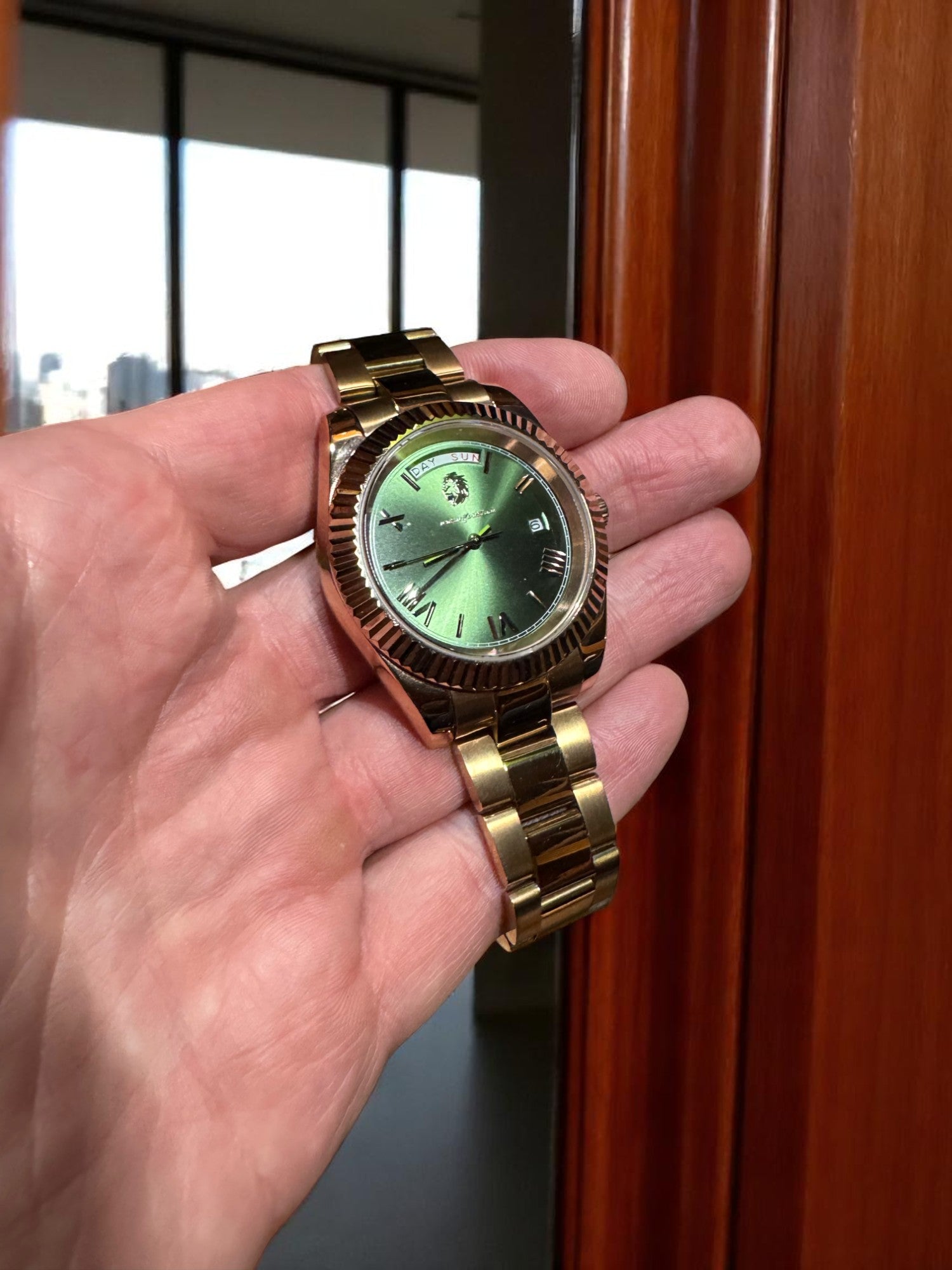 The Regulus is a timepiece of dignified strength and quiet power—named after the brightest star in Leo, a symbol of leadership, courage, and clarity. Featuring a sunburst emerald green dial housed within a polished rose gold case and fluted bezel, the Regulus radiates classical elegance with modern resolve.