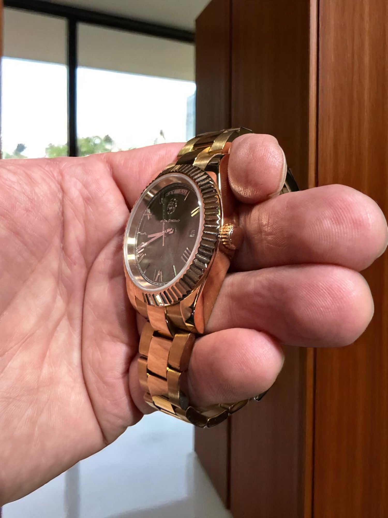 The full day and date display echoes the Stoic commitment to presence—honoring each moment as it comes. Roman numeral markers, sleek hands, and a brushed gold bracelet bring sophistication and substance to every wrist. This is not just a dress watch—it’s a declaration of intention.