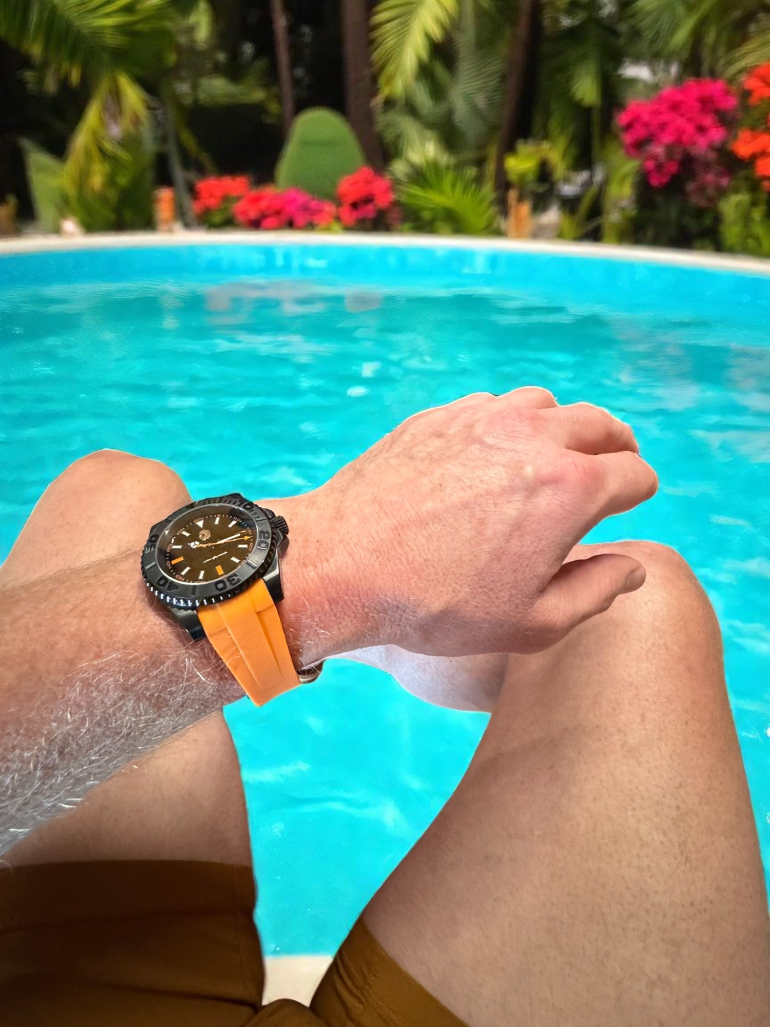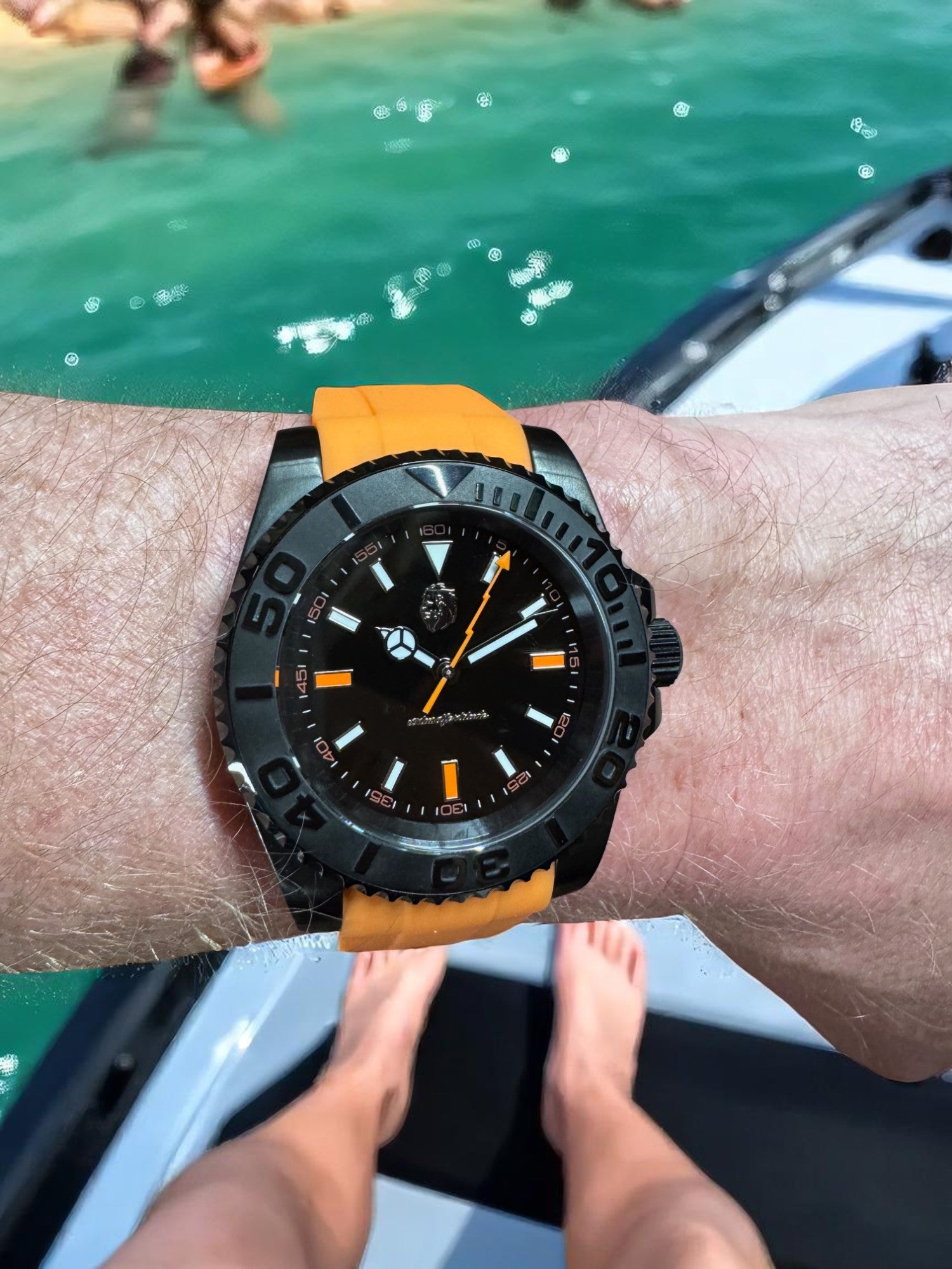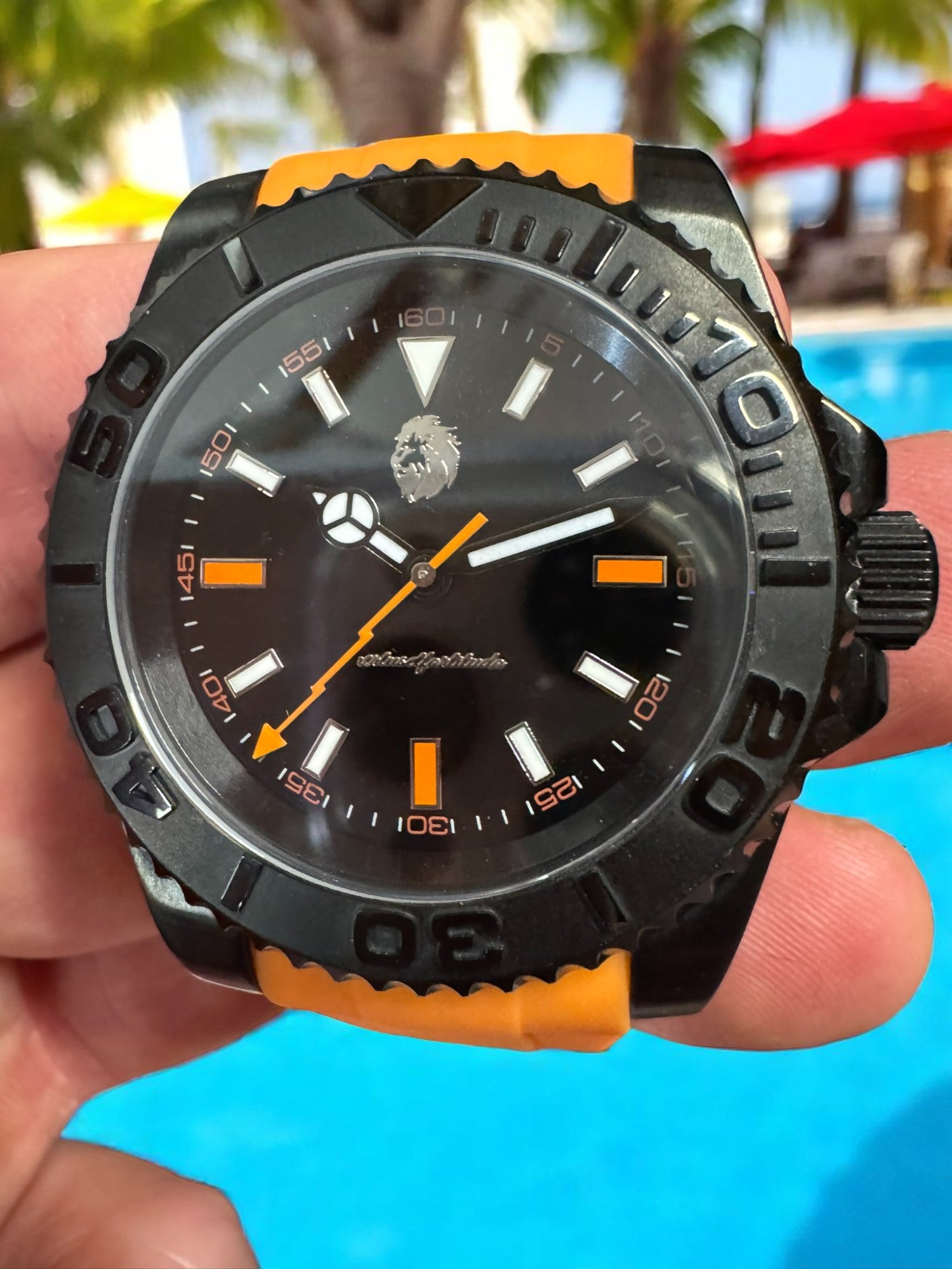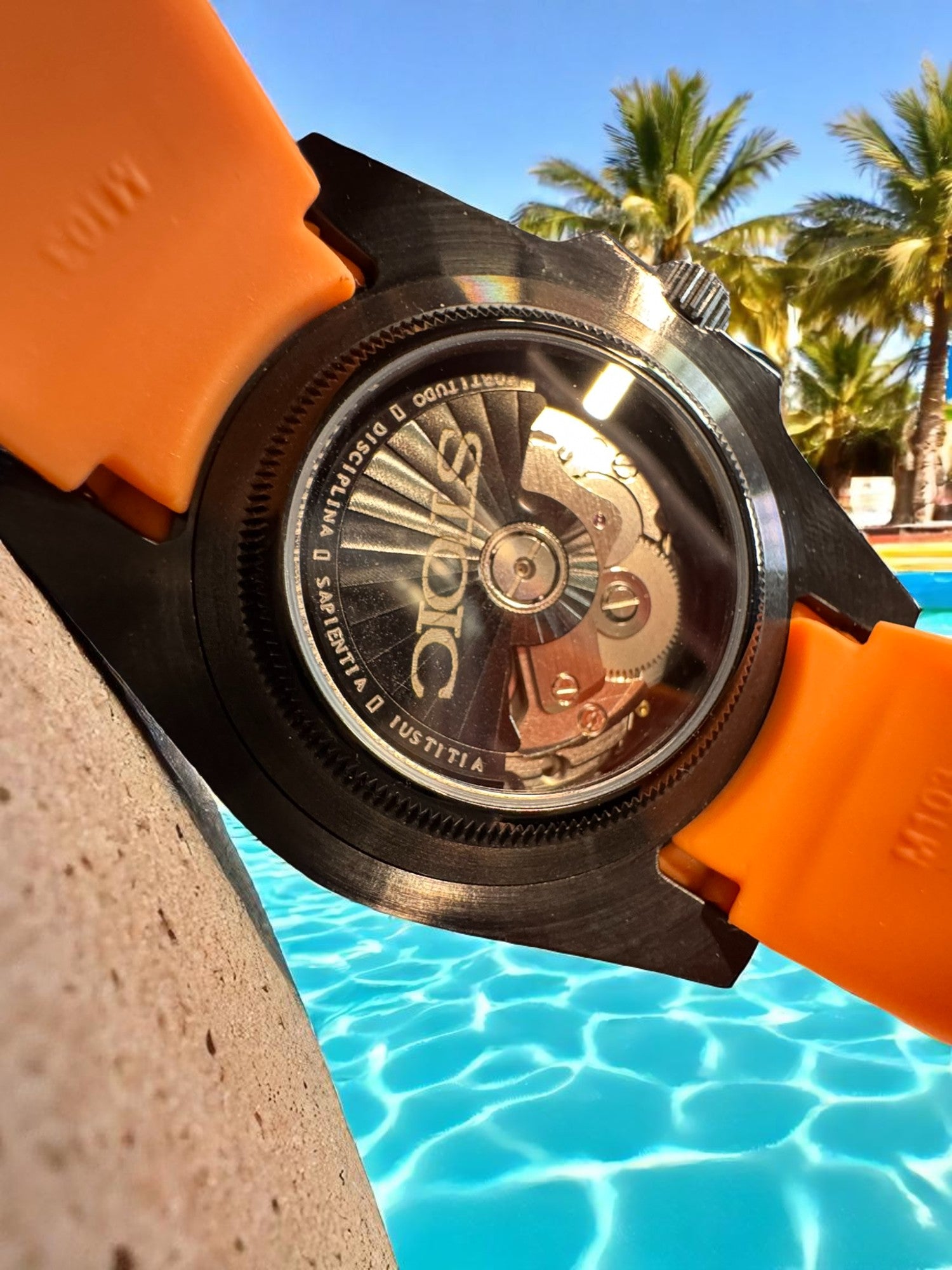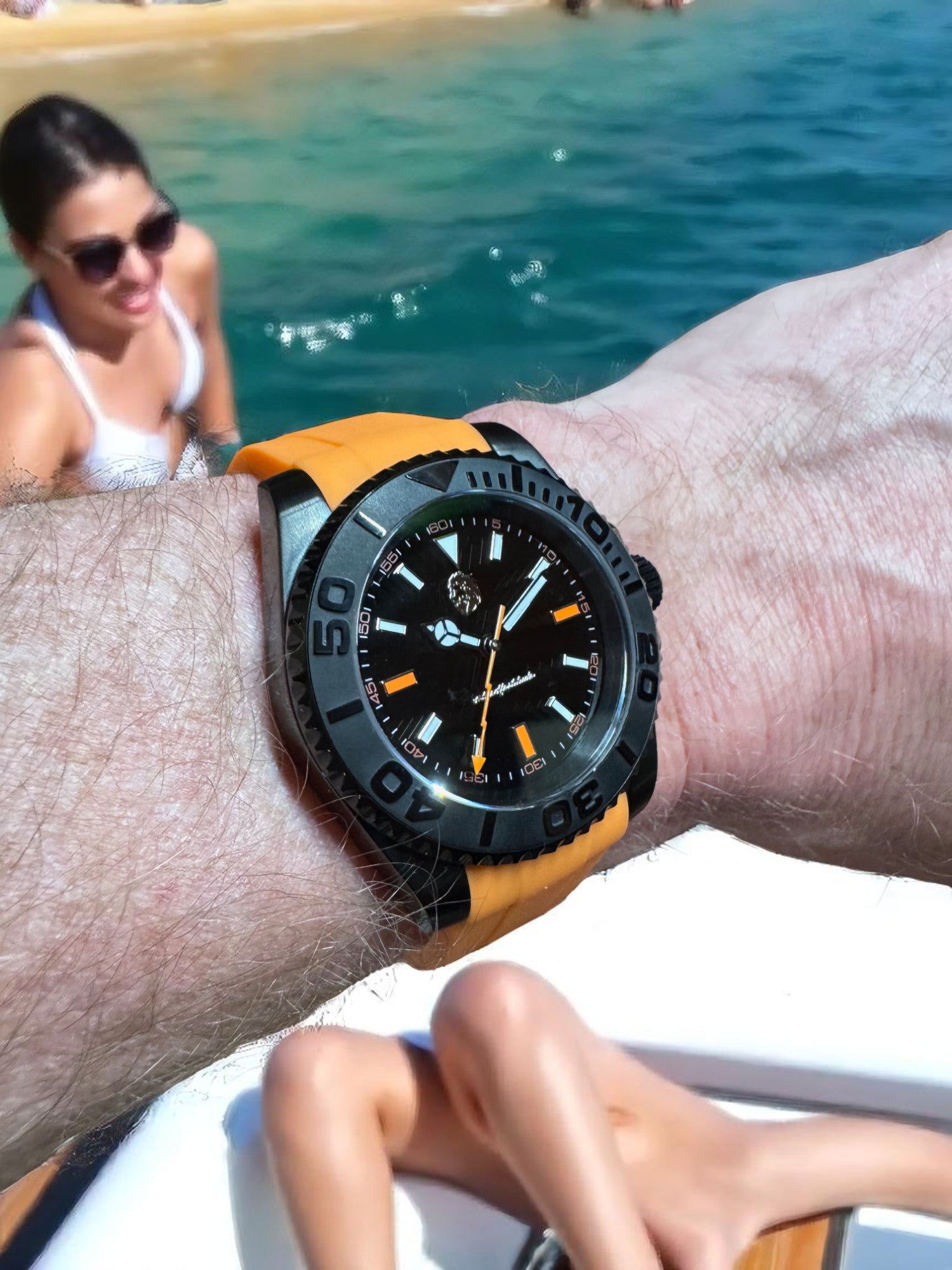 The Thalor is forged for the frontier—whether oceanic or internal. Named from “Thalassa” (sea) and “Valor,” this timepiece reflects the Stoic ideal of courage in the face of nature’s extremes. With its matte black case, oversized diver bezel, and vibrant orange strap, the Thalor commands attention while staying rooted in purpose.