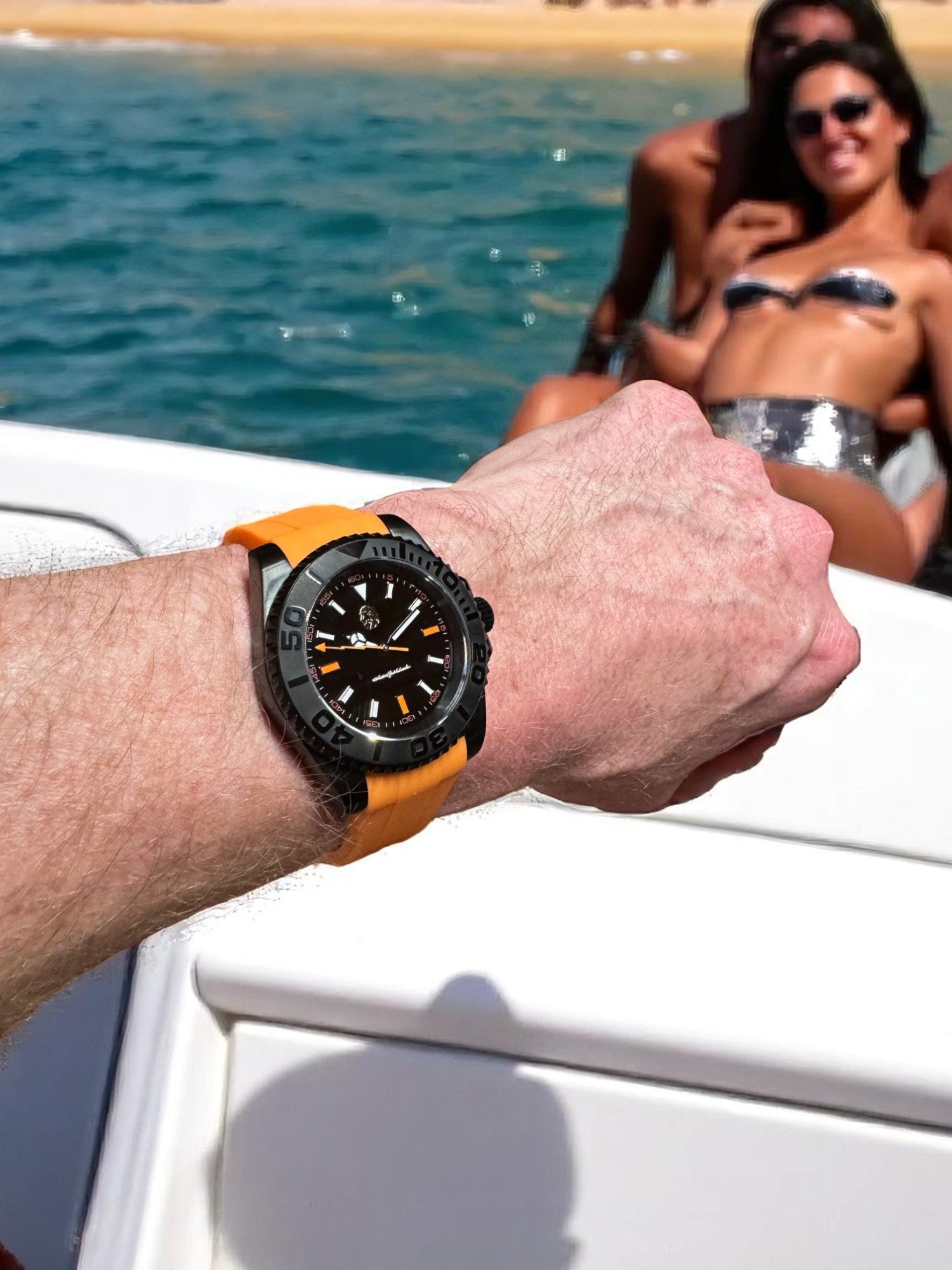 The dial is built for clarity—bold indices, high-contrast hands, and precise markings for critical timing. Powered by a reliable automatic movement and engineered for water resistance, this is a tool watch that thrives in deep water, harsh sun, and uncharted paths. A reminder that adversity is the true training ground of the soul.