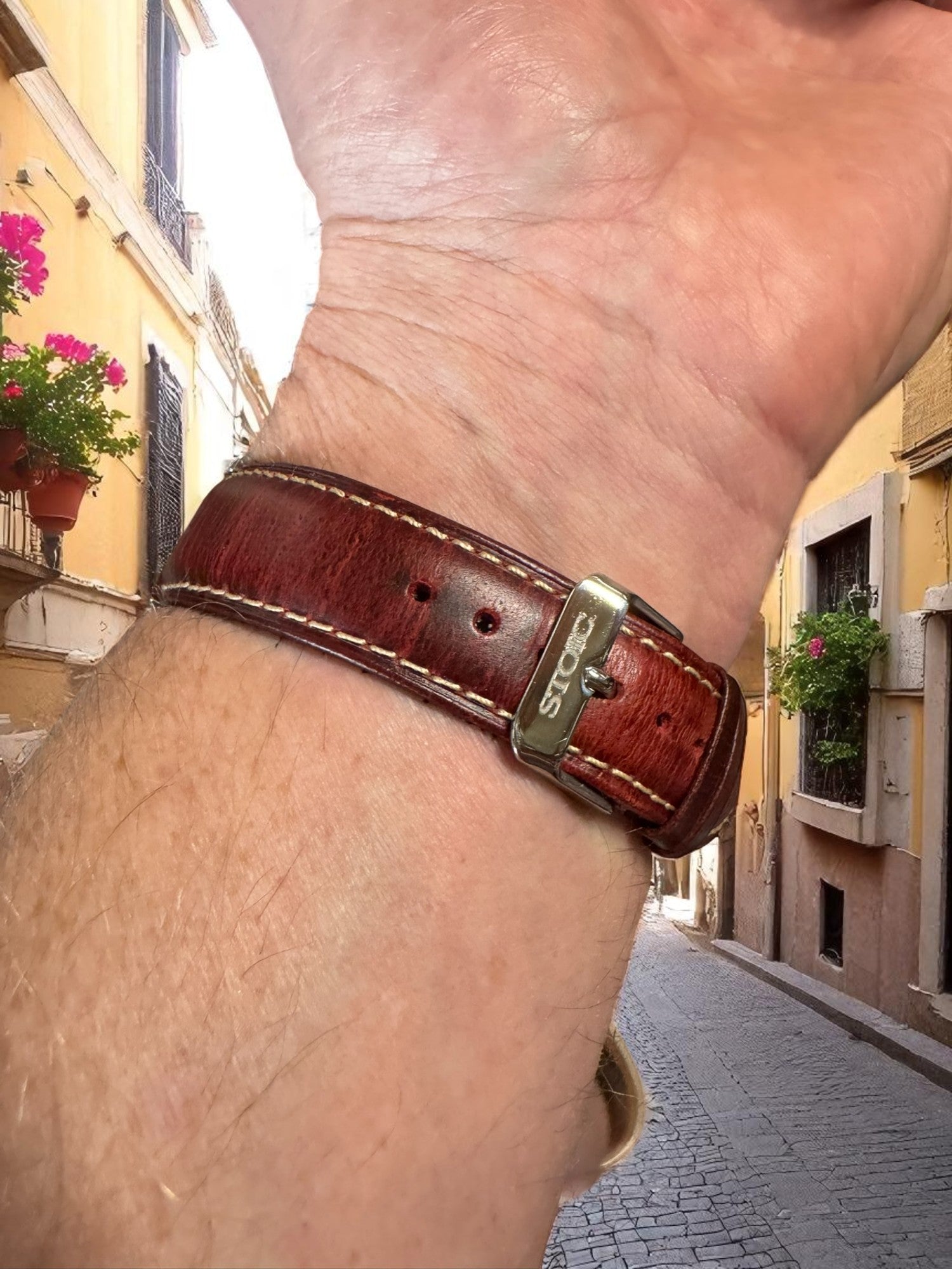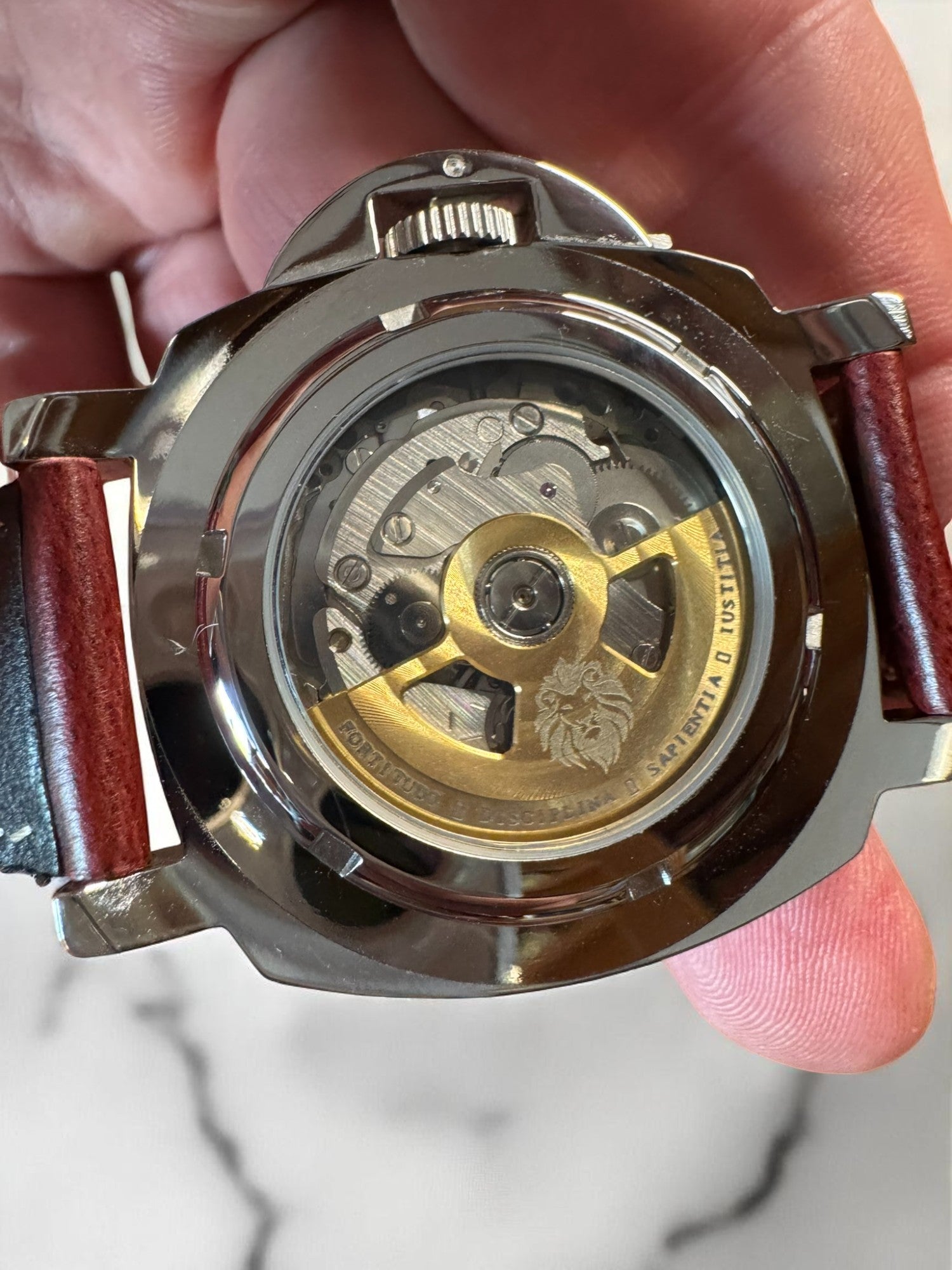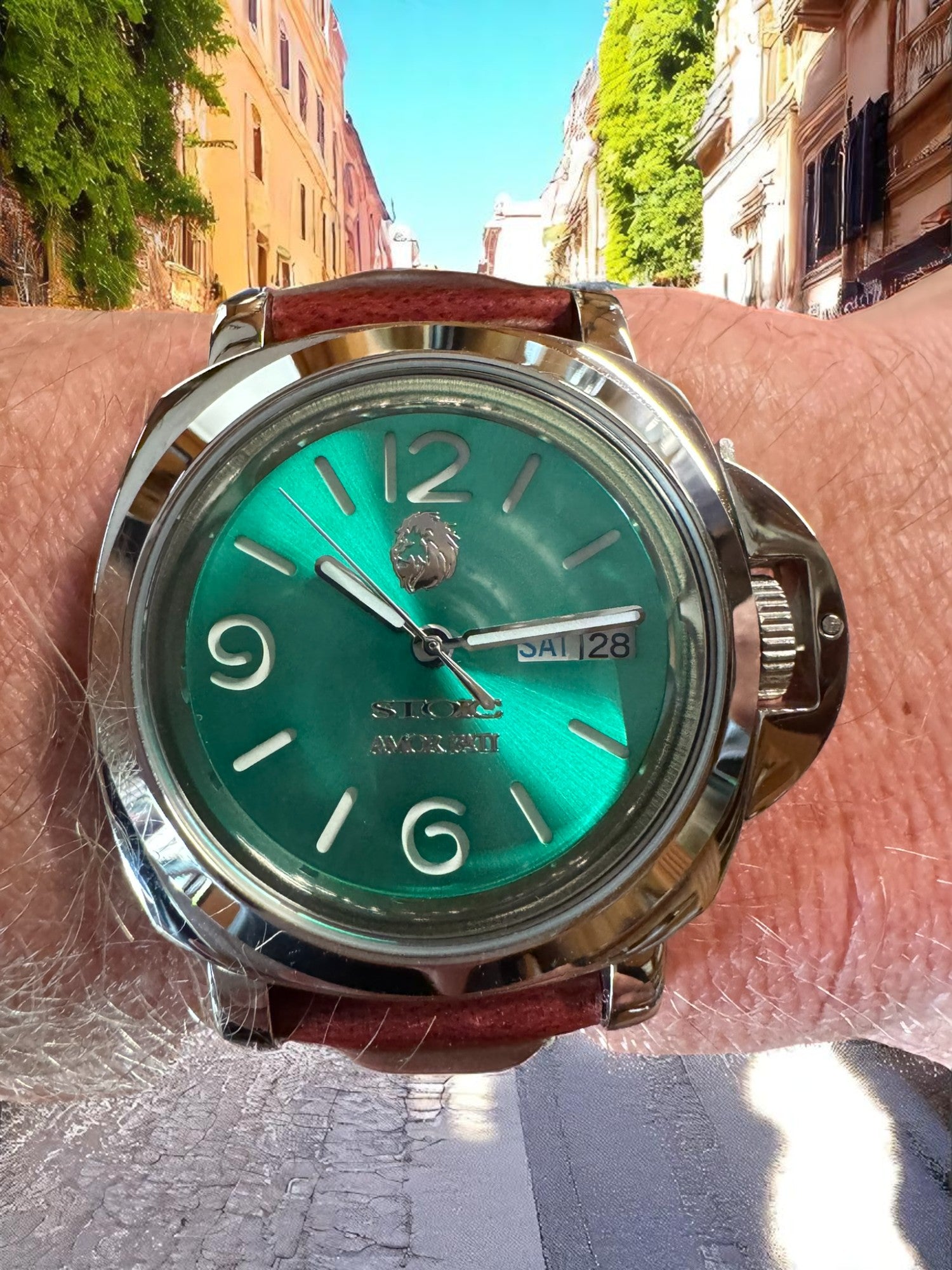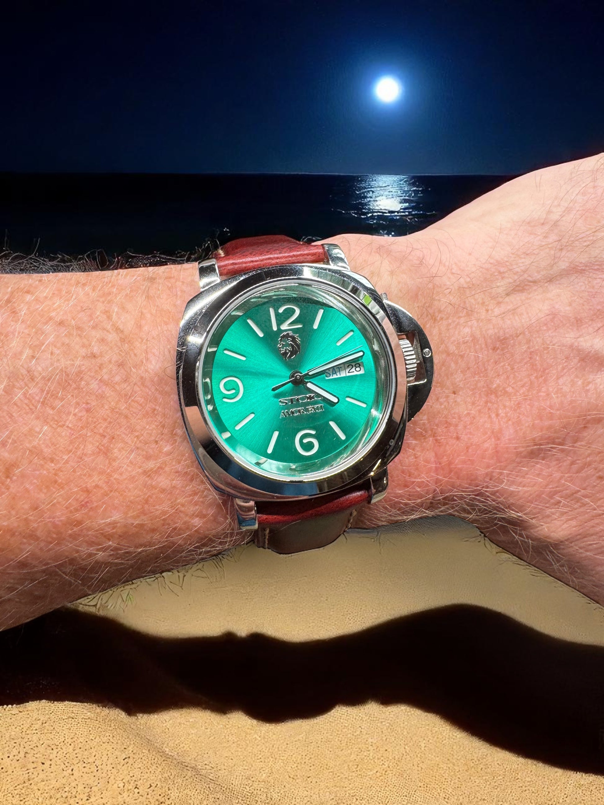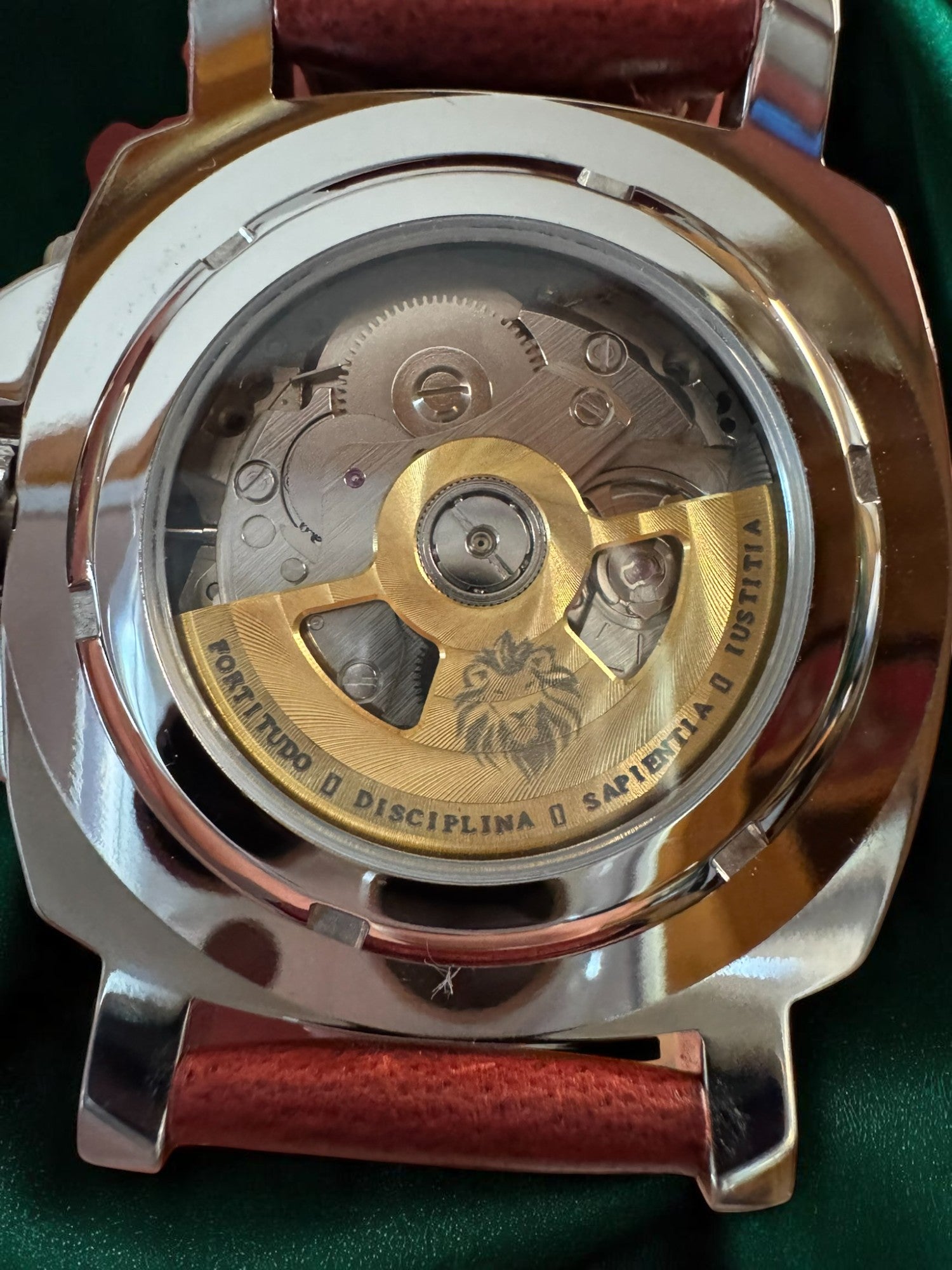 Matched with a rich oxblood leather strap and secured by a crown guard reminiscent of classic Italian dive watches, this piece honors the virtue of Courage—standing out not for its extravagance, but for its enduring presence.