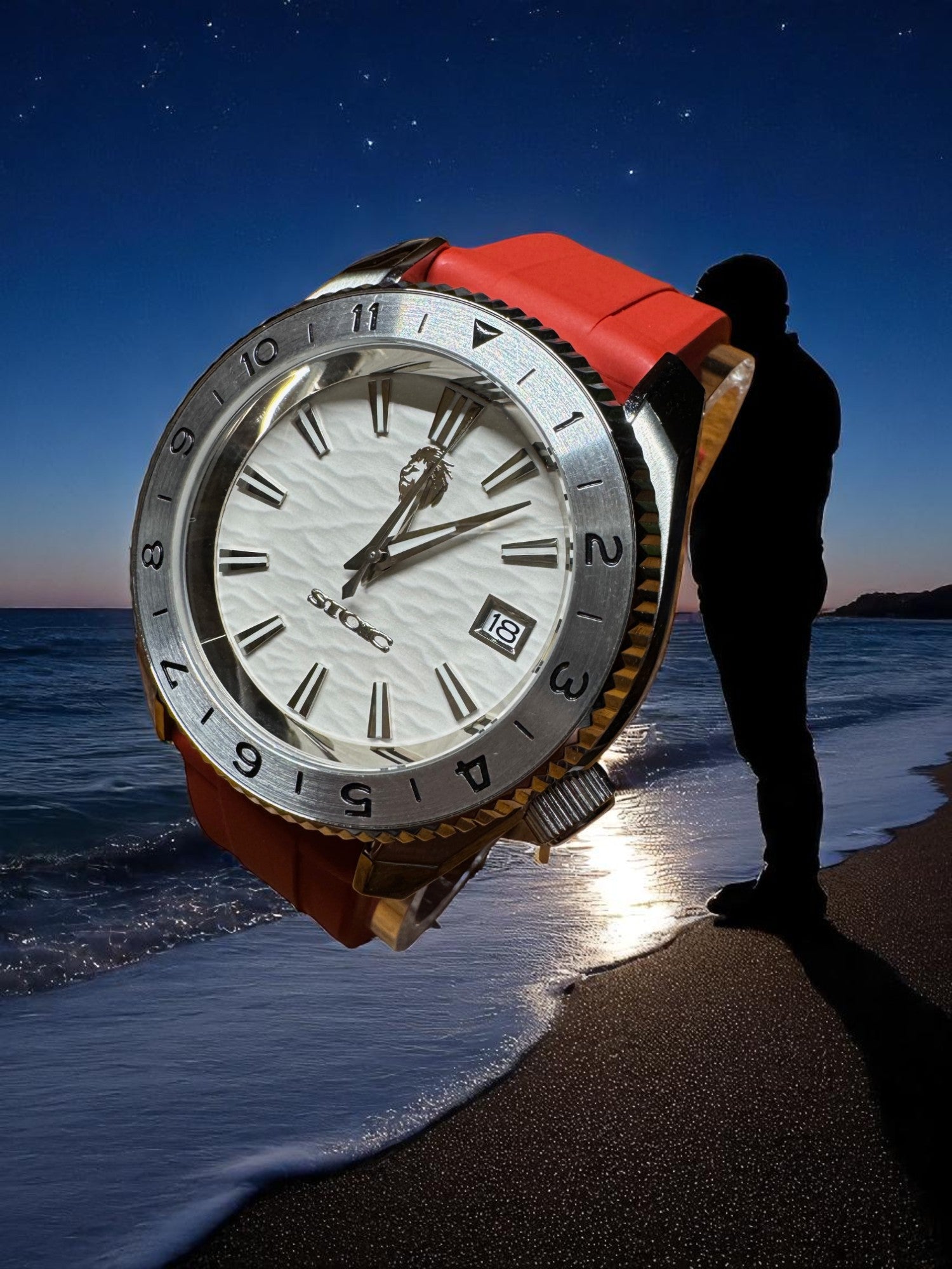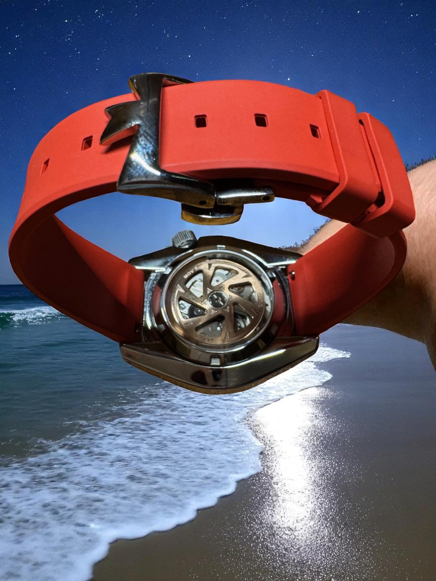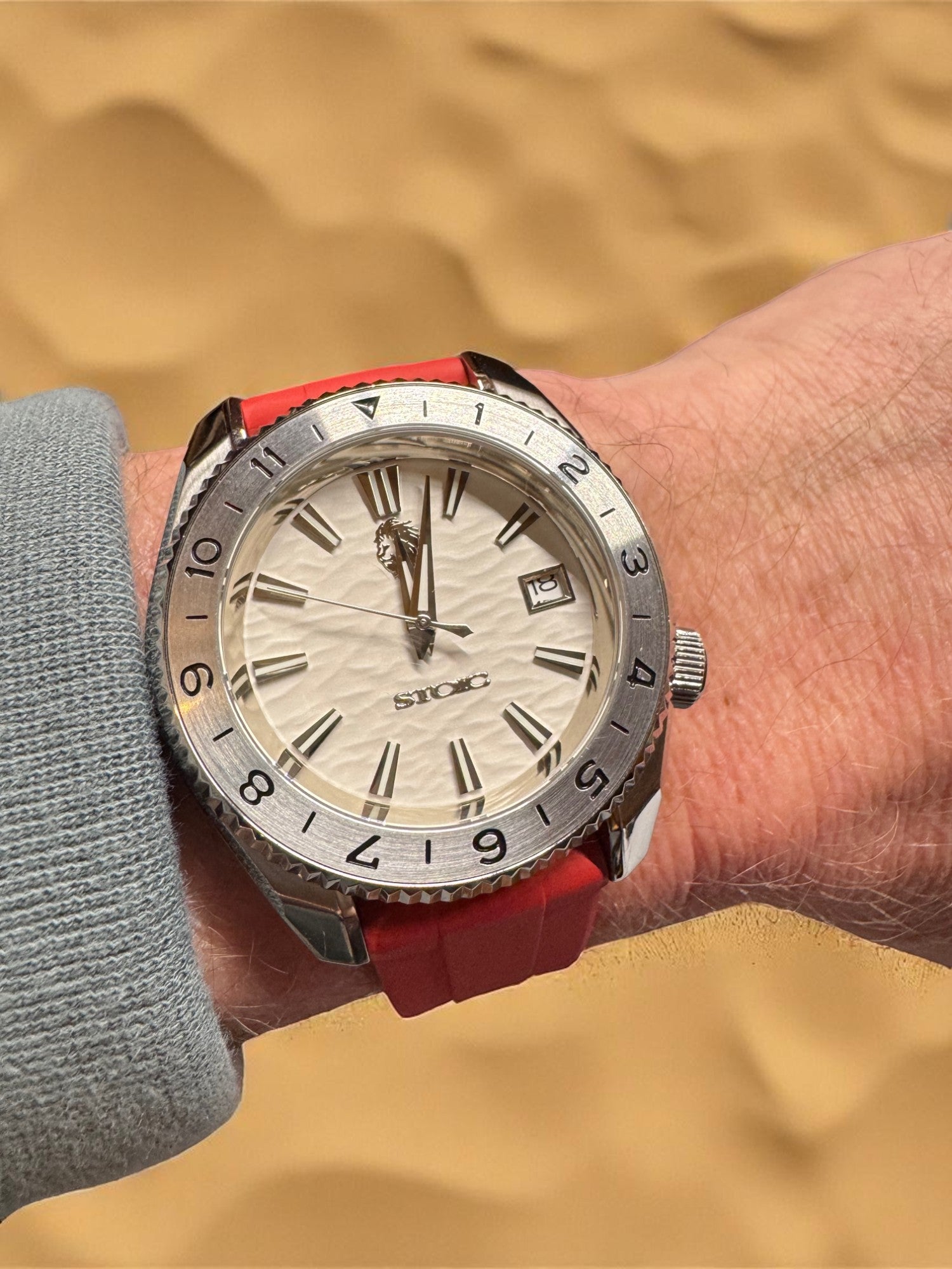 Its textured glacier-white dial evokes the quiet clarity of dawn, framed by a brushed 12-hour bezel for practical, refined tracking. Roman indices offer a classical anchor, while the crimson rubber strap delivers a jolt of restrained vitality—symbolic of the Stoic’s ability to act with intention, not impulse.