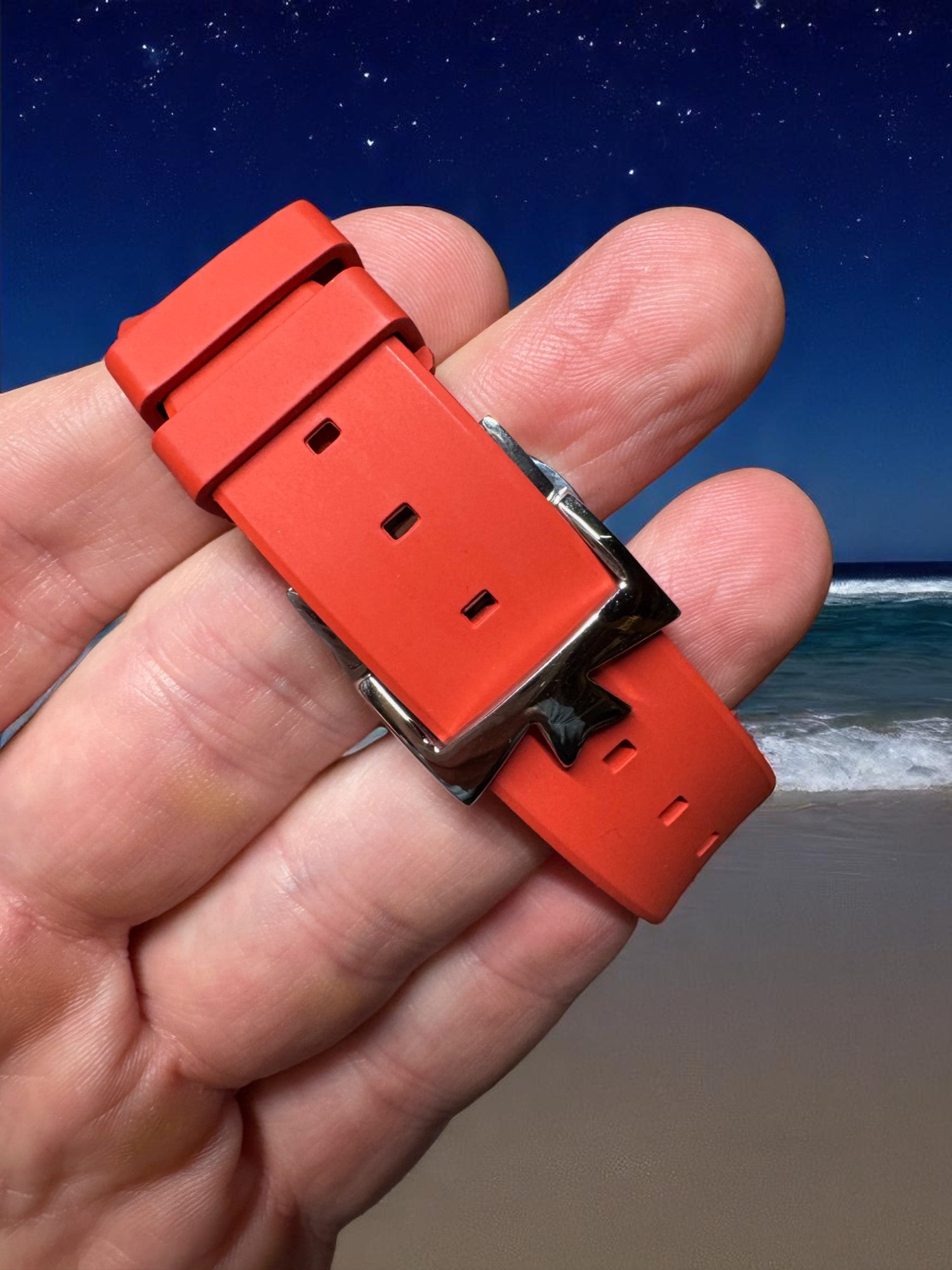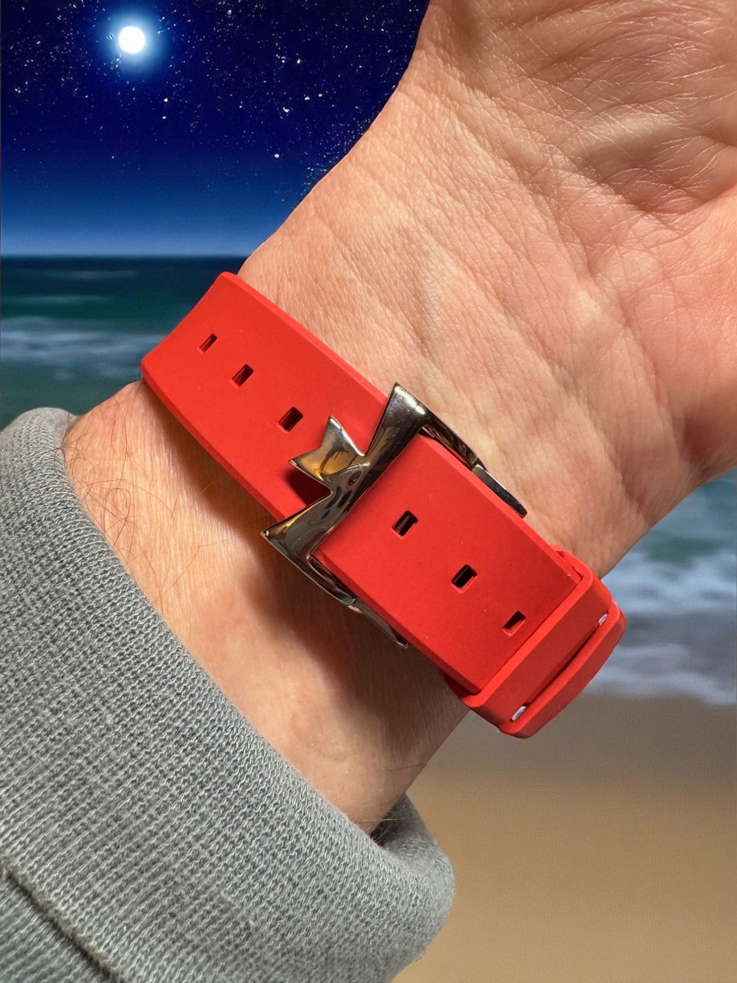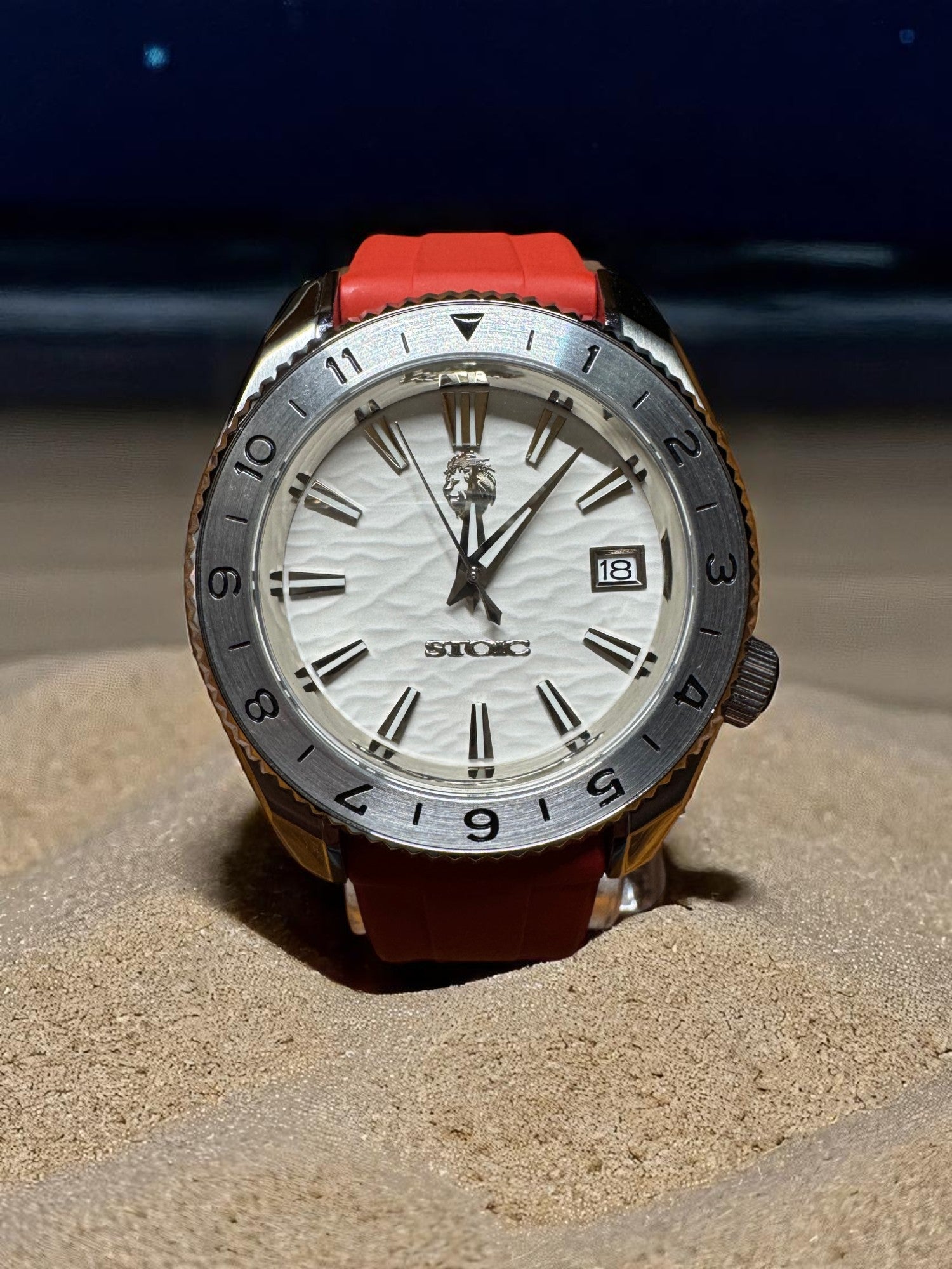 Its textured glacier-white dial evokes the quiet clarity of dawn, framed by a brushed 12-hour bezel for practical, refined tracking. Roman indices offer a classical anchor, while the crimson rubber strap delivers a jolt of restrained vitality—symbolic of the Stoic’s ability to act with intention, not impulse.