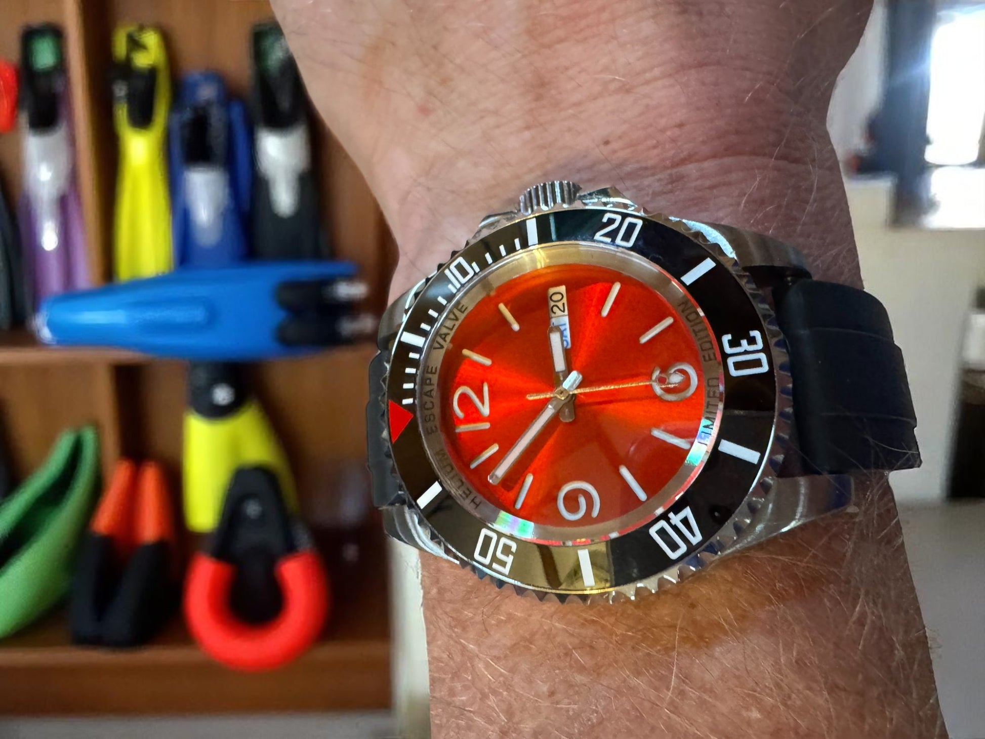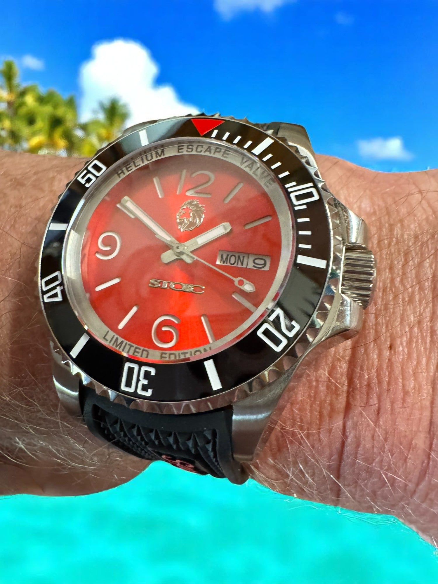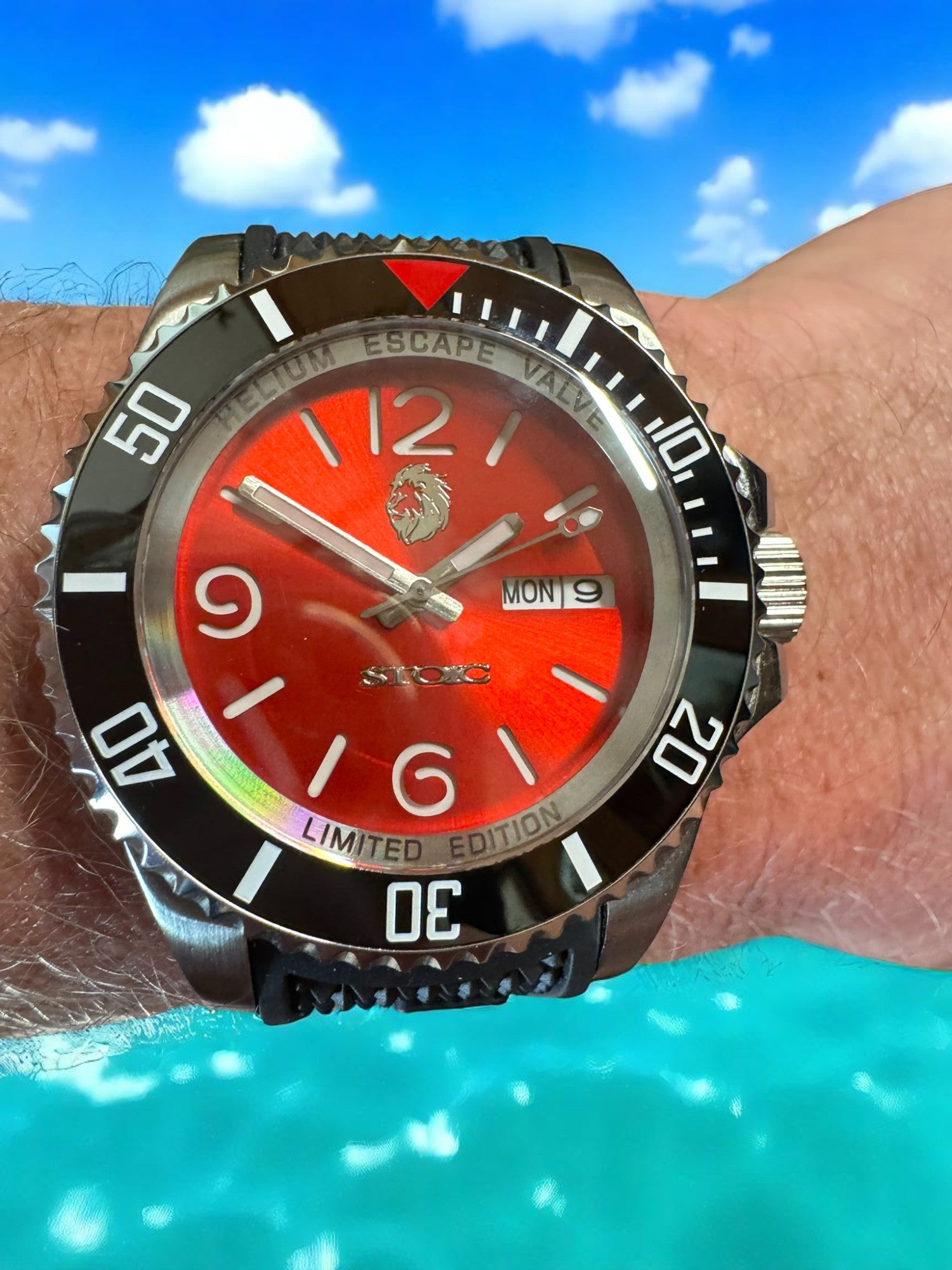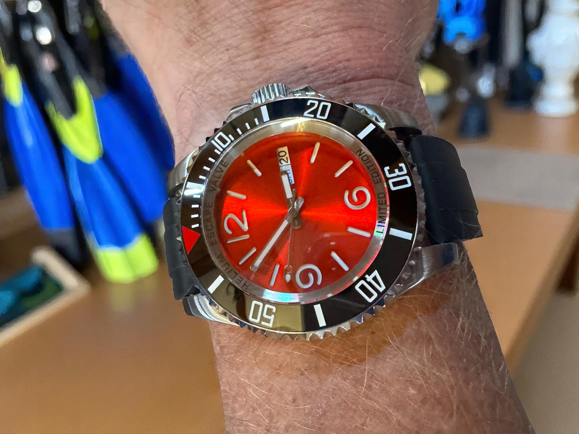 The bold 44mm stainless steel case houses an automatic movement with day-date complication, encased under sapphire glass for lasting durability. Paired with a black textured rubber strap and a precision-engineered helium escape valve, The Ignis is equally at home on a dive expedition or commanding attention above sea level.
