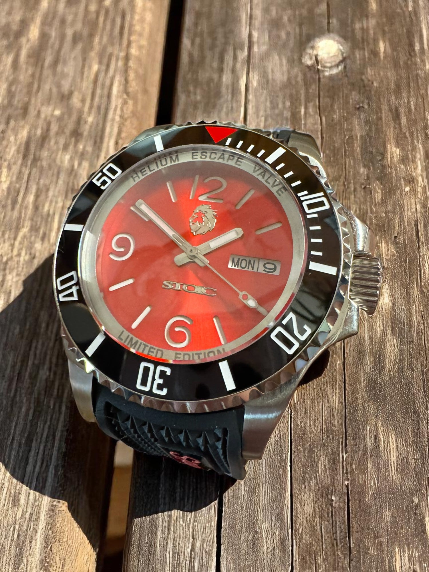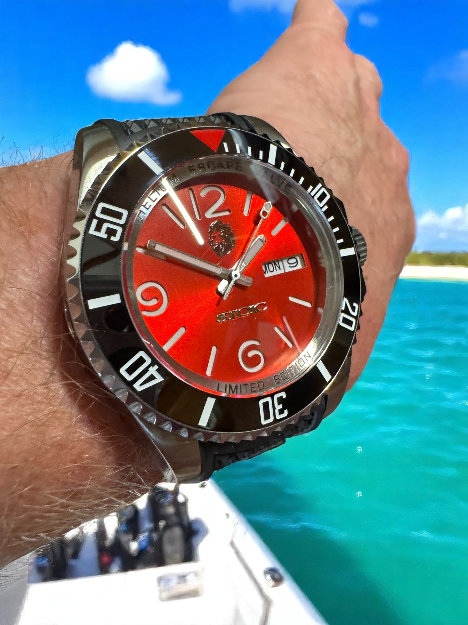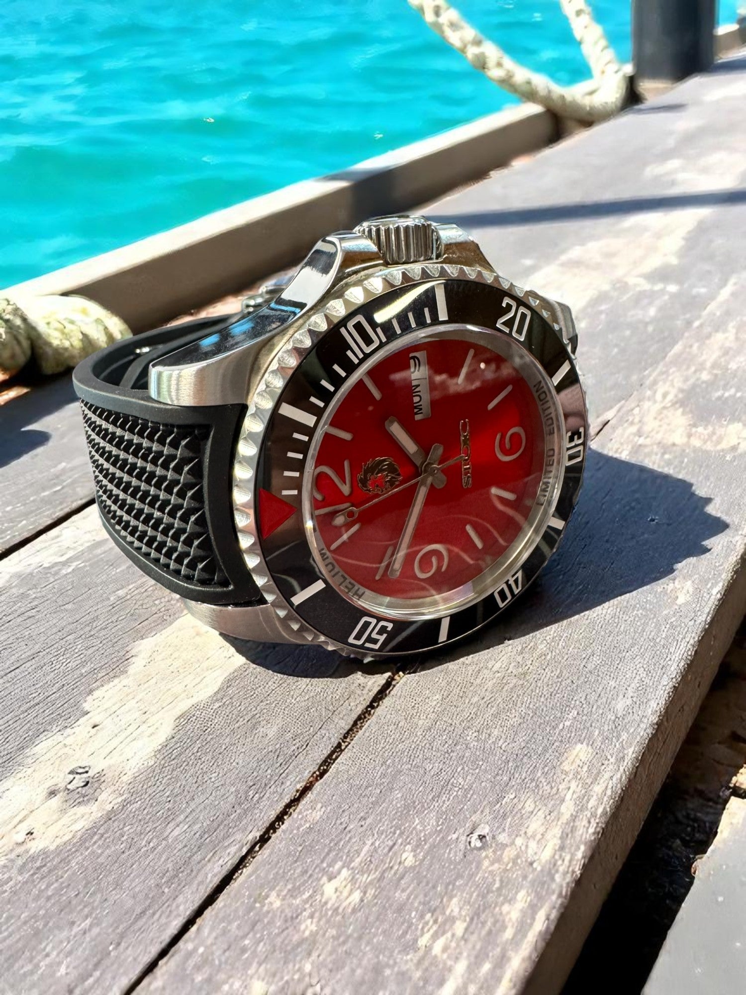 The Ignis (Latin for “fire”) is the embodiment of raw energy and fearless momentum. With its blazing red sunburst dial and tactical dive bezel, this limited edition piece is built for those who pursue life with intensity and clarity — in the water, on the move, and against the odds.