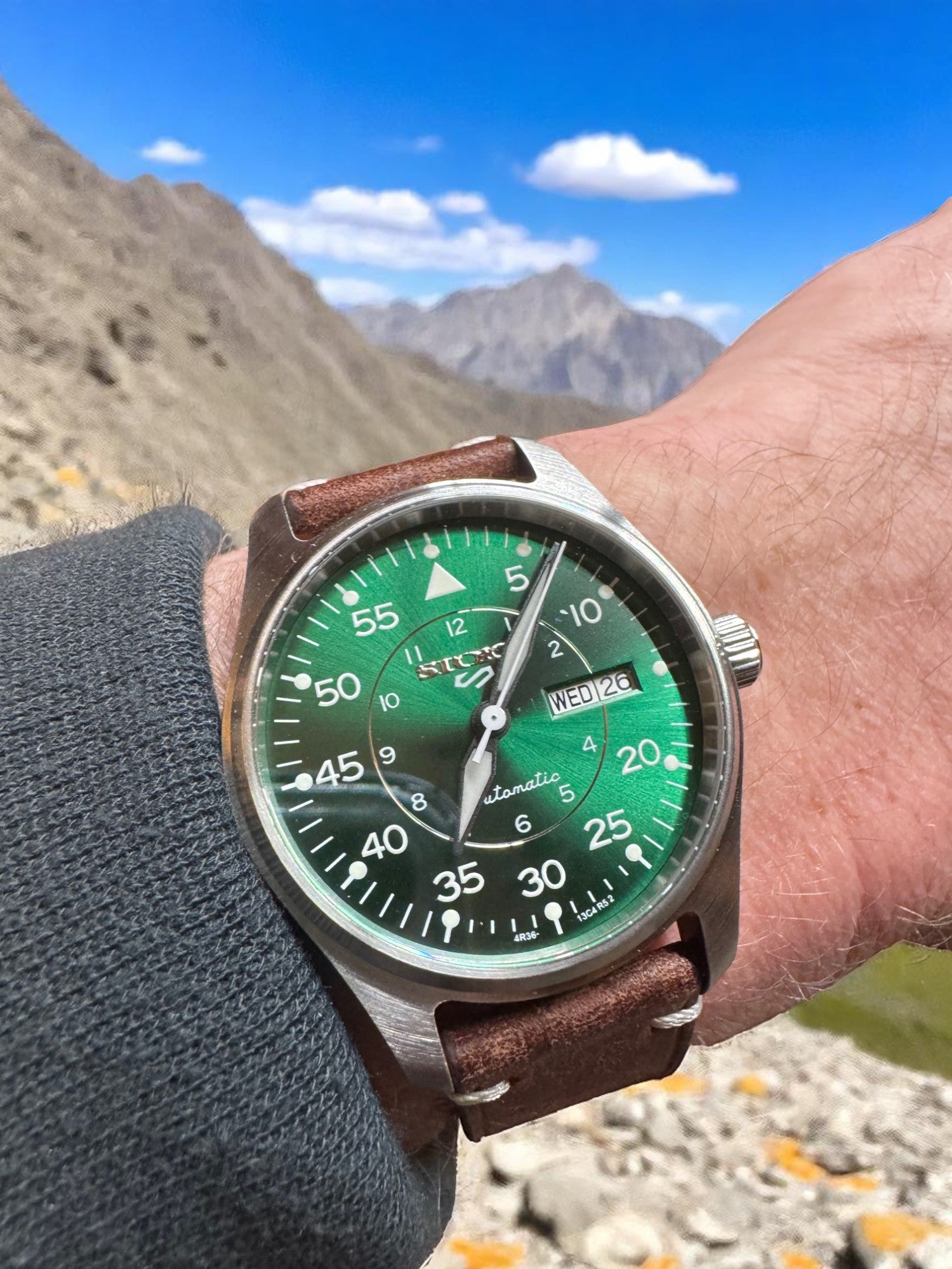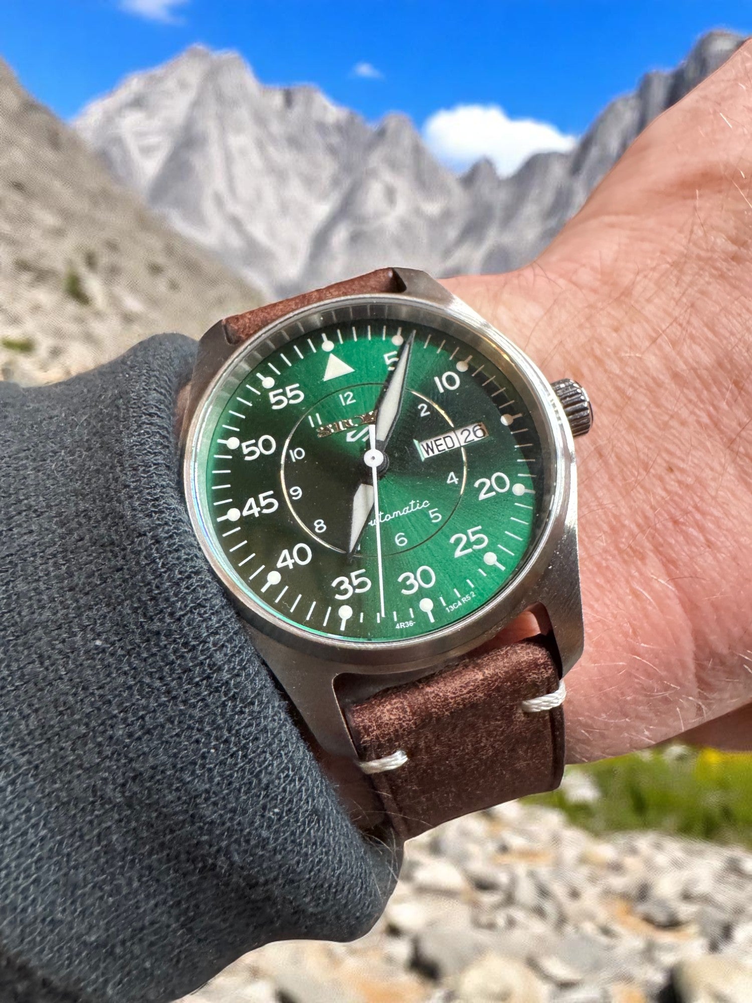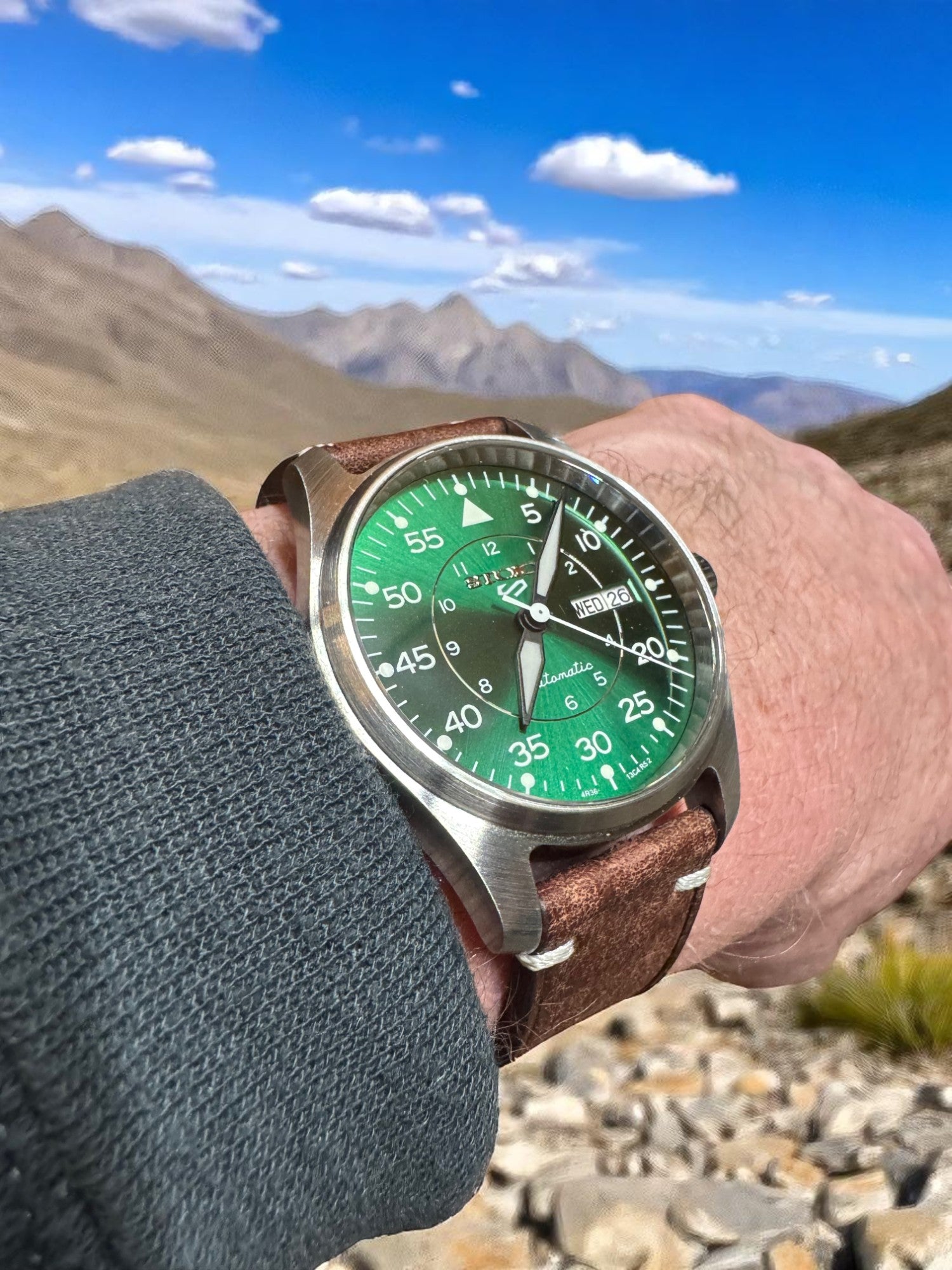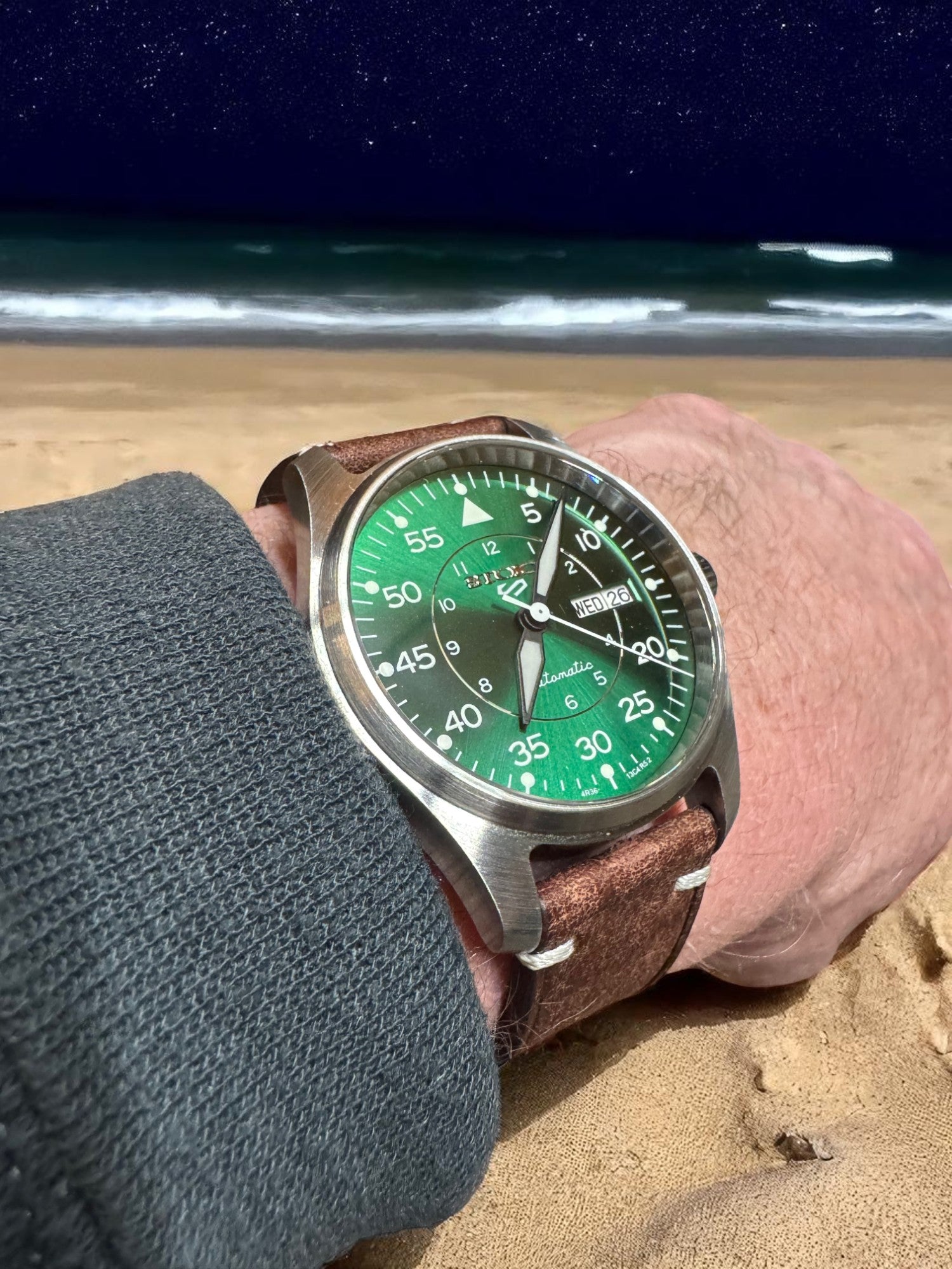 Its vivid sunburst green dial, oversized numerals, and sword-style hands ensure instant legibility, even in low light or high altitude. The day-date complication adds practicality for the grounded Stoic, while the brushed stainless steel case and aged leather strap provide durability and warmth in equal measure.