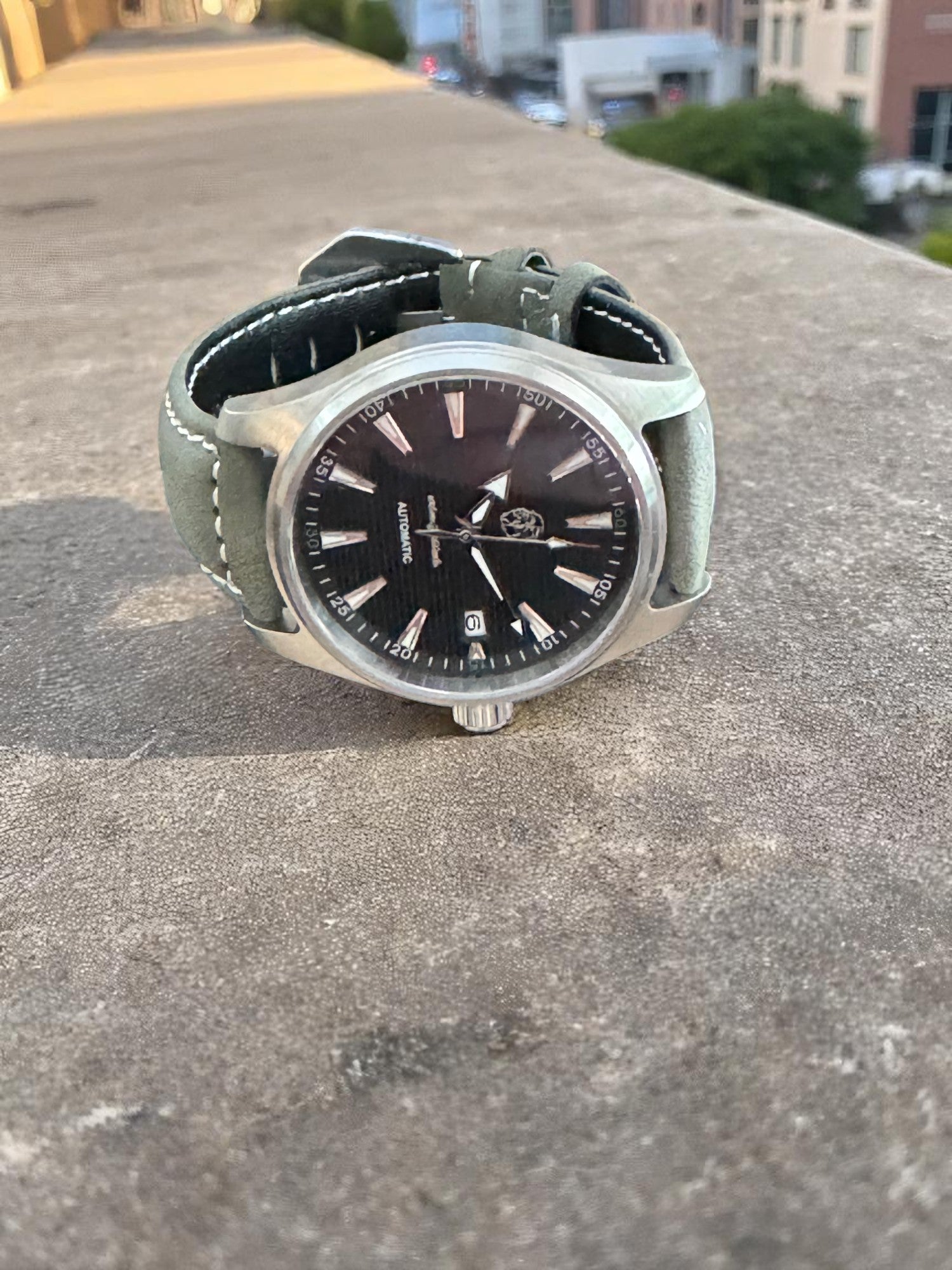 Strap: Olive leather with contrast stitching