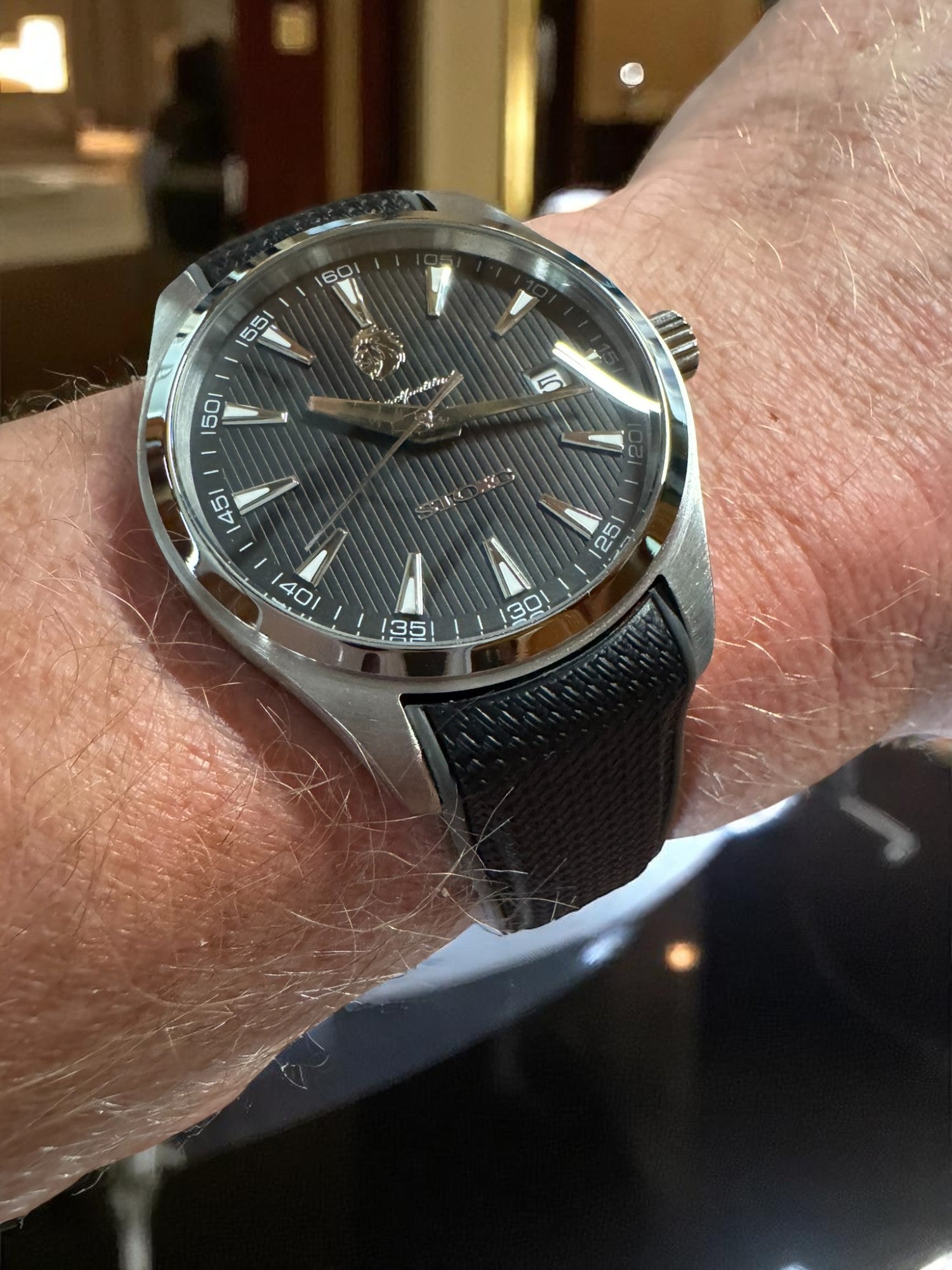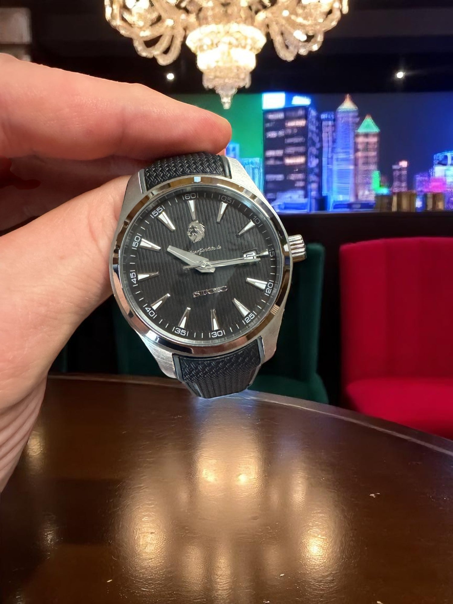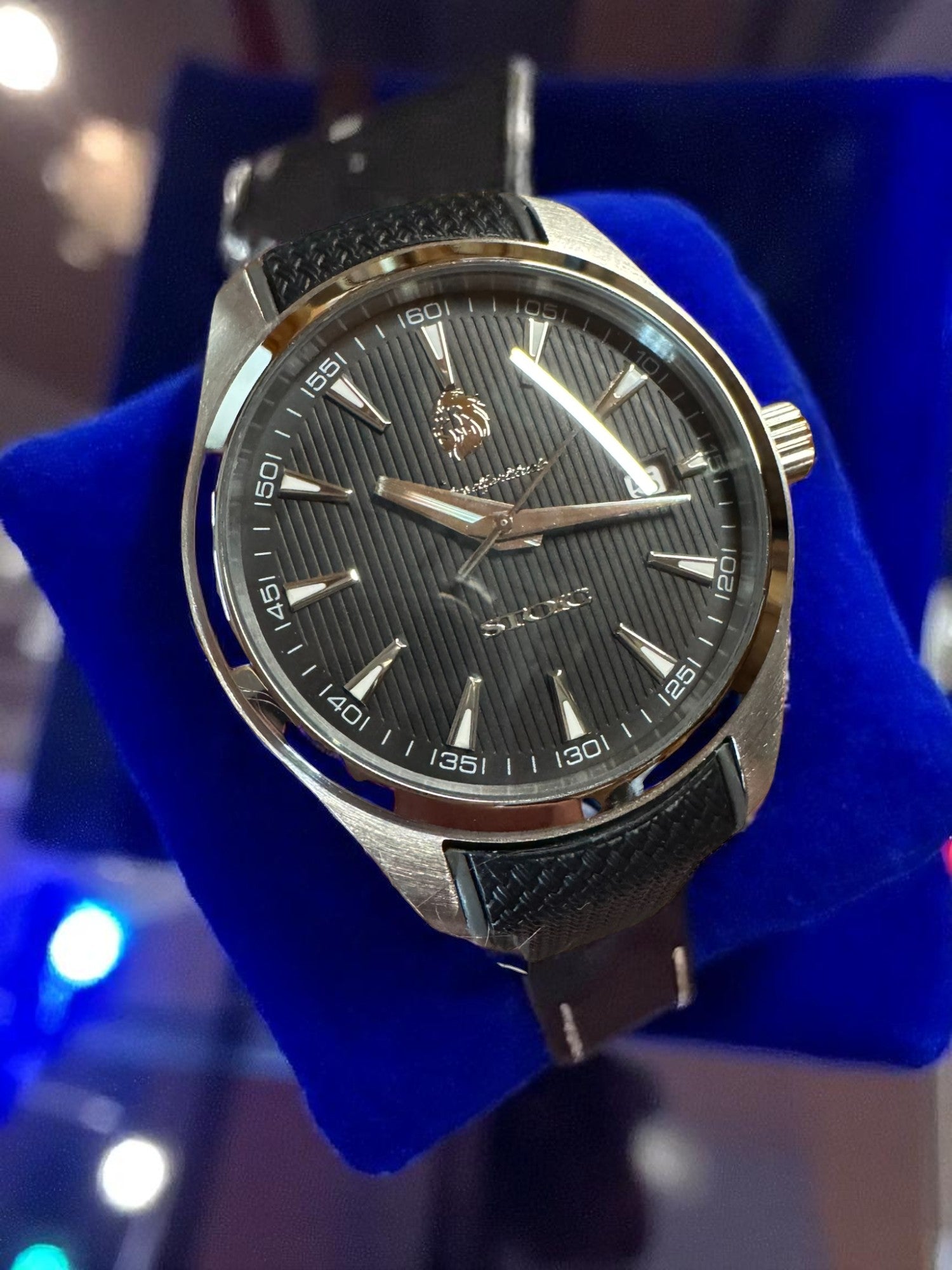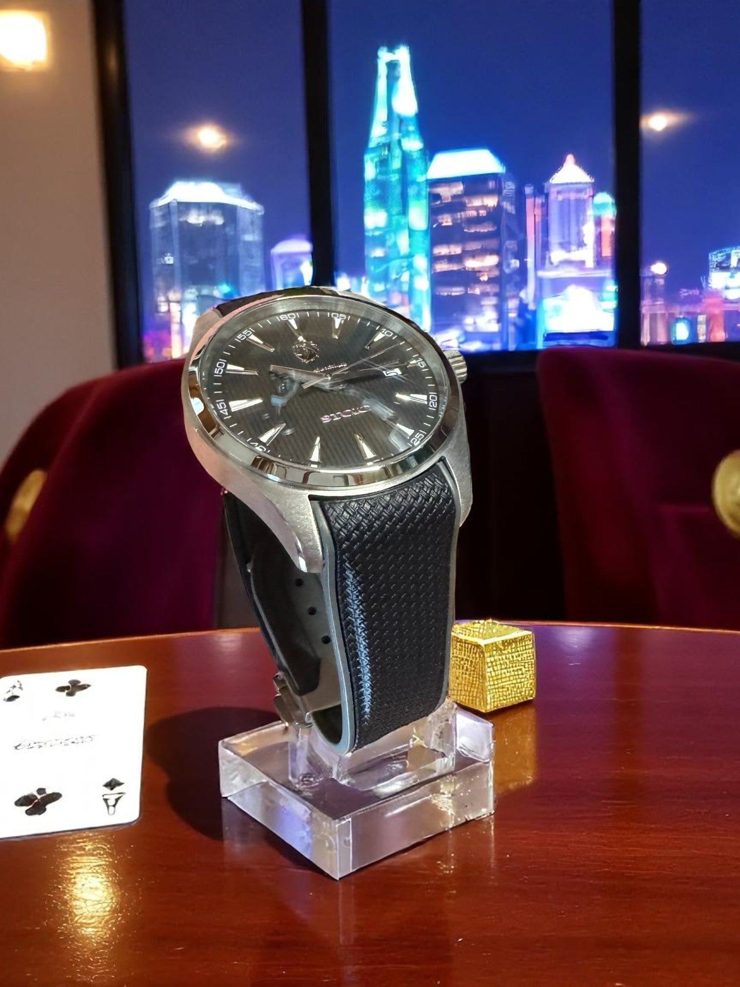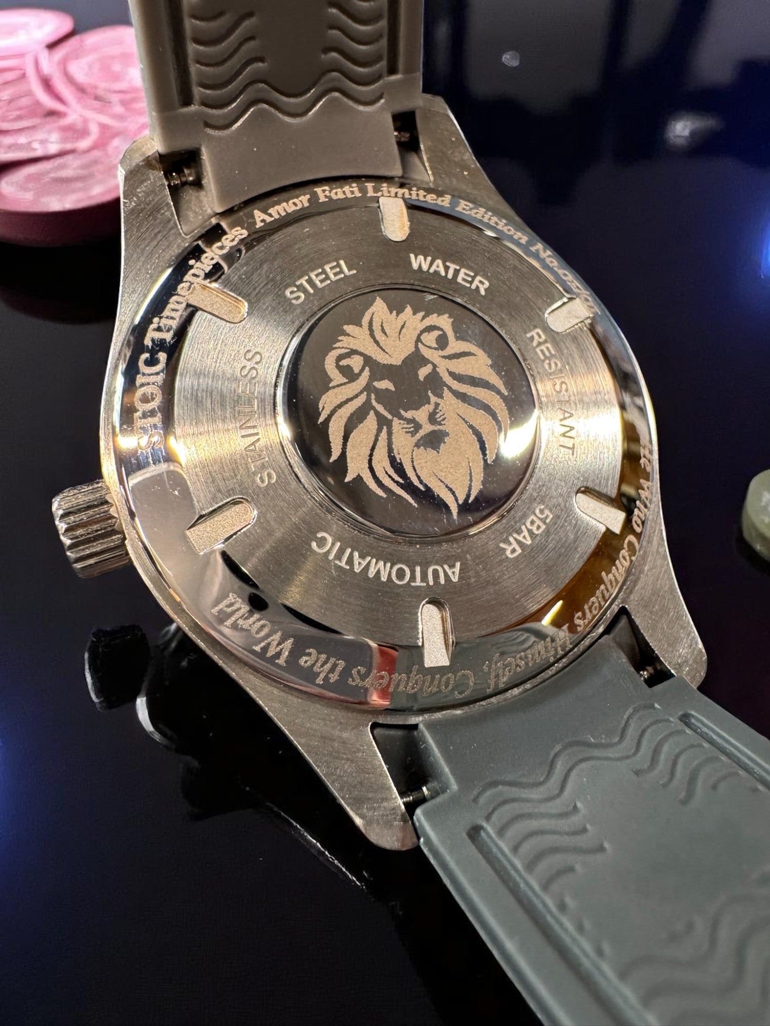 Command presence without saying a word. The Sovereign is the quintessential Stoic dress watch—refined, confident, and purpose-built. A black sunray dial with vertical texture offers subtle depth, accented by polished silver indices and sword hands. The robust yet elegant stainless steel case is paired with a black textured rubber strap and engraved deployant clasp. The exhibition caseback reveals a decorated movement with the Stoic lion emblem and the inscription: “He Who Conquers Himself, Conquers the World.” A timepiece built for those who lead from within.