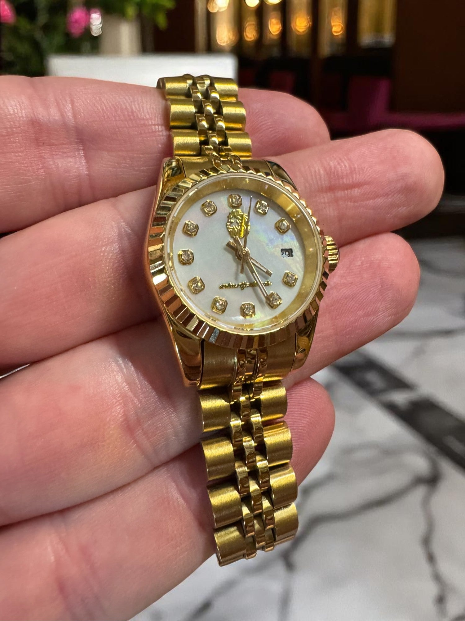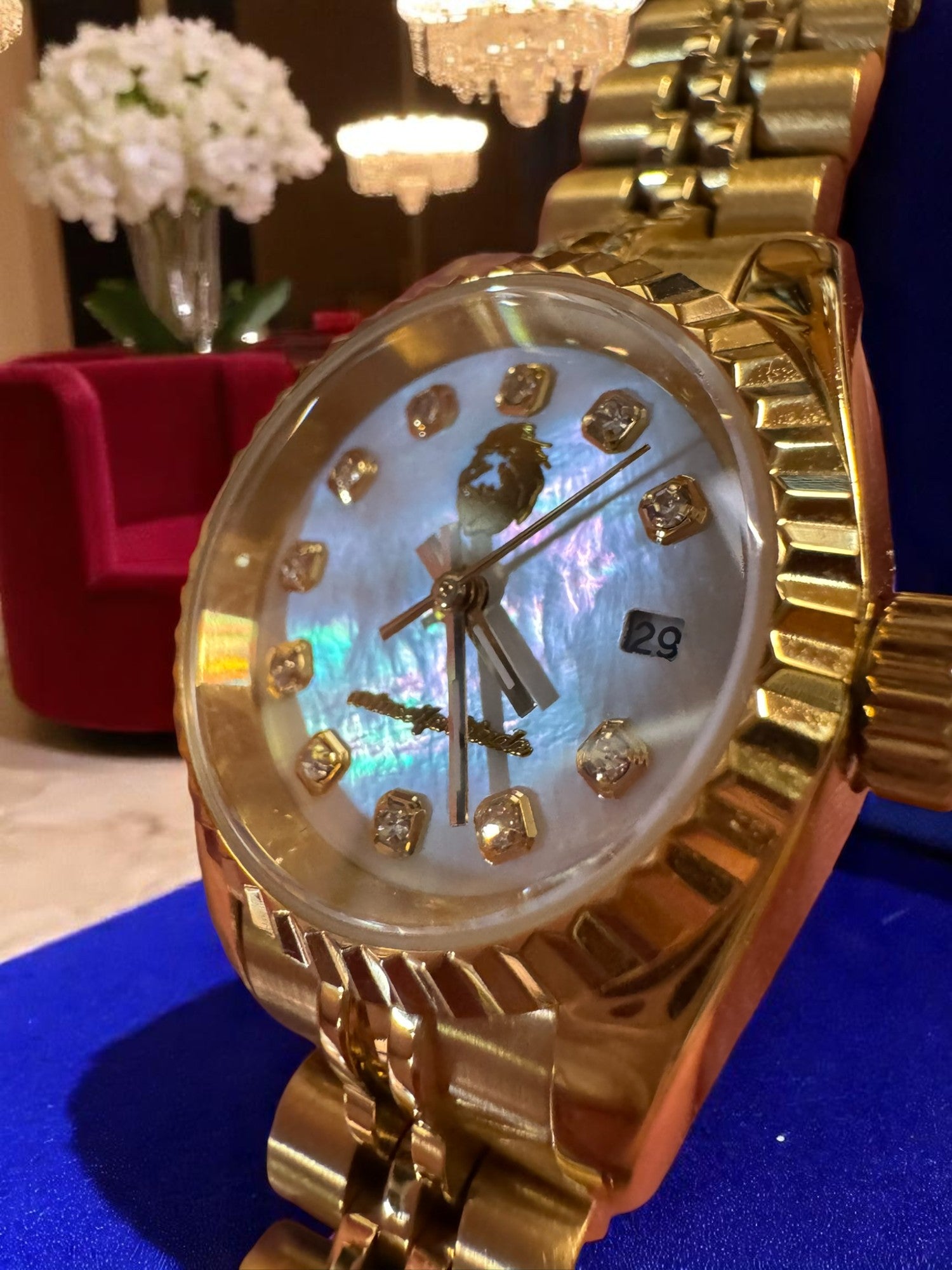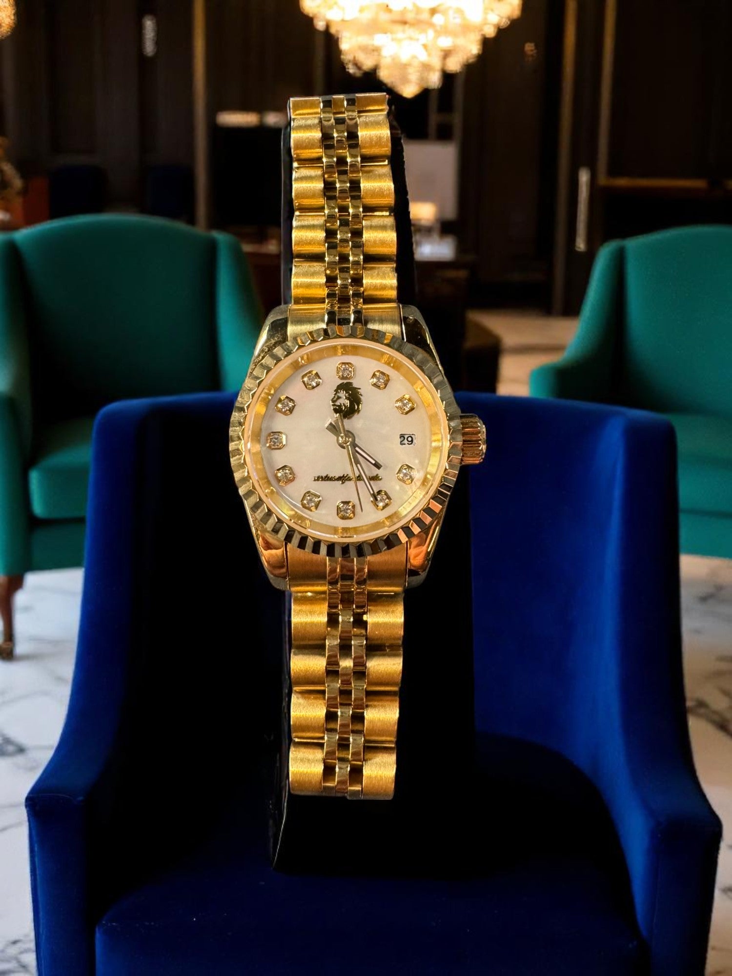 The Stoic Grace is a timeless tribute to elegance and inner strength. Crafted for women who embody resilience and refinement, this timepiece features a radiant mother-of-pearl dial adorned with twelve brilliant-cut crystal hour markers. The polished gold-tone case and Jubilee-style bracelet deliver both opulence and comfort, while the fluted bezel adds a touch of classic sophistication.