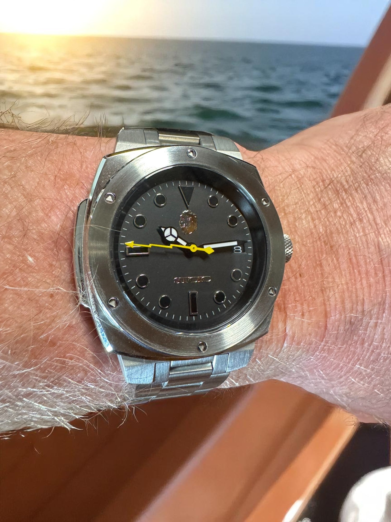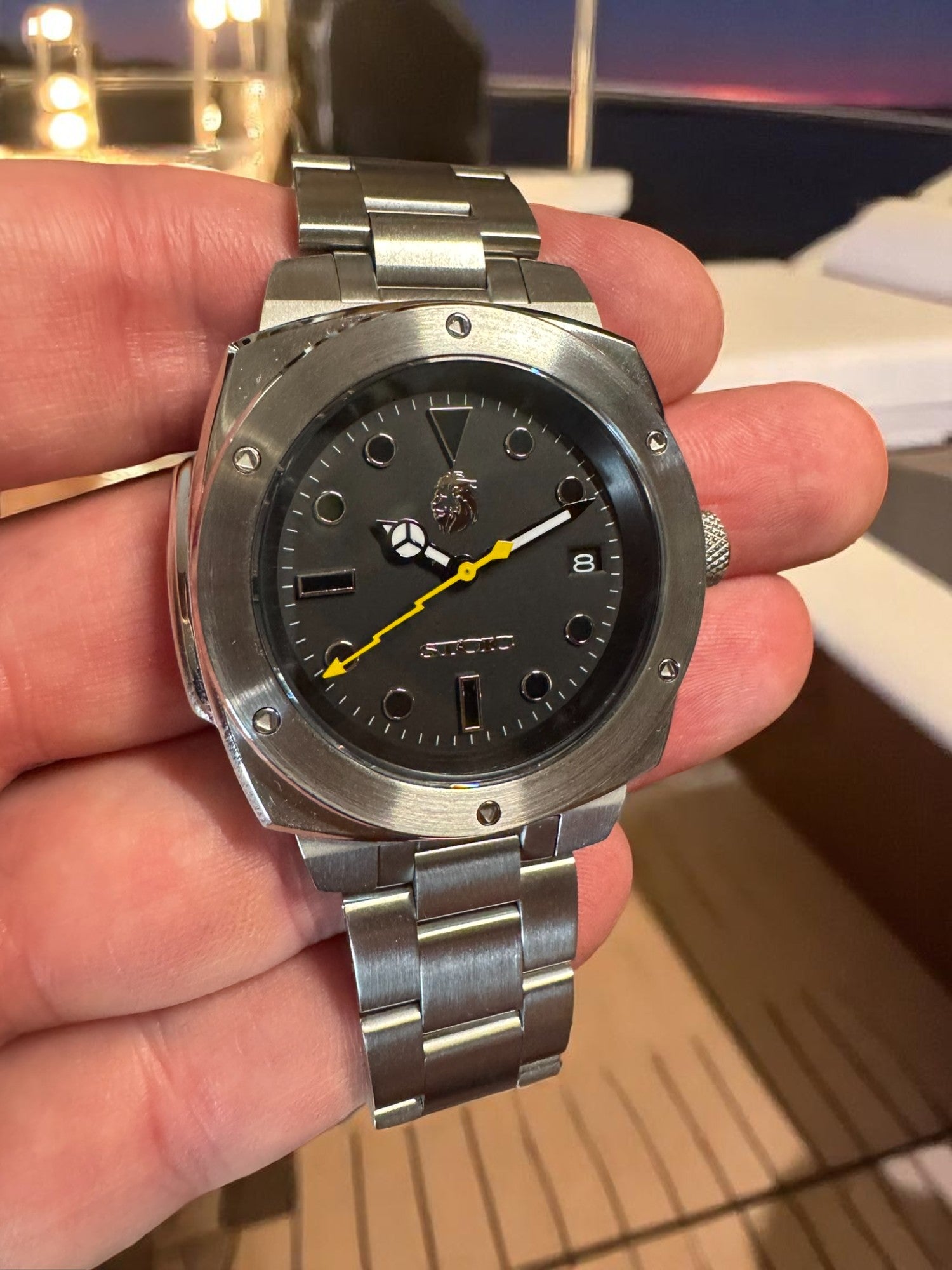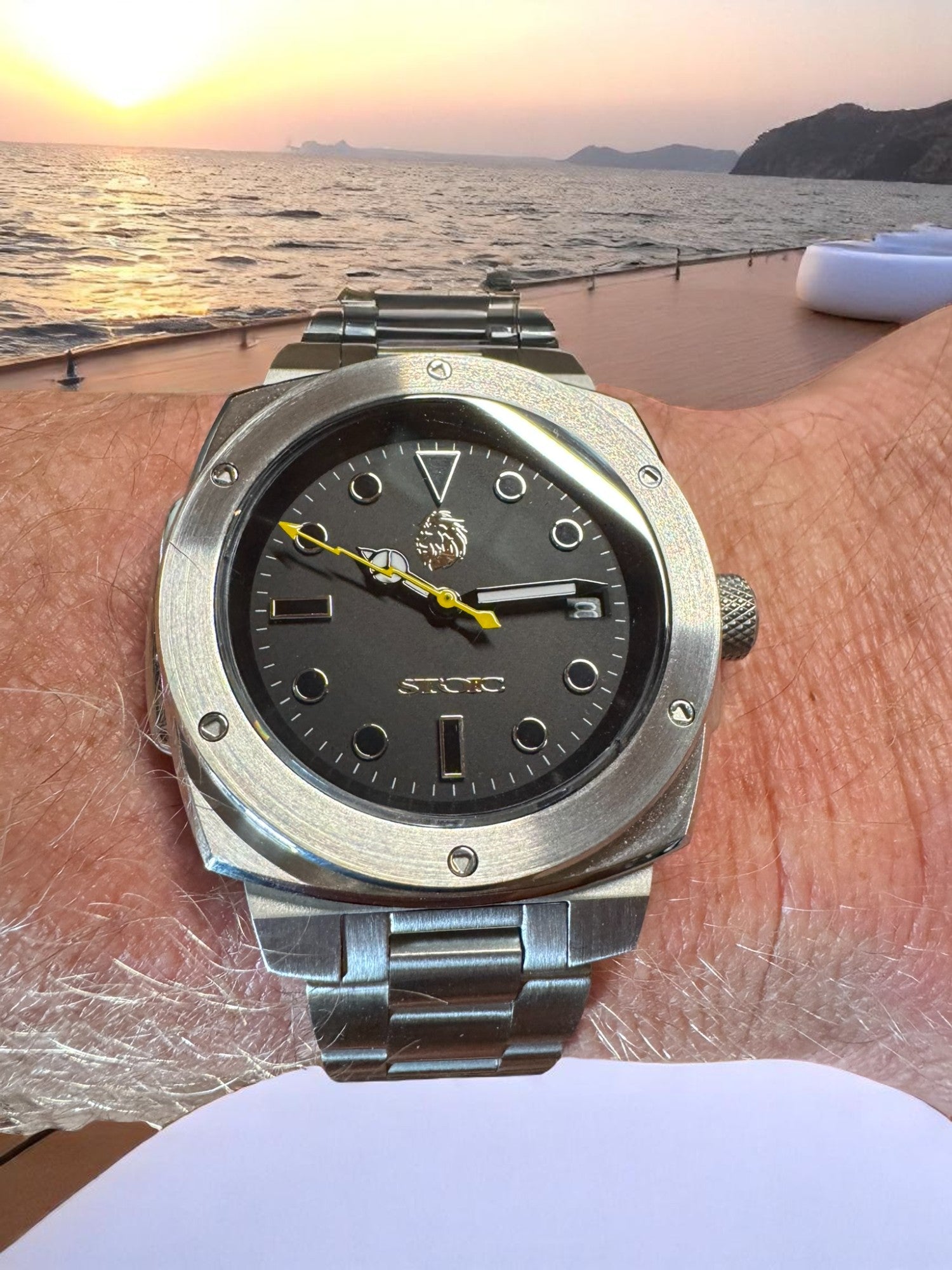 Its matte black dial is marked by minimalist indices and a bold yellow lightning-bolt seconds hand that cuts across the darkness—symbolizing speed, clarity, and decisive action. The unique hour hand is engraved with the Stoic lion, a reminder of inner strength.