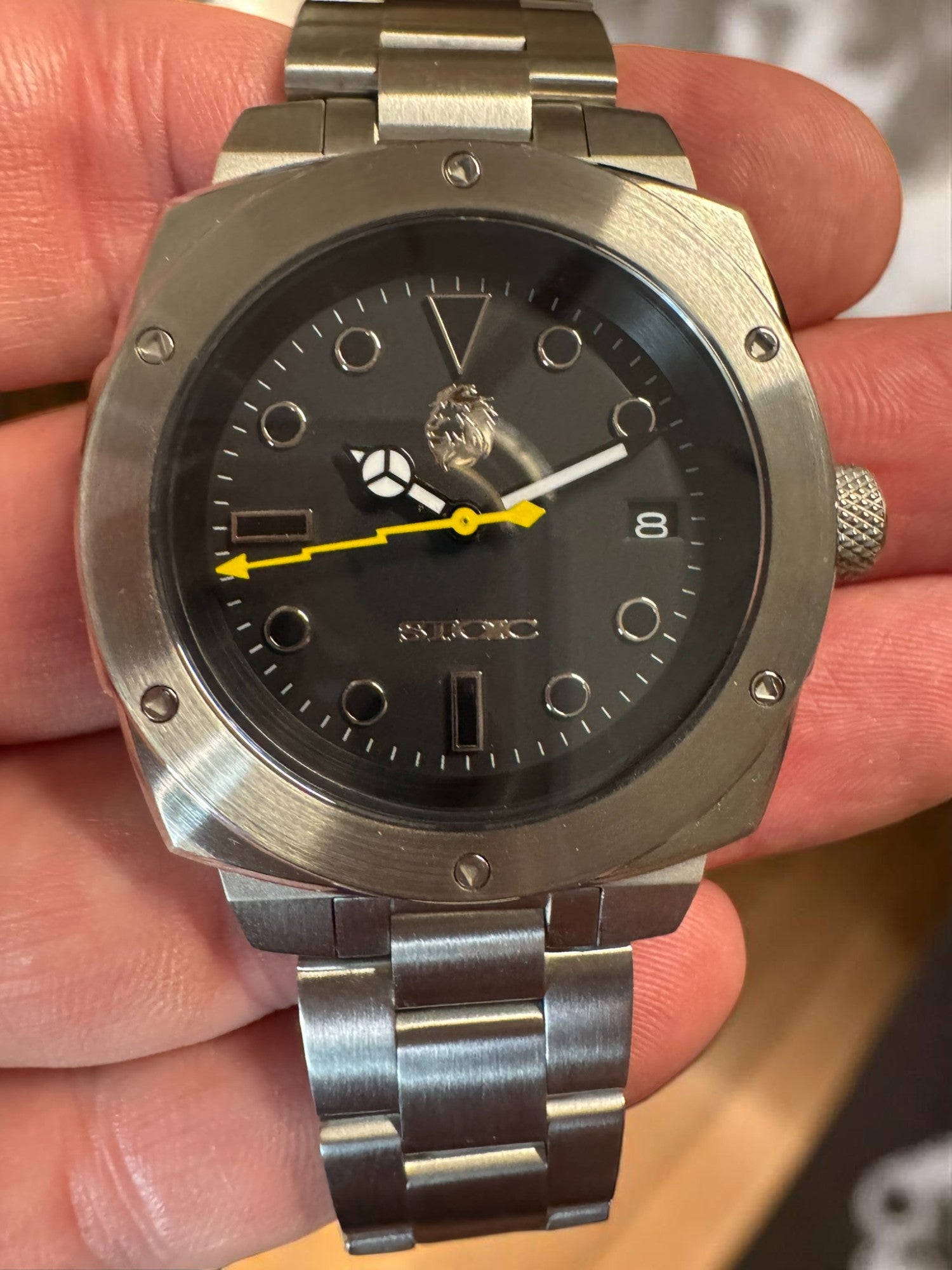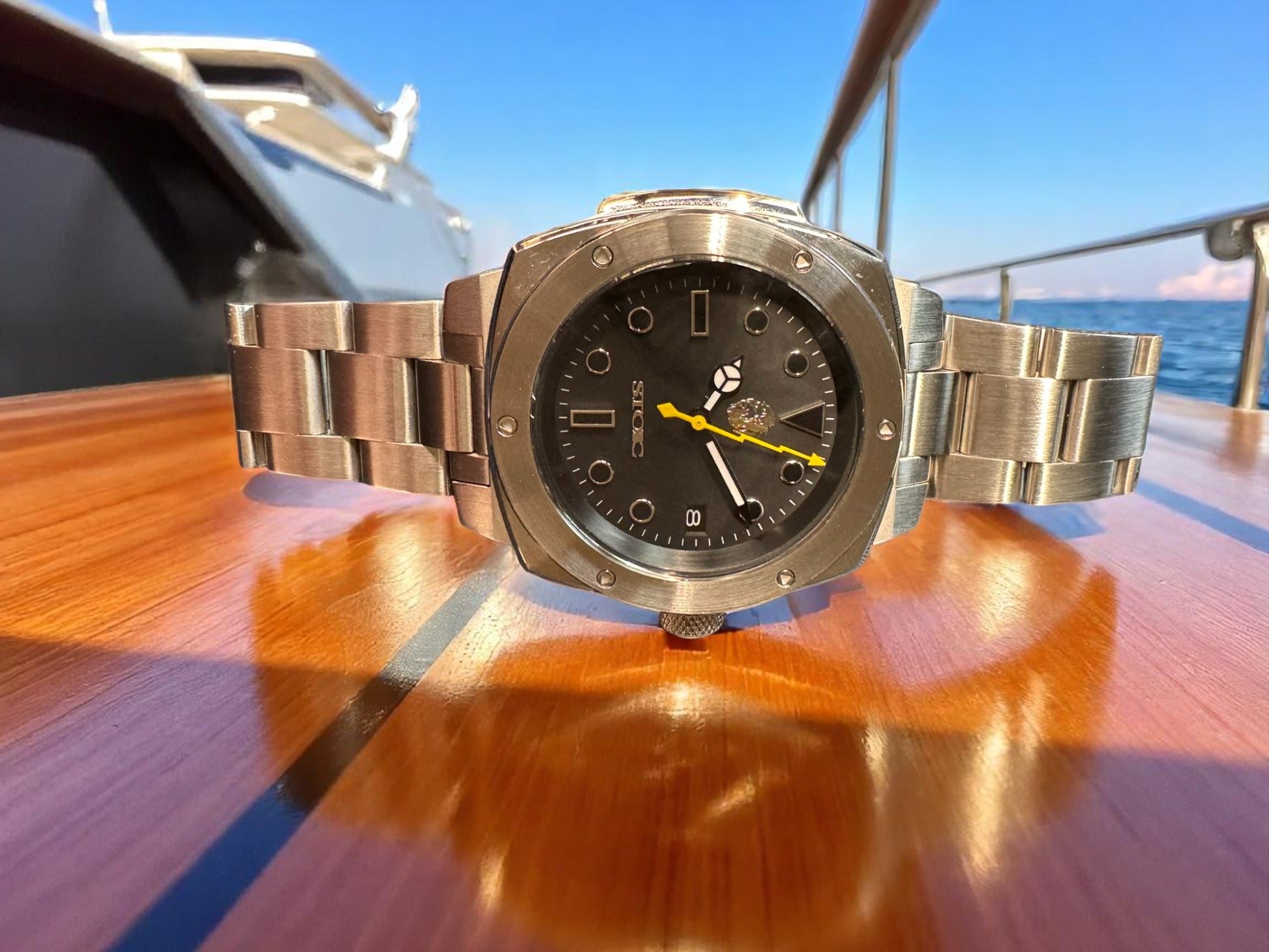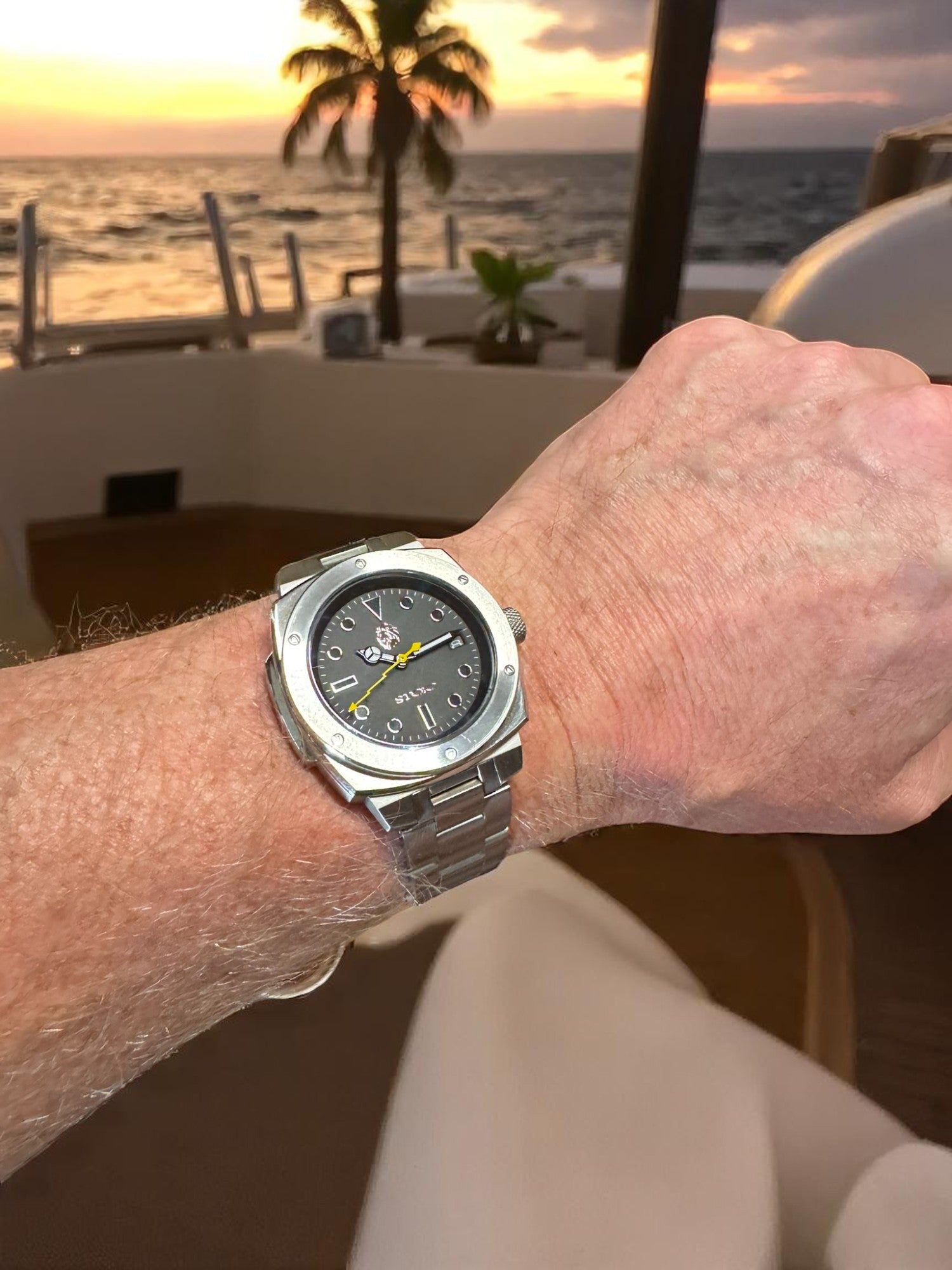 Its matte black dial is marked by minimalist indices and a bold yellow lightning-bolt seconds hand that cuts across the darkness—symbolizing speed, clarity, and decisive action. The unique hour hand is engraved with the Stoic lion, a reminder of inner strength.