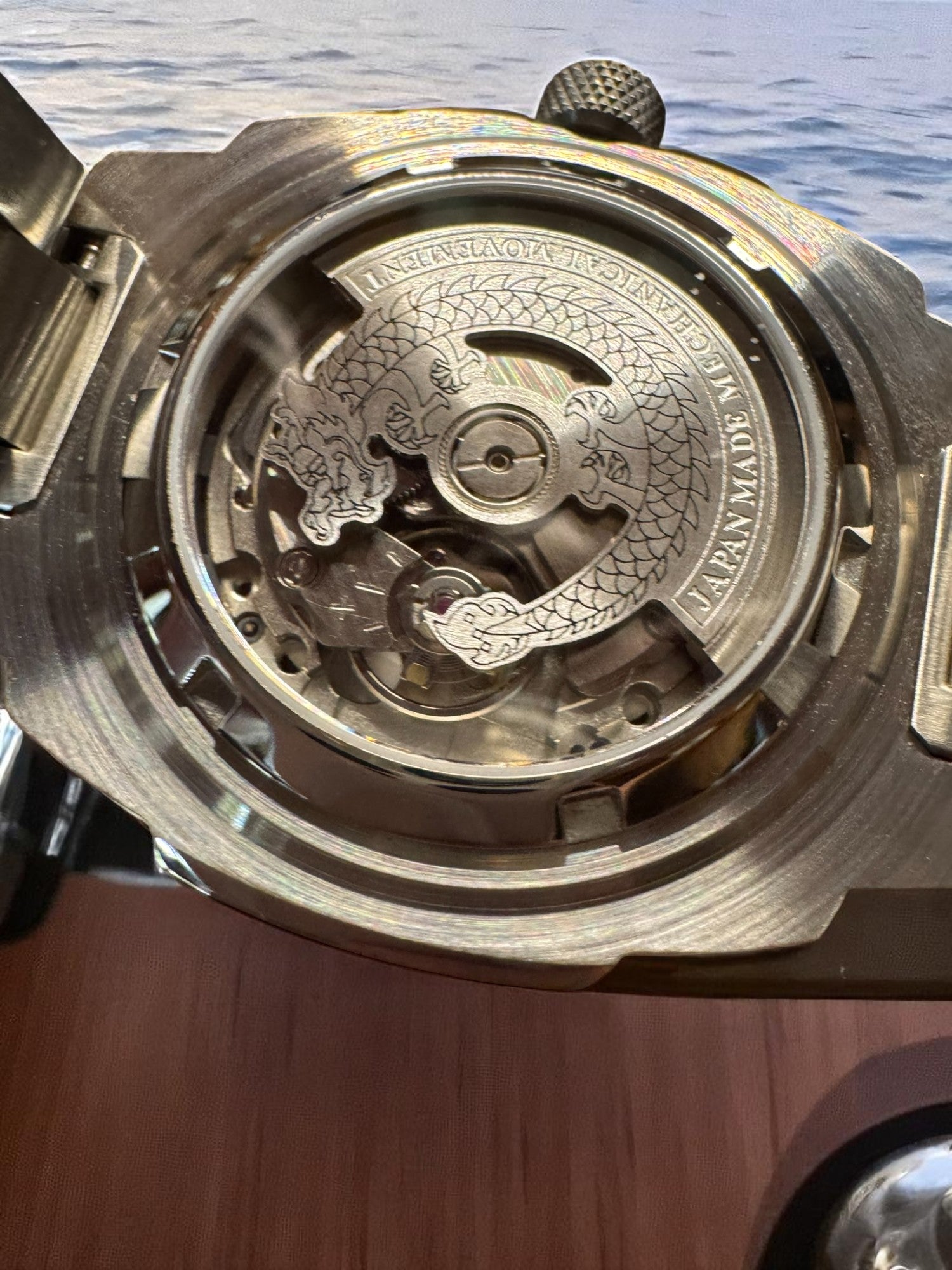 Turn the watch over to reveal the engraved Japanese automatic movement, powered by a custom rotor bearing a coiled Eastern dragon—representing the harmony of control and chaos. Every tick is a testament to mastery through struggle.