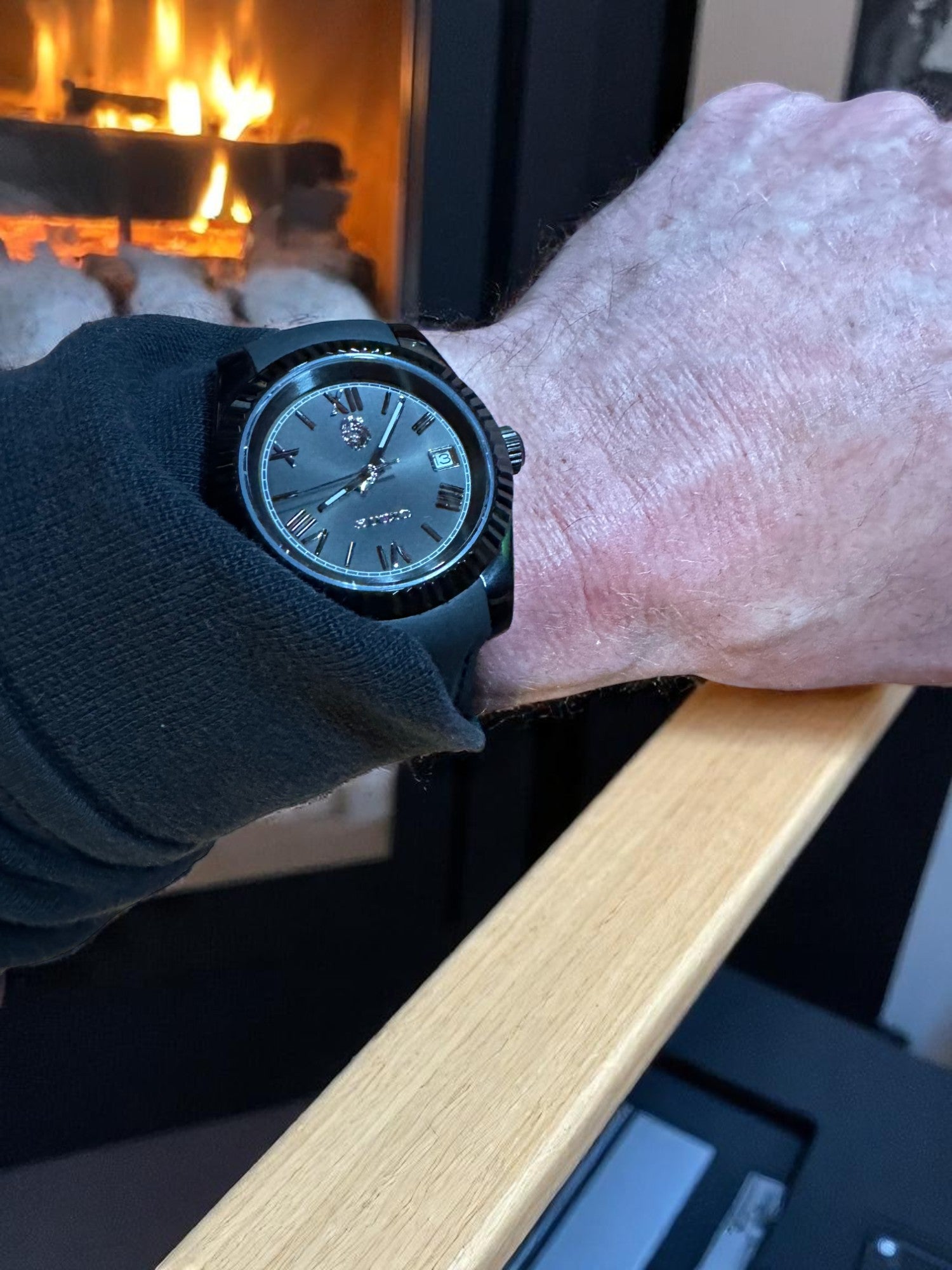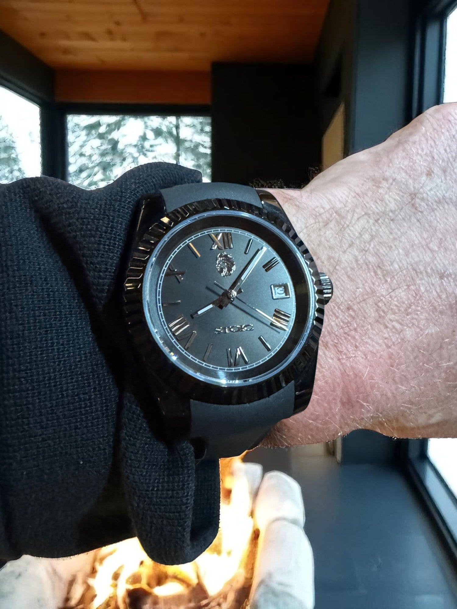 The Umbra is darkness refined—a modern Stoic statement that proves restraint is its own kind of luxury. With a matte black case, fluted bezel, and sunburst charcoal dial, this timepiece channels the power of subtlety. Roman numerals and minimalist hands keep the focus sharp, while the date window quietly tracks the march of time.