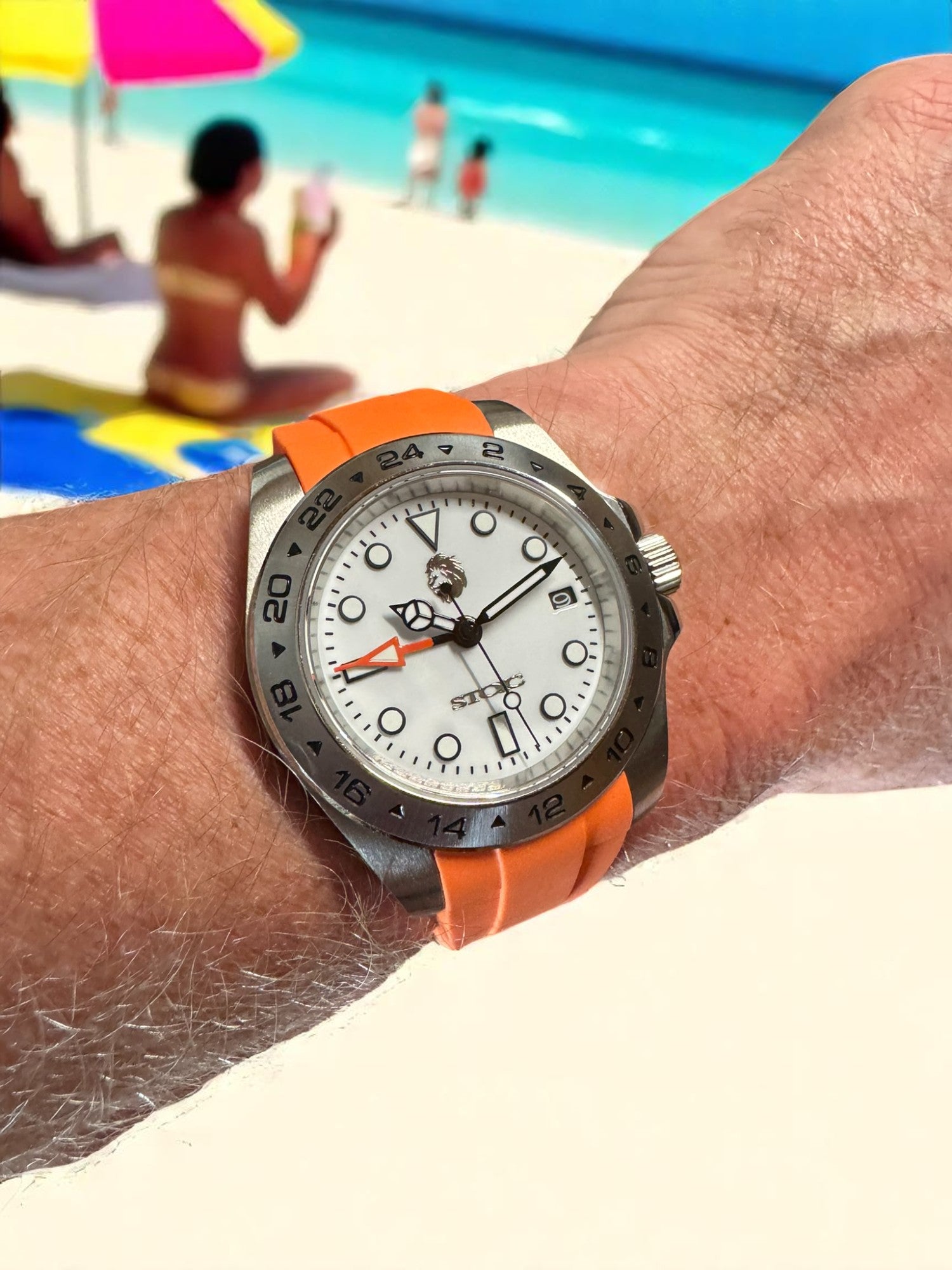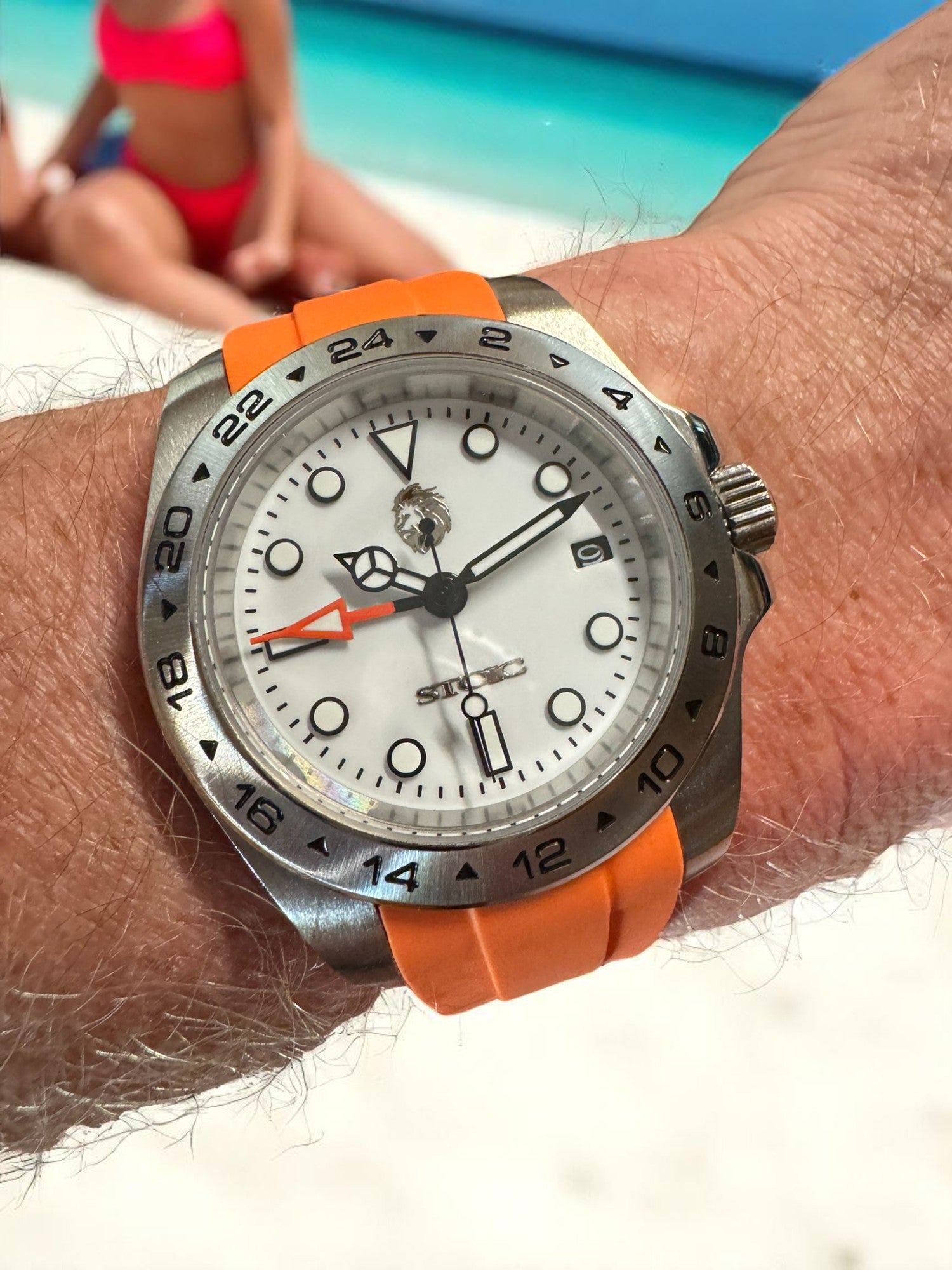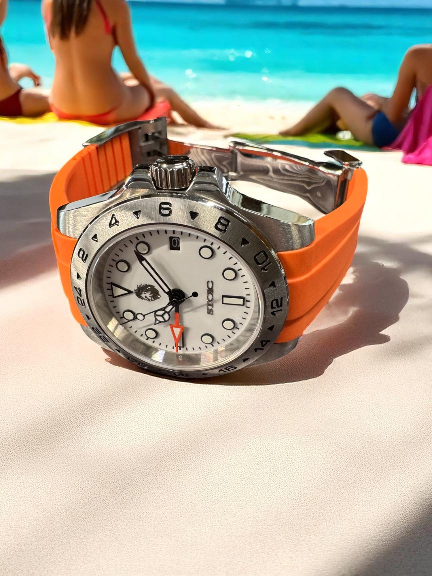 Built for those who live by intention, The Navigator is more than a watch—it’s a statement of discipline and direction. Featuring a brushed stainless steel case, stark white dial, and vivid orange rubber strap, this GMT diver delivers function without compromise. The black 24-hour bezel allows precise tracking of multiple time zones, while the screw-down crown ensures reliability wherever you roam.