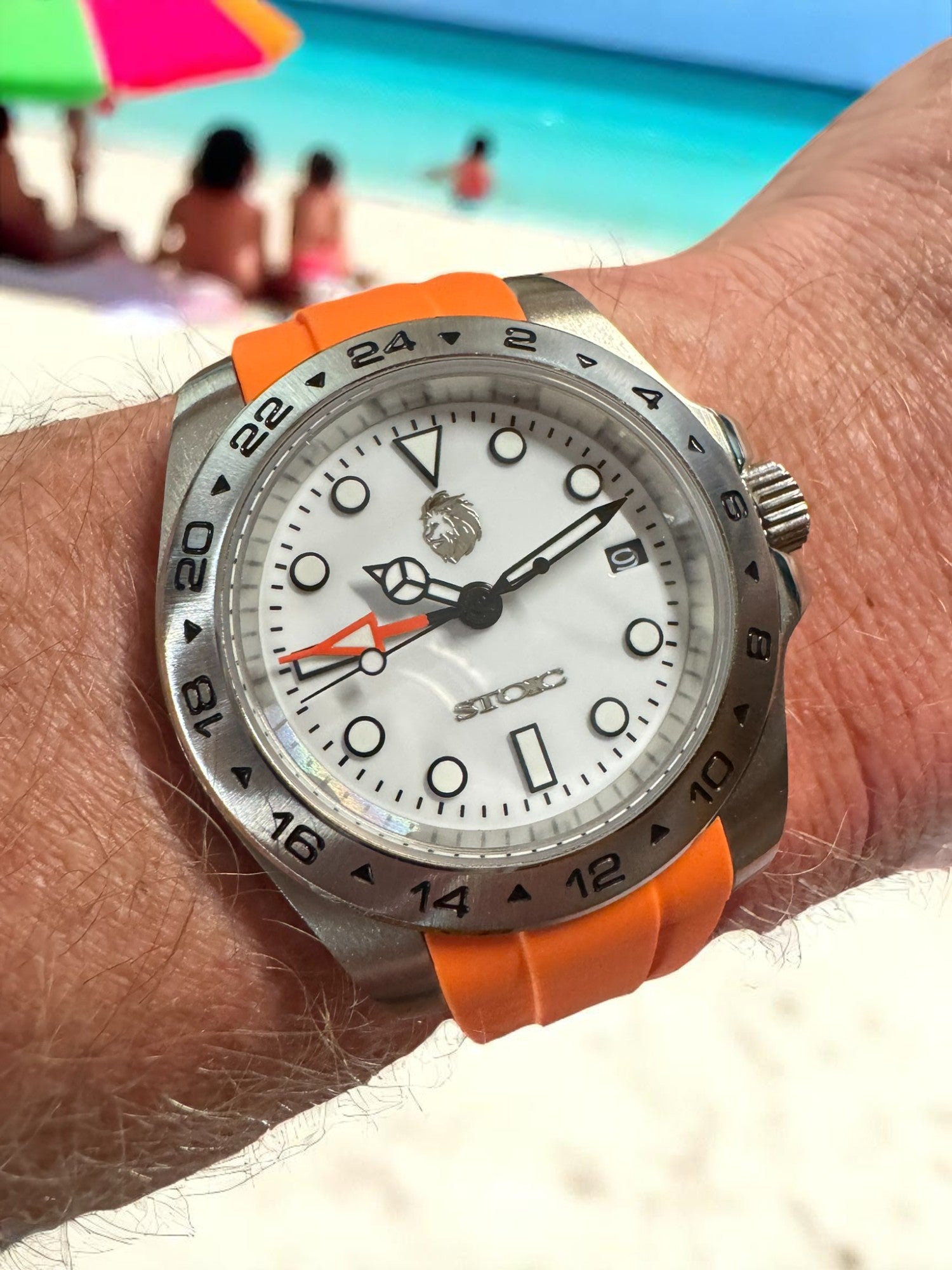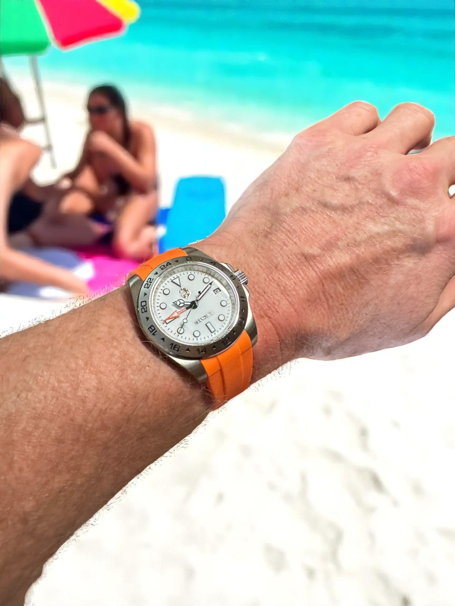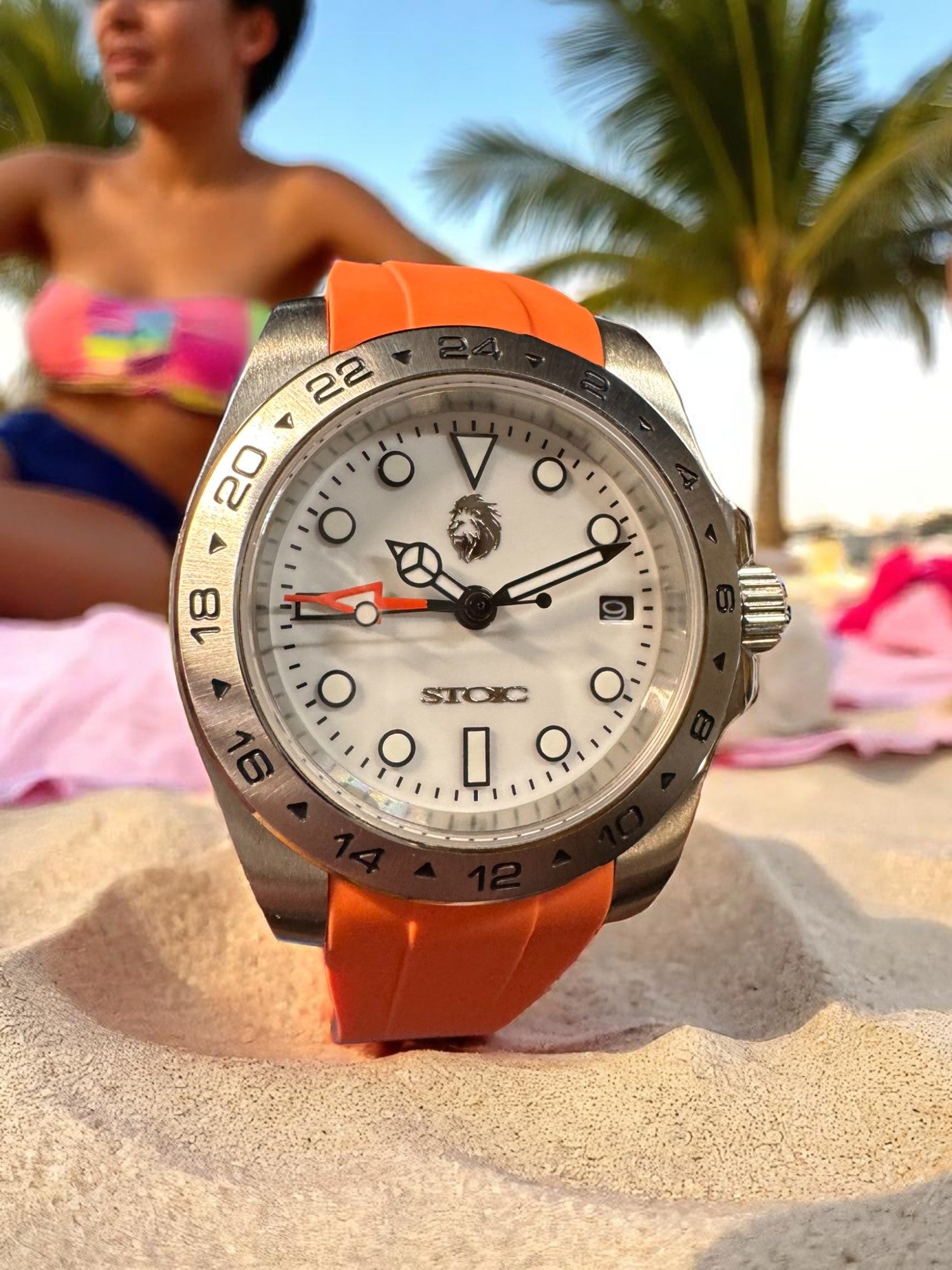 Built for those who live by intention, The Navigator is more than a watch—it’s a statement of discipline and direction. Featuring a brushed stainless steel case, stark white dial, and vivid orange rubber strap, this GMT diver delivers function without compromise. The black 24-hour bezel allows precise tracking of multiple time zones, while the screw-down crown ensures reliability wherever you roam.