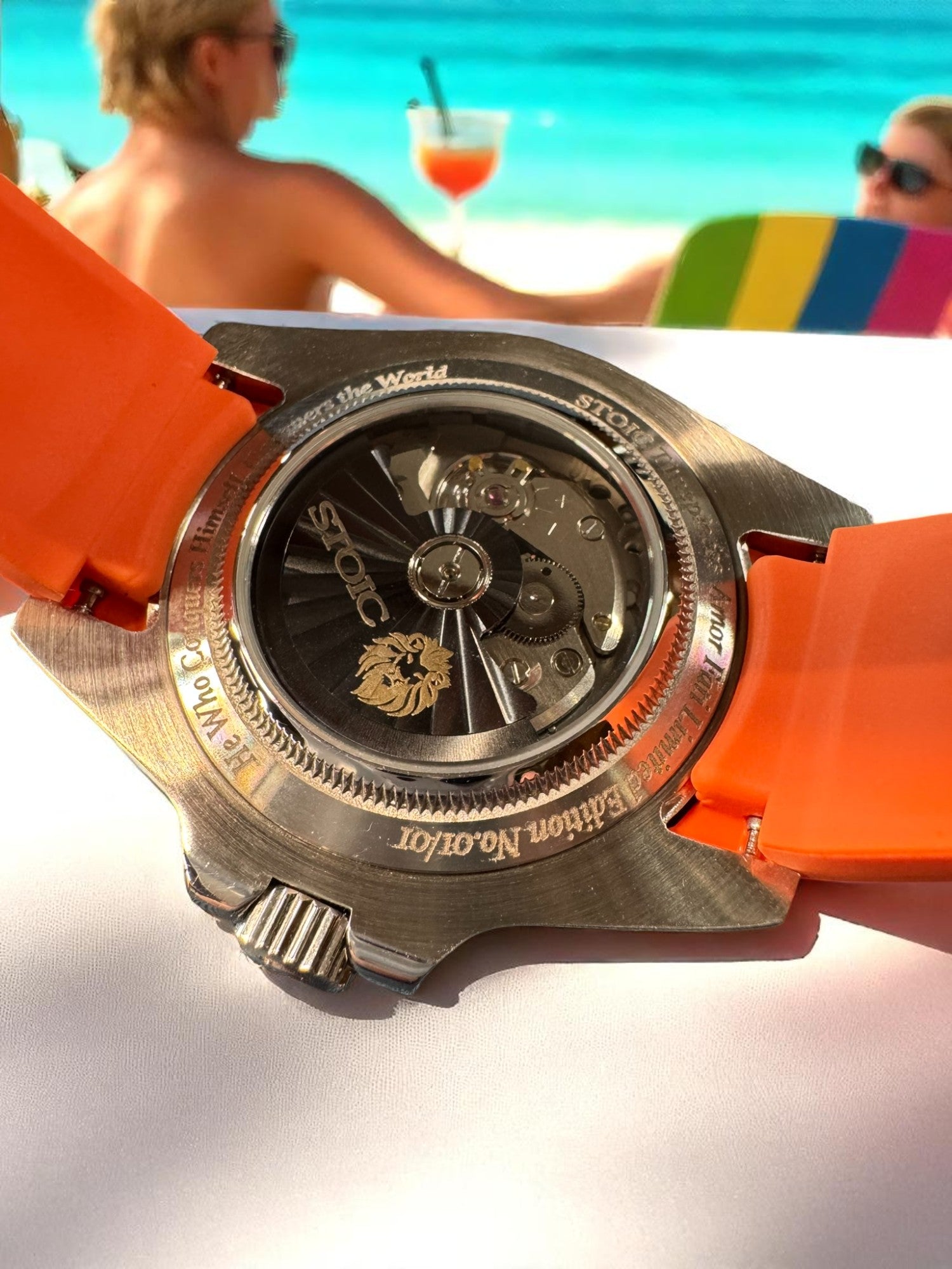 The caseback reveals a custom-engraved automatic movement through sapphire glass, inscribed with the Stoic maxim: