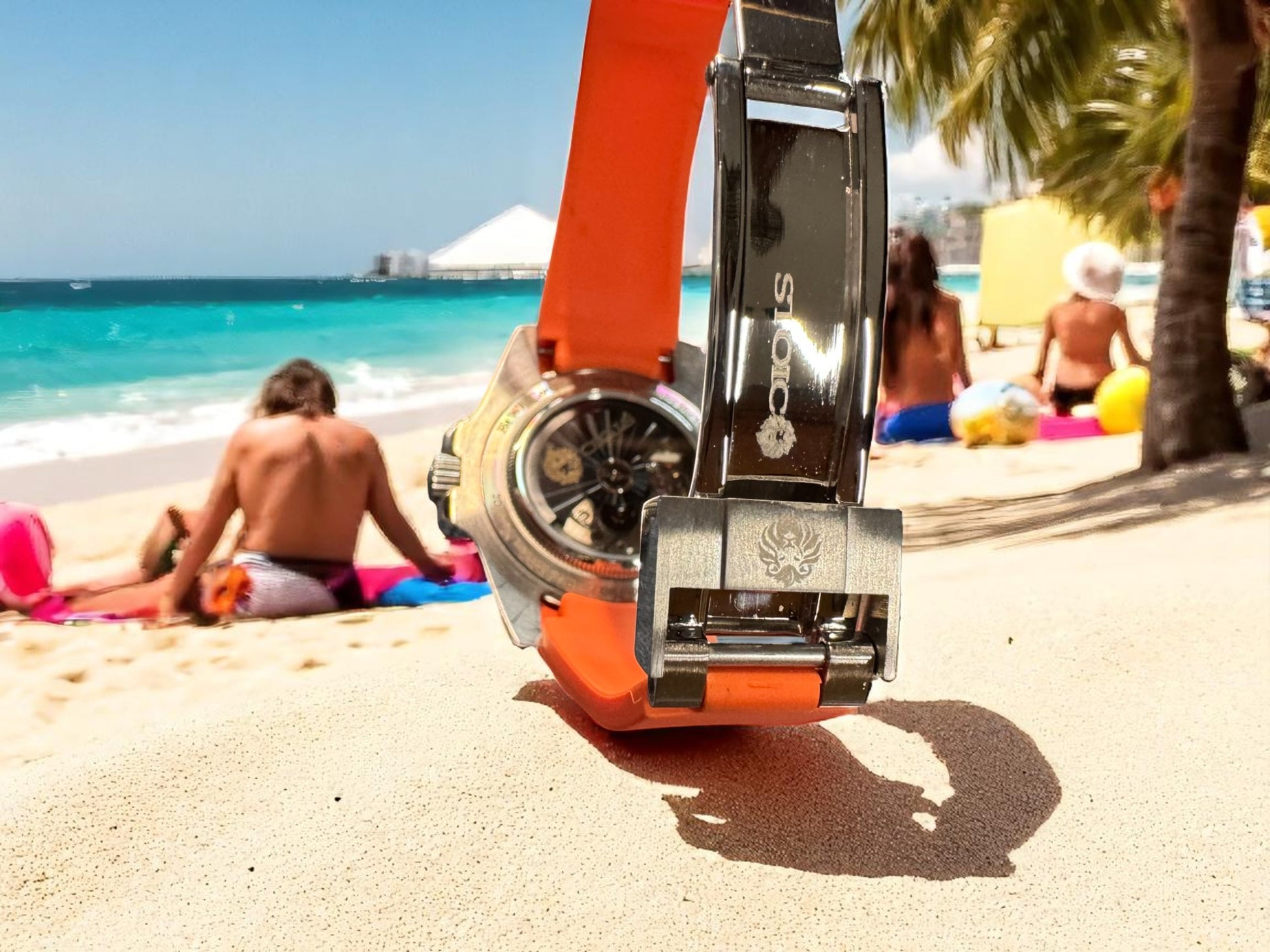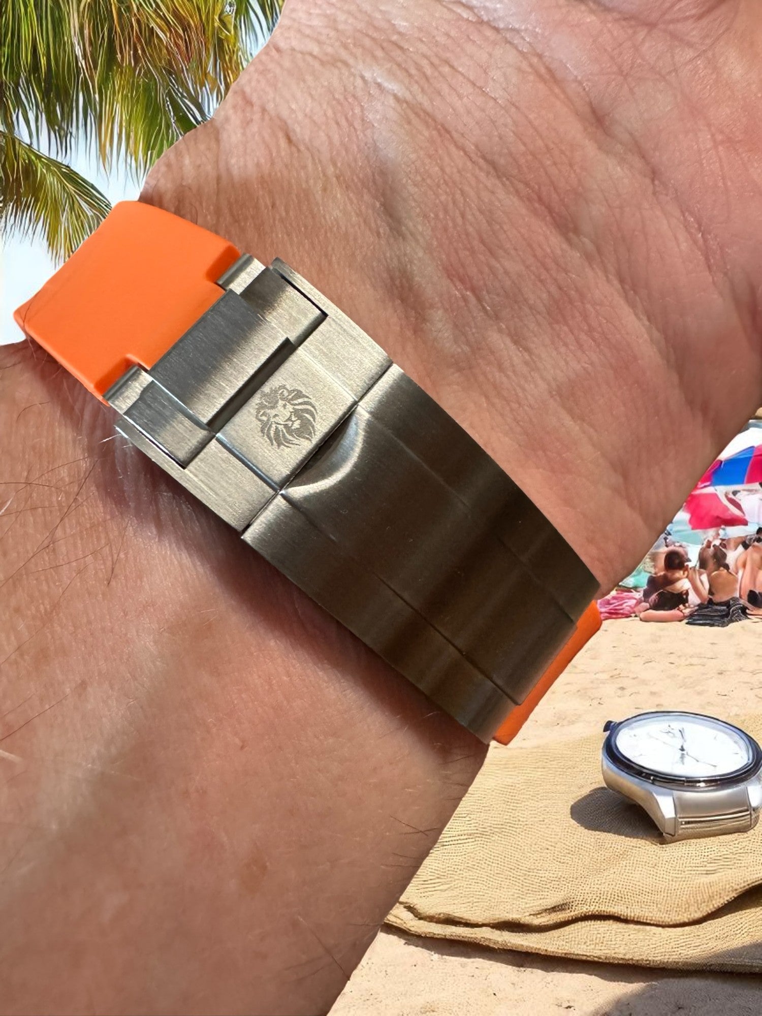 Strap: Orange FKM rubber strap with engraved deployant clasp
